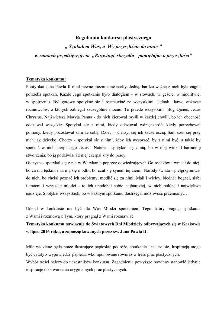 Regulamin konkursu plastycznego „ Szukałem Was, a Wy przyszliście do mnie ” w ramach przedsięwzięcia „Rozwinąć skrzydła - pamiętając o przeszłości” Tematyka konkursu: Pontyfikat Jana Pawła II miał pewne niezmienne cechy. Jedną, bardzo ważną z nich była ciągła potrzeba spotkań. Każde Jego spotkanie było dialogiem - w słowach, w geście, w modlitwie, w spojrzeniu. Był gotowy spotykać się i rozmawiać ze wszystkimi. Jednak łatwo wskazać rozmówców, o których zabiegał szczególnie mocno. To przede wszystkim Bóg Ojciec, Jezus Chrystus, Najświętsza Maryja Panna - do nich kierował myśli w każdej chwili, bo ich obecność odczuwał wszędzie. Spotykał się z nimi, kiedy odczuwał wdzięczność, kiedy potrzebował pomocy, kiedy pozostawał sam ze sobą. Dzieci - cieszył się ich szczerością. Sam czuł się przy nich jak dziecko. Chorzy - spotykał się z nimi, żeby ich wesprzeć, by z nimi być, a także by spotkać w nich cierpiącego Jezusa. Natura - spotykał się z nią, bo w niej widział harmonię stworzenia, bo ją podziwiał i z niej czerpał siły do pracy. Ojczyzna- spotykał się z nią w Watykanie poprzez odwiedzających Go rodaków i wracał do niej, bo za nią tęsknił i za nią się modlił, bo czuł się synem tej ziemi. Narody świata - pielgrzymował do nich, bo chciał poznać ich problemy, modlić się za nimi. Mali i wielcy, biedni i bogaci, słabi i mocni i wreszcie młodzi - to ich upodobał sobie najbardziej, w nich pokładał największe nadzieje. Spotykał wszystkich, bo w każdym spotkaniu dostrzegał możliwość przemiany… Udział w konkursie ma być dla Was Młodzi spotkaniem Tego, który pragnął spotkania z Wami i rozmową z Tym, który pragnął z Wami rozmawiać. Tematyka konkursu nawiązuje do Światowych Dni Młodzieży odbywających się w Krakowie w lipcu 2016 roku, a zapoczątkowanych przez św. Jana Pawła II. Mile widziane będą prace ilustrujące papieskie podróże, spotkania i nauczanie. Inspiracją mogą być cytaty z wypowiedzi papieża, wkomponowane również w treść prac plastycznych. Wybór treści należy do uczestników konkursu. Zagadnienia powyższe powinny stanowić jedynie inspirację do stworzenia oryginalnych prac plastycznych. Organizator: Zespół Szkół w Łużnej Cele konkursu: Upamiętnienie i pogłębianie wiedzy o życiu, działalności i osobowości papieża św. Jana Pawła II; Wychowywanie w duchu szacunku dla wartości chrześcijańskich, narodowych i rodzinnych; Poznawanie, utrwalanie i przechowywanie ponadczasowych tradycji kulturowych; Rozwijanie wrażliwości artystycznej dzieci i młodzieży; Promowanie młodych talentów; Rozwijanie umiejętności partnerskiej rywalizacji; Wymiana doświadczeń estetycznych, metodycznych i plastycznych; Integracja uczniów i nauczycieli wokół cennego daru, jakim było dla nas życie Papieża Polaka. Warunki uczestnictwa: Konkurs adresowany jest do uczniów szkół gimnazjalnych z terenu powiatu: gorlickiego, nowosądeckiego i tarnowskiego. Prace mogą być wykonane indywidualnie i samodzielnie dowolną płaską techniką plastyczną (rysunek, malarstwo, wycinanka, wydzieranka, grafika, batik, malarstwo na szkle, tkanina, technika mieszana, mozaika, kolaż, komiks, itp.). Każdy uczestnik, może wykonać tylko jedną pracę. Format prac: Minimum: A3 (297x420) Maksimum: A1 (500x700) Każda praca powinna posiadać na odwrotnej stronie czytelną informację wykonaną pismem drukowanym według wzoru: Imię i nazwisko autora Wiek autora Nazwa i adres placówki Imię i nazwisko opiekuna Nadesłane na konkurs prace muszą być zabezpieczone przed uszkodzeniem. Nie jest wymagana oprawa prac (wyjątek stanowią grafika, malarstwo na szkle). Każda szkoła może dostarczyć maksymalnie 5 prac, dlatego należy we własnym zakresie dokonać wcześniejszego wyboru prac na etapie szkolnym. Termin nadsyłania prac: Prace wykonane zgodnie z regulaminem należy przekazać lub przesłać do organizatora do dnia 8 kwietnia 2016 r. na adres: Zespół Szkół w Łużnej 38-322 Łużna 723 Z dopiskiem „Konkurs plastyczny” - Gimnazjum Do przesyłki należy dołączyć listę zbiorczą autorów prac opatrzoną pieczęcią szkoły. Ocena Prac: Komisja konkursowa powołana przez organizatora dokona oceny prac według przyjętych kryteriów w dniu 29 kwietnia 2016 r. przyznając nagrody i wyróżnienia oraz kwalifikując prace na wystawę pokonkursową. Ogłoszenie wyników: Ogłoszenie wyników nastąpi drogą elektroniczną, a wręczenie nagród i otwarcie wystawy odbędzie się 5 czerwca 2016 r. o godzinie 17.00 w Gminnym Ośrodku Kultury w Łużnej podczas Uroczystej Gali, o której laureaci zostaną powiadomieni odrębnym pismem. Laureaci otrzymają nagrody oraz pamiątkowe dyplomy. Pozostali uczniowie otrzymają pamiątkowe dyplomy uczestnictwa. Uwagi końcowe: Prace konkursowe przechodzą na własność organizatora. Organizator nie wysyła nagród i dyplomów, można je odebrać osobiście do 20 czerwca 2016 r. w siedzibie placówki. Organizator konkursu zastrzega sobie prawo do bezpłatnej prezentacji i publikacji prac. Uczestnictwo w konkursie jest jednoznaczne z wyrażeniem zgody na przetwarzanie danych osobowych przez organizatora konkursu w celach wynikających z regulaminu tego konkursu, zgodnie z Ustawą z dnia 29 sierpnia 1997 r. o ochronie danych osobowych /Dz. U. 1997 nr 133 poz. 883 z późn. zm./. Do 15.12.2015 r. należy przesłać formularz zgłoszeniowy szkoły (może to być jeden formularz zbiorowy dotyczący informacji o przystąpieniu szkoły do wszystkich konkursów w ramach przedsięwzięcia) na adres mailowy: [email protected] Do dnia 31 marca 2016 r. należy przesłać na powyższy adres imienne zgłoszenia uczniów. Dodatkowych informacji udziela mgr Marta Gierałt – koordynator konkursu – tel. 18 35 43 390.