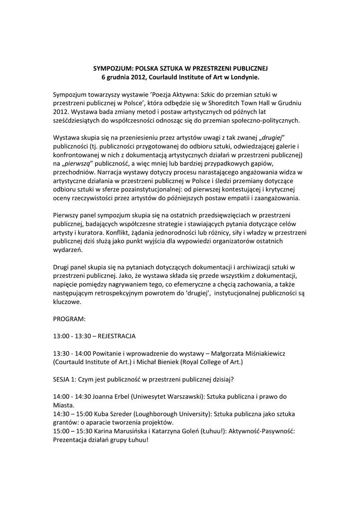 SYMPOZJUM: POLSKA SZTUKA W PRZESTRZENI PUBLICZNEJ 6 grudnia 2012, Courlauld Institute of Art w Londynie. Sympozjum towarzyszy wystawie ‘Poezja Aktywna: Szkic do przemian sztuki w przestrzeni publicznej w Polsce’, która odbędzie się w Shoreditch Town Hall w Grudniu 2012. Wystawa bada zmiany metod i postaw artystycznych od późnych lat sześćdziesiątych do współczesności odnosząc się do przemian społeczno-politycznych. Wystawa skupia się na przeniesieniu przez artystów uwagi z tak zwanej „drugiej” publiczności (tj. publiczności przygotowanej do odbioru sztuki, odwiedzającej galerie i konfrontowanej w nich z dokumentacją artystycznych działań w przestrzeni publicznej) na „pierwszą” publiczność, a więc mniej lub bardziej przypadkowych gapiów, przechodniów. Narracja wystawy dotyczy procesu narastającego angażowania widza w artystyczne działania w przestrzeni publicznej w Polsce i śledzi przemiany dotyczące odbioru sztuki w sferze pozainstytucjonalnej: od pierwszej kontestującej i krytycznej oceny rzeczywistości przez artystów do późniejszych postaw empatii i zaangażowania. Pierwszy panel sympozjum skupia się na ostatnich przedsięwzięciach w przestrzeni publicznej, badających współczesne strategie i stawiających pytania dotyczące celów artysty i kuratora. Konflikt, żądania jednorodności lub różnicy, siły i władzy w przestrzeni publicznej dziś służą jako punkt wyjścia dla wypowiedzi organizatorów ostatnich wydarzeń. Drugi panel skupia się na pytaniach dotyczących dokumentacji i archiwizacji sztuki w przestrzeni publicznej. Jako, że wystawa składa się przede wszystkim z dokumentacji, napięcie pomiędzy nagrywaniem tego, co efemeryczne a chęcią zachowania, a także następującym retrospekcyjnym powrotem do ‘drugiej’, instytucjonalnej publiczności są kluczowe. PROGRAM: 13:00 - 13:30 – REJESTRACJA 13:30 - 14:00 Powitanie i wprowadzenie do wystawy – Małgorzata Miśniakiewicz (Courtauld Institute of Art.) i Michał Bieniek (Royal College of Art.) SESJA 1: Czym jest publiczność w przestrzeni publicznej dzisiaj? 14:00 - 14:30 Joanna Erbel (Uniwesytet Warszawski): Sztuka publiczna i prawo do Miasta. 14:30 – 15:00 Kuba Szreder (Loughborough University): Sztuka publiczna jako sztuka grantów: o aparacie tworzenia projektów. 15:00 – 15:30 Karina Marusińska i Katarzyna Goleń (Łuhuu!): Aktywność-Pasywność: Prezentacja działań grupy Łuhuu! 15:30-16:00 Przerwa na kawę SESJA 2: Na przestrzeni dekad: sztuka w przestrzeni publicznej i jej Dokumentacja 16:00 – 16:30 Sylwia Serafinowicz (Courtauld Institute of Art): Fotografowie, widzowie, twórcy znaczenia na plenerach w Osiekach. 16:30-17:00 Gavin Grindon (Kingston University): Socjalistyczny Surrealizm Pomarańczowej Alternatywy i kwestionowana spuścizna radykalnej awangardy. 17:00 – 18:00 Dyskusja panelowa. 18:30 – Wszyscy uczestnicy zaproszeni są na wernisaż wystawy „Aktywna Poezja” w Shoreditch Town Hall (380 Old Street, London, EC1V 9LT).