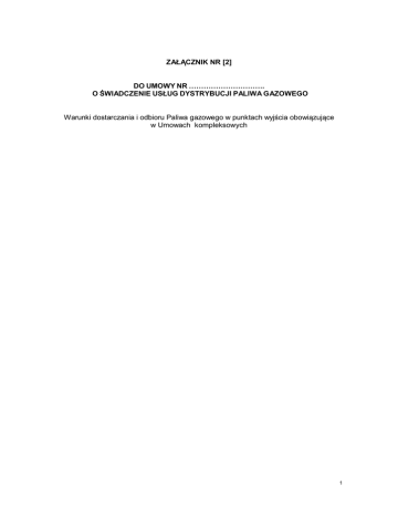 ZAŁĄCZNIK NR [2] DO UMOWY NR …………………………. O ŚWIADCZENIE USŁUG DYSTRYBUCJI PALIWA GAZOWEGO Warunki dostarczania i odbioru Paliwa gazowego w punktach wyjścia obowiązujące w Umowach kompleksowych 1 1. ZUD w zawieranych umowach kompleksowych z Odbiorcami umieści odpowiednie postanowienia umożliwiające OSD świadczenie usług Dystrybucji Paliwa gazowego do Odbiorcy dotyczące: 1.1. Wskazania praw i obowiązków Odbiorców wynikających z zapisów aktualnej Instrukcji Ruchu i Eksploatacji Sieci Dystrybucyjnej (IRiESD). 1.2. Wyrażenia zgody przez Odbiorcę na gromadzenie i przetwarzanie jego danych osobowych przez OSD w związku z dokonywaniem odczytów i kontroli Układów pomiarowych. 1.3. Uprawnienia OSD do przeprowadzania kontroli Układów pomiarowych zgodnie z odrębnymi regulacjami prawnymi. 1.4. Praw własności OSD do Układów pomiarowych oraz telemetrycznych zamontowanych u Odbiorcy. 1.5. Uprawnienia OSD do zainstalowania układów telemetrii. 1.6. Terminu rozpoczęcia odbioru Paliwa gazowego przez Odbiorcę, w tym zainstalowania przez OSD Układu pomiarowego. 1.7. Zobowiązania Odbiorcy do zapewnienia upoważnionym przedstawicielom OSD: 1.7.1. dostępu do Układu pomiarowego oraz instalacji gazowej (za stan której odpowiada Odbiorca lub właściciel budynku) i urządzeń gazowych – w celu kontroli przestrzegania przez Odbiorcę postanowień Umowy kompleksowej, prawidłowości rozliczeń oraz dokonywania odczytów na zlecenie Sprzedawcy (ZUD), 1.7.2. dostępu do Układów pomiarowych, urządzeń do telemetrycznego przekazywania danych i elementów sieci gazowej znajdujących się na terenie Odbiorcy w celu wykonywania niezbędnych prac eksploatacyjnych lub zabezpieczających, 1.7.3. zdemontowania zainstalowanego u Odbiorcy Układu pomiarowego, w przypadku wstrzymania dostarczania Paliwa gazowego oraz wygaśnięcia lub rozwiązania, z jakiejkolwiek przyczyny Umowy kompleksowej, a także jego wydania przedstawicielom OSD, jeżeli Układ pomiarowy nie stanowi własności ZUD. 1.8. Zobowiązania Odbiorcy do poniesienia kosztów sprawdzenia działania Układu pomiarowego zainstalowanego u Odbiorcy oraz kosztów badania laboratoryjnego Układu pomiarowego, w tym jego demontażu oraz montażu w przypadku, kiedy na żądanie Odbiorcy, w wyniku badania laboratoryjnego nie stwierdzono nieprawidłowości w działaniu Układu pomiarowego. 1.9. Zobowiązania Odbiorcy do zabezpieczenia przed zniszczeniem lub uszkodzeniem Układu pomiarowego wskazującego wielkość poboru Paliwa gazowego i układu redukcji Paliwa gazowego, niedokonywania w nich jakichkolwiek zmian (z malowaniem włącznie), utrzymania w należytym stanie technicznym szafki przeznaczonej na te urządzenia oraz pokrycia w pełnej wysokości strat wynikających z ich uszkodzenia, zniszczenia lub utraty, chyba, że nastąpiło to z przyczyn, za które Odbiorca nie ponosi odpowiedzialności. 2 1.10. Zabezpieczenia przed zniszczeniem, uszkodzeniem lub zerwaniem wszelkich plomb znajdujących się na lub przy Układzie pomiarowym, a także innych plomb założonych przez producenta Układu pomiarowego, Sprzedawcę lub inny uprawniony organ. 1.11. Niezwłocznego informowania OSD o zauważonych wadach lub usterkach Układu pomiarowego, a także o stwierdzonych przerwach i zakłóceniach w dostarczaniu i odbiorze Paliwa gazowego. 1.12. W przypadku uniemożliwienia upoważnionemu przedstawicielowi OSD dokonania odczytu wskazań Układu pomiarowego, rozliczenia za dostarczone Paliwo gazowe dokonywane będą zgodnie z zasadami zawartymi w Taryfie oraz IRiESD. 1.13. Możliwości wstrzymania lub ograniczenia dostarczania Paliwa gazowego przez OSD, na zlecenie Sprzedawcy (ZUD), w przypadkach: 1.14. 1.15. 1.13.1. nieuregulowania przez Odbiorcę należności wynikających z Umowy, 1.13.2. uniemożliwienia przez Odbiorcę upoważnionym przedstawicielom OSD dostępu w sytuacji zagrożenia zdrowia, życia lub środowiska (wraz z niezbędnym sprzętem) do elementów sieci gazowej znajdujących się na terenie lub w obiekcie Odbiorcy, 1.13.3. 1.13.4. prowadzenia prac związanych z usuwaniem awarii i jej skutków, wykonywania planowych prac konserwacyjno-remontowych lub modernizacyjnych w zakresie sieci gazowej, Układów pomiarowych oraz prac związanych z przyłączaniem nowych Odbiorców do sieci gazowej lub prac przyłączeniowych w sieci gazowej. Wstrzymania dostarczania Paliwa gazowego przez OSD bez uprzedzenia Odbiorcy, w przypadkach: 1.14.1. samowolnego przyłączenia się Odbiorcy do sieci gazowej, 1.14.2. poboru przez Odbiorcę Paliwa gazowego z całkowitym lub częściowym pominięciem Układu pomiarowego, 1.14.3. dokonania zmian lub uszkodzeń w Układzie pomiarowym, 1.14.4. gdy instalacja gazowa lub sposób użytkowania Paliwa gazowego stwarza zagrożenie dla życia, zdrowia ludzi lub środowiska. 1.14.5. zaistnienia awarii w sieci gazowej stwarzającej zagrożenie dla życia lub zdrowia ludzi lub środowiska. Wskazania, uzgodnionego z Odbiorcą, okresu po upływie którego możliwe będzie wstrzymanie lub ograniczenie dostaw Paliwa gazowego do Odbiorcy, w sytuacji gdy niezwłoczne wstrzymanie lub ograniczenie dostarczania tego paliwa mogłoby powodować zagrożenie bezpieczeństwa życia, zdrowia lub środowiska, bądź uszkodzenie lub zniszczenie obiektów technologicznych Odbiorcy. 3