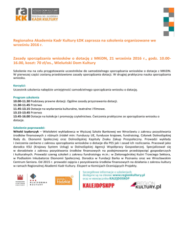 Regionalna Akademia Kadr Kultury ŁDK zaprasza na szkolenia organizowane we wrześniu 2016 r. Zasady sporządzania wniosków o dotację z MKiDN, 21 września 2016 r., godz. 10.0016.00, koszt: 70 zł/os., Wieluński Dom Kultury Szkolenie ma na celu przygotowanie uczestników do samodzielnego sporządzania wniosków o dotacje z MKiDN. W pierwszej części zostaną przedstawione zasady sporządzania dotacji. W drugiej praktyczna nauka sporządzania wniosku. Korzyści: Uczestnik szkolenia nabędzie umiejętność samodzielnego sporządzania wniosku o datację. Program szkolenia 10.00-11.30 Podstawy prawne dotacji. Ogólne zasady przyznawania dotacji. 11.30-11.45 Przerwa 11.45-13.15 Dotacje na wydarzenia kulturalne, teatralne i filmowe. 13.15-13.45 Przerwa 13.45-16.00 Dotacje na kolekcje i promocję czytelnictwa. Ćwiczenia praktyczne ze sporządzania wniosku o dotacje. Szkolenie poprowadzi: Witold Izydorczyk – Wieloletni wykładowca w Wyższej Szkole Bankowej we Wrocławiu z zakresu pozyskiwania środków finansowych z różnych źródeł min: Funduszy UE, fundusze krajowe, fundraising. Członek Dolnośląskiej Rady ds. Ekonomii Społecznej oraz Dolnośląskiej Kapituły Znaku Zakup Prospołeczny. Prowadzi wykłady i ćwiczenia zarówno z zakresu sporządzania wniosków o dotacje dla PES jak i zasad ich rozliczania. Pracował jako doradca KSU (Krajowy System Usług) w Dolnośląskiej Agencji Współpracy Gospodarczej. Specjalizował się w doradztwie z zakresu pozyskiwania środków finansowych na podejmowanie przedsięwzięć gospodarczych i kulturalnych. Prowadzi szereg szkoleń z zakresu fundraisingu m.in.: w Zielonogórskiej Kuźni Trzeciego Sektora, w Podlaskim Inkubatorze Ekonomii Społecznej. Doradca w Fundacji Barka w Poznaniu oraz we Wrocławskim Centrum Seniora. Od 2015 r. prowadzi zajęcia z pozyskiwania środków finansowych na działania z zakresu kultury w ramach Regionalnej Akademii Kadr Kultury. Ekspert w Komisjach Oceniających Projekty. Strategia PR w instytucji kultury, 22-23 września 2016 r., godz. 9.00-15.00, koszt: 150 zł/os., Łódzki Dom Kultury, sala 308 Szum informacyjny sprawia, że przebicie się z komunikatem do grupy docelowej jest coraz trudniejsze. Do tego sprawy nie ułatwia fakt, że o uwagę trzeba walczyć nie tyle z innymi wydarzeniami kulturalnymi, ale również z kinem czy galeria handlową. Jak zaprezentować wydarzenie kulturalne, by dotrzeć do odbiorców i przekonać ich do przyjścia? Uczestnicy dowiedzą się w jaki sposób kompleksowo zaplanować działania promocyjne dla wydarzenia kulturalnego. Program szkolenia, cz. I 9.00-10.30 Co to jest wizerunek instytucji i dlaczego Public Relations jest ważniejszy od marketingu? Zagadnienia wstępne, omówienie sytuacji PR w instytucjach i organizacjach. Modele organizacji działań PR. 10.30-10.45 Przerwa 10.45-12.15 Public Relations – istotne działania i zakres. Definicje PR. Określenie znaczenia strategii. Strategia PR a misja instytucji. 12.15-12.30 Przerwa 12.30-14.00 Public Relations a marketing. Public Relations wewnętrzny i zewnętrzny. Składowe elementy strategii PR. Public Relations w internecie. 14.00-14.30 Przerwa 14.30-15.00 Kreatywność w budowaniu projektu PR. Uwolnienie kreatywności w procesach analizy i tworzenia taktyk. Konkretne techniki kreatywne. Program szkolenia, cz. II 9.00-10.30 Jak budować strategię PR i stosować ją w praktyce? Analiza danych wyjściowych. Zespół projektowy. Cele strategiczne. 10.30-10.45 Przerwa 10.45-12.15 Jak budować strategię PR i stosować ją w praktyce? Definiowanie odbiorców. Rejestr ryzyka. Planowanie, działania operacyjne, harmonogramowanie, budżet. 12.15-12.30 Przerwa 12.30-14.00 Zastosowanie strategii PR w praktyce. Ekosystem komunikacji online – jak przekuć strategię PR na strategię Social Media? Ugasić wizerunkowy pożar – ćwiczenie na wychodzenie z sytuacji kryzysowej. Jak zmierzyć wizerunek – analiza danych, badanie publiczności, ewaluacja strategii PR. Szkolenie prowadzi: Dominik Pokornowski – PR manager i koordynator projektów z ponad 15-letnim doświadczeniem. Pracował m.in. w Centrum Sztuki Współczesnej w Toruniu, Neuca, Exea Data Center, Arpol Motor Company. Obecnie freelancer. Lider wielu projektów webowych. Absolwent filozofii na Uniwersytecie Mikołaja Kopernika w Toruniu, studiów podyplomowych z zakresu Public Relations oraz Zarządzania projektami. Od 2010 r. aktywny trener komunikacji internetowej, PR-u i zarządzania projektami z dorobkiem ponad 1000 godzin szkoleniowych. Specjalizuje się w szkoleniach dla instytucji kultury i organizacji społecznych. Współpraca: Narodowe Centrum Kultury, Centrum Promocji Informatyki, Polskie Towarzystwo Ekonomiczne, Mazowieckie Centrum Kultury i Sztuki, Agencja Rozwoju Pomorza S.A., Toruńska Agencja Rozwoju Regionalnego. Współpracował jako ekspert w Urzędem Marszałkowskim Województwa Kujawsko-Pomorskiego w projektach IT (e-usługi). Kurs arteterapii dziecięcej i młodzieżowej – cz. I, sztuki wizualne, 29 września 2016 r., godz. 9.00-15.00, koszt: 130 zł/os., Łódzki Dom Kultury, sala 408 Arteterapia jest dziedziną łączącą dwa światy ekspresji – sztukę i terapię. Swą stale rosnącą popularność zyskuje dzięki realizowaniu celów terapeutycznych poprzez szerokie spektrum kreatywnych i bezpiecznych technik artystycznych. Kurs skoncentrowany jest na arteterapii poprze sztuki wizualne. Adresowany jest do osób pragnących zdobyć praktyczne umiejętności pracy arteterapeutycznej. Jego celem jest dostarczenie zestawu gotowych narzędzi możliwych do zastosowania w różnych obszarach pracy edukacyjno-terapeutycznej z dziećmi i młodzieżą – do rozwoju potencjału twórczego, po pracę nad trudnościami ze sfery emocjonalnej i behawioralnej. Omawiane w trakcie kursu interwencje przygotowują do samodzielnego prowadzenia zajęć arteterapeutycznych w zróżnicowanych placówkach kulturalnych, edukacyjnych i terapeutycznych. Kur