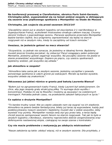 Jallet: Chcemy zdobyć więcej! PSGFC.pl - Polskie centrum kibiców Paris Saint-Germain - News Na konferencji prasowej w Clarefontaine, obrońca Paris Saint-Germain, Christophe Jallet, wypowiedział się na temat ambicji zespołu w zbliżającym się sezonie oraz piątkowego spotkania z Montpellier na Stade de Mosson. Christophe, jak czujecie się przed sezonem 2013/14? "Zaczęliśmy sezon już w zeszłym tygodniu od zwycięstwa 2-1 nad Bordeaux w Superpucharze Francji, aczkolwiek mistrzostwo smakuje całkiem inaczej. Chcemy obronić trofeum z poprzedniego sezonu. Pierwsze spotkanie przeciwko Montpellier będzie bardzo ciężkie, lecz pragniemy zaprezentować się lepiej na starcie rozgrywek niż w zeszłym roku, kiedy to zaczęliśmy od trzech remisów." Uważasz, że jesteście gotowi na mecz otwarcia? "Oczywiście, co jednak nie oznacza, że jesteśmy w idealnej formie. Będziemy musieli jeszcze troszkę poczekać, by zobaczyć Paryż osiągający pełen potencjał. Mentalnie, jesteśmy gotowi zagarnąć wszystko. Na początku sezonie nie jesteś w stanie przewidzieć wszystkiego. Dopiero po pięciu, czy sześciu spotkaniach będziemy widzieć, jak wszystko się układa." Jak atmosfera w zespole? "Atmosfera taka sama jak w zeszłym sezonie. Jesteśmy szczęśliwi z powodu ponownego spotkania w całym gronie po wakacjach. Morale są bardzo wysokie, wszystko układa się znakomicie." Odczuwasz już jakieś różnice w graniu pod batutą Laurenta Blanca? "Byłem już na zgrupowaniach kadry Francji, kiedy Laurent był selekcjonerem. On chce, aby jego zespoły grały atrakcyjną piłkę. To wymaga dużo wysiłku i koncentracji. Podoba mi się ta filozofia i możemy ją zauważyć na codziennych treningach. Potrzeba jednak czasu, na przełożenie założeń taktycznych w życie." Co sądzisz o drużynie Montpellier? "To bardzo trudny rywal. Nie za często udawało nam się wygrać na ich stadionie. Atmosfera na pewno bedzie fantastyczna, bilety już teraz są wyprzedane, każdy jest podekscytowany nowym sezonem i będziemy musieli dać z siebie wszystko, żeby wywieźć trzy punkty. Montpellier rozwija swój styl gry przez lata, a teraz będą chcieli jeszcze zaimponować swoim fanom na starcie rozgrywek. Tak jak to było w zeszłym tygodniu z Bordeaux, staniemy naprzeciwko dobrze zorganizowanej oraz defensywnie nastawionej ekipie, czekającej na swoje szanse z kontrataku." Czy nie macie problemów z motywacją po zdobyciu mistrzostwa? "Nasze założenia są takie: zdobyć więcej, niż w zeszłym sezonie. Dla przykładu, z 1/2 Jallet: Chcemy zdobyć więcej! PSGFC.pl - Polskie centrum kibiców Paris Saint-Germain - News rozgrywek pucharowych zostaliśmy trzykrotnie wyeliminowani w ćwierćfinale, a przecież możemy więcej. Obronić tytuł i dodać do tego jeden z pucharów - to byłoby idealne." Kogo uważasz za głównego rywala PSG w tym sezonie? "Zobaczymy po sześciu kolejkach. Wszystko się może zmienić bardzo szybko we francuskiej lidze. Monaco ma bardzo dobry skład, tak samo Marsylia mocno się wzmocniła. Lyon i Saint-Etienne mają potencjał. My musimy zaś skupić się na sobie." Autor: kublu 2/2 Powered by TCPDF (www.tcpdf.org)