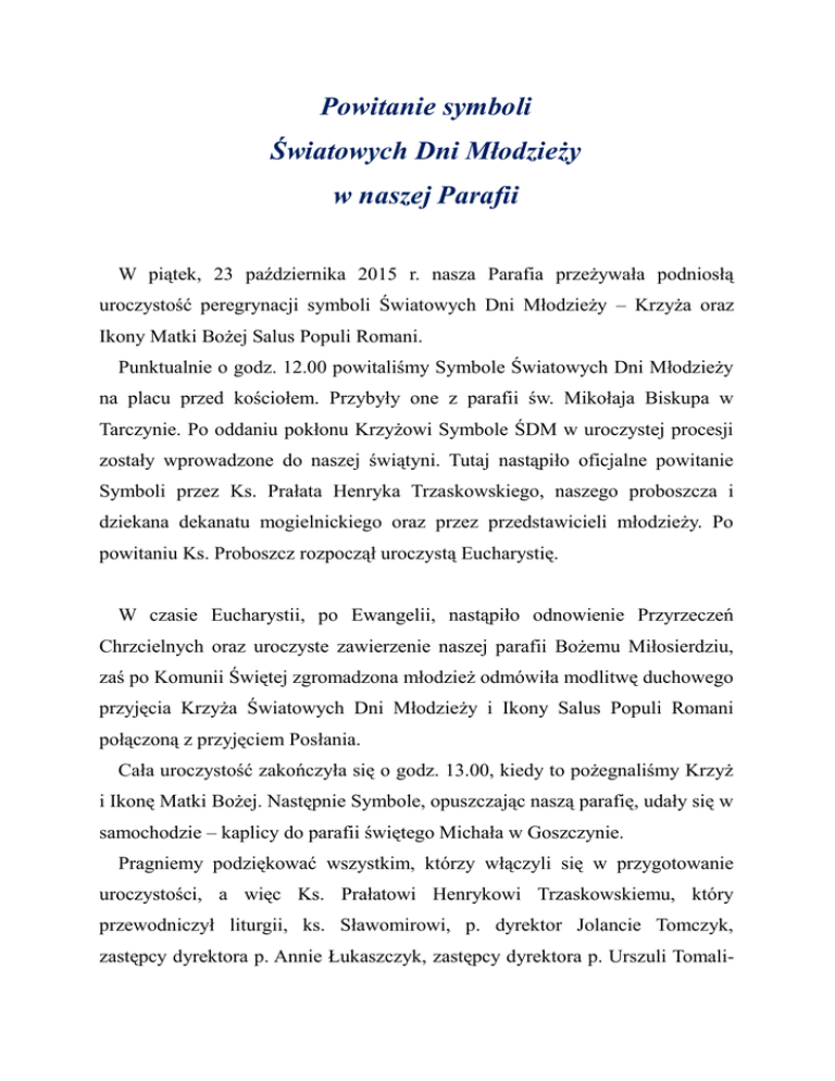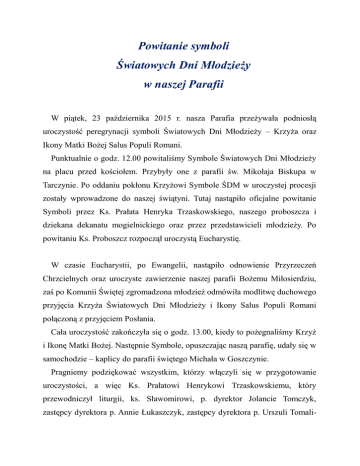 Powitanie symboli Światowych Dni Młodzieży w naszej Parafii W piątek, 23 października 2015 r. nasza Parafia przeżywała podniosłą uroczystość peregrynacji symboli Światowych Dni Młodzieży – Krzyża oraz Ikony Matki Bożej Salus Populi Romani. Punktualnie o godz. 12.00 powitaliśmy Symbole Światowych Dni Młodzieży na placu przed kościołem. Przybyły one z parafii św. Mikołaja Biskupa w Tarczynie. Po oddaniu pokłonu Krzyżowi Symbole ŚDM w uroczystej procesji zostały wprowadzone do naszej świątyni. Tutaj nastąpiło oficjalne powitanie Symboli przez Ks. Prałata Henryka Trzaskowskiego, naszego proboszcza i dziekana dekanatu mogielnickiego oraz przez przedstawicieli młodzieży. Po powitaniu Ks. Proboszcz rozpoczął uroczystą Eucharystię. W czasie Eucharystii, po Ewangelii, nastąpiło odnowienie Przyrzeczeń Chrzcielnych oraz uroczyste zawierzenie naszej parafii Bożemu Miłosierdziu, zaś po Komunii Świętej zgromadzona młodzież odmówiła modlitwę duchowego przyjęcia Krzyża Światowych Dni Młodzieży i Ikony Salus Populi Romani połączoną z przyjęciem Posłania. Cała uroczystość zakończyła się o godz. 13.00, kiedy to pożegnaliśmy Krzyż i Ikonę Matki Bożej. Następnie Symbole, opuszczając naszą parafię, udały się w samochodzie – kaplicy do parafii świętego Michała w Goszczynie. Pragniemy podziękować wszystkim, którzy włączyli się w przygotowanie uroczystości, a więc Ks. Prałatowi Henrykowi Trzaskowskiemu, który przewodniczył liturgii, ks. Sławomirowi, p. dyrektor Jolancie Tomczyk, zastępcy dyrektora p. Annie Łukaszczyk, zastępcy dyrektora p. Urszuli Tomali- Kujat, p. Marioli Kuźmie, s. Dorocie, ministrantom i młodzieży Zespołu Szkół Ogólnokształcących, którzy przygotowali całą uroczystość. Dziękujemy wszystkim, którzy wzięli udział w uroczystości, a więc p. dyrektorowi Witoldowi Ścisłowskiemu wraz z dziećmi ze Szkoły Podstawowej im. I Marszałka Polski Józefa Piłsudskiego w Mogielnicy, siostrom zakonnym, wychowawcom, nauczycielom, parafianom i przybyłym gościom. Na koniec należy podkreślić, że zarówno krzyż, jak i Ikona Matki Bożej Salus Populi Romani przekazał młodzieży osobiście Ojciec Święty Jan Paweł II. „Pierwszym znakiem jest Krzyż Światowych Dni Młodzieży. Po raz pierwszy pojawił się on w Bazylice św. Piotra, w pobliżu głównego ołtarza podczas Jubileuszu Odkupienia, który Kościół obchodził od Wielkiego Tygodnia 1983 do Wielkiego Tygodnia 1984 roku. Na zakończenie Roku Jubileuszowego ten właśnie krzyż Jan Paweł II przekazał młodym, wypowiadając następujące słowa: „Droga młodzieży, na zakończenie Roku Świętego powierzam wam znak tego Roku Jubileuszowego: Krzyż Chrystusa! Nieście go na cały świat jako znak miłości Pana Jezusa do ludzkości i głoście wszystkim, że tylko w Chrystusie umarłym i zmartwychwstałym jest zbawienie i odkupienie” (Rzym, 22 kwietnia 1984 r.) Odtąd krzyż ten pielgrzymuje po całym świecie. Wędrował po Europie, dotarł do obu Ameryk, Azji, Afryki i Australii, był obecny podczas wszystkich międzynarodowych obchodów Światowych Dni Młodzieży. Od 1994 roku ten krzyż podróżuje przez cały rok po wszystkich diecezjach tego kraju, który organizuje kolejny międzynarodowy Światowy Dzień Młodzieży. Pielgrzymka ta stanowi formę duchowego przygotowania danego kraju do przyjęcia papieża i młodzieży z całego świata. A teraz przyszedł ponownie czas na nas Polaków. Drugim znakiem, który nam dzisiaj towarzyszy jest rzymska kopia obrazu Matki Bożej Salus Populi Romani (tj. Ocalenie Ludu Rzymskiego). Ta – namalowana w bizantyjskim stylu, a pochodząca z XII wieku ikona – jest najczęściej kopiowanym na świecie i najpopularniejszym wizerunkiem Najświętszej Maryi Panny. Oryginał znajduje się w pierwszej i największej bazylice poświęconej Matce Bożej na Zachodzie, w Bazylice Matki Bożej Większej (Śnieżnej). W roku 2003 papież Jan Paweł II podarował młodzieży ten drugi symbol wiary, aby niosła go po świecie razem z krzyżem ŚDM. Przekazując ją młodym Ojciec Święty powiedział: „Dzisiaj powierzam wam ikonę Maryi. Od teraz będzie razem z Krzyżem towarzyszyć Światowym Dniom Młodzieży. Kontemplujcie waszą Matkę! Ikona będzie znakiem matczynej obecności Maryi bliskiej młodym, którzy jak apostoł Jan zostali wezwani, aby przyjąć ją do swojego życia” (Rzym, XVIII Światowy Dzień Młodzieży, 2003 r.). Obraz Matki Bożej, umieszczony obok krzyża ŚDM, przypomina nam słowa Chrystusa do ucznia: „Oto Matka twoja”. Przypomina także postawę św. Jana: „uczeń wziął ją do siebie” (J 19,27). W ten sposób jesteśmy zaproszeni do powierzenia się Maryi i do wzięcia Jej w swoje życie. Stojąc ufnie pod krzyżem, mimo wielkich boleści, Maryja pokazuje, że dzięki Chrystusowi jest możliwe nasze całkowite zawierzenie Bogu i ono jest jedynie słuszną postawą, która prowadzi człowieka do spełnienia i szczęścia – w ramionach Bożego miłosierdzia!” (na podst. www.bazylika.przeworsk.pl)