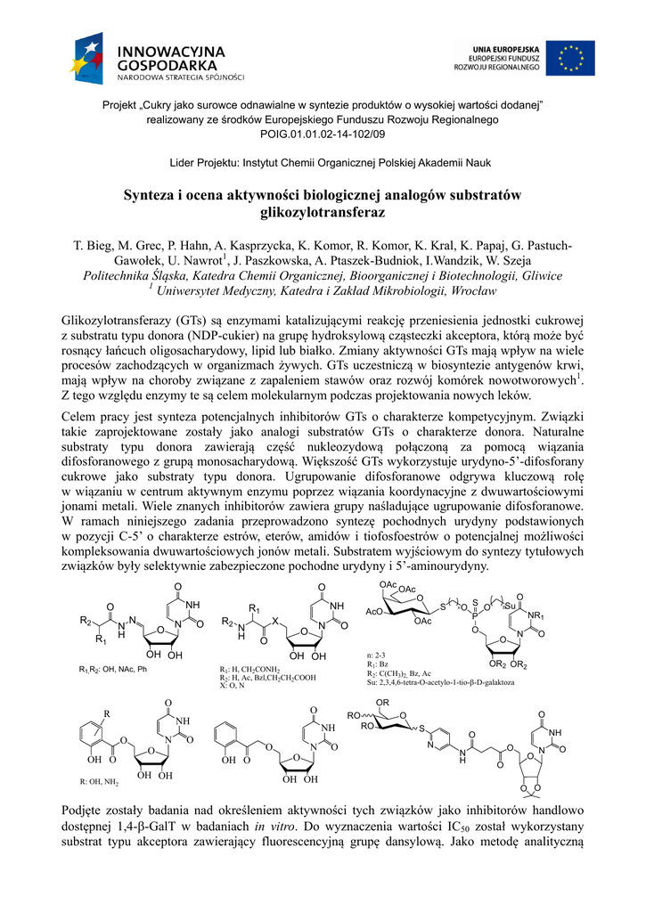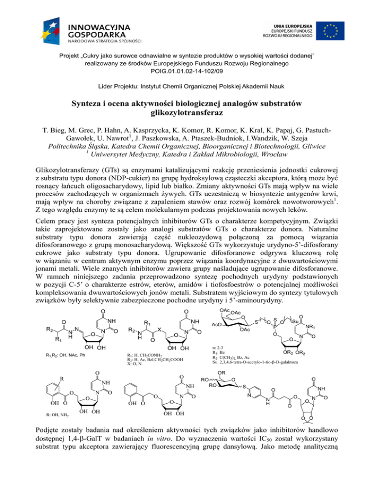Projekt „Cukry jako surowce odnawialne w syntezie produktów o wysokiej wartości dodanej” realizowany ze środków Europejskiego Funduszu Rozwoju Regionalnego POIG.01.01.02-14-102/09 Lider Projektu: Instytut Chemii Organicznej Polskiej Akademii Nauk Synteza i ocena aktywności biologicznej analogów substratów glikozylotransferaz T. Bieg, M. Grec, P. Hahn, A. Kasprzycka, K. Komor, R. Komor, K. Kral, K. Papaj, G. PastuchGawołek, U. Nawrot1, J. Paszkowska, A. Ptaszek-Budniok, I.Wandzik, W. Szeja Politechnika Śląska, Katedra Chemii Organicznej, Bioorganicznej i Biotechnologii, Gliwice 1 Uniwersytet Medyczny, Katedra i Zakład Mikrobiologii, Wrocław Glikozylotransferazy (GTs) są enzymami katalizującymi reakcję przeniesienia jednostki cukrowej z substratu typu donora (NDP-cukier) na grupę hydroksylową cząsteczki akceptora, którą może być rosnący łańcuch oligosacharydowy, lipid lub białko. Zmiany aktywności GTs mają wpływ na wiele procesów zachodzących w organizmach żywych. GTs uczestniczą w biosyntezie antygenów krwi, mają wpływ na choroby związane z zapaleniem stawów oraz rozwój komórek nowotworowych1. Z tego względu enzymy te są celem molekularnym podczas projektowania nowych leków. Celem pracy jest synteza potencjalnych inhibitorów GTs o charakterze kompetycyjnym. Związki takie zaprojektowane zostały jako analogi substratów GTs o charakterze donora. Naturalne substraty typu donora zawierają część nukleozydową połączoną za pomocą wiązania difosforanowego z grupą monosacharydową. Większość GTs wykorzystuje urydyno-5’-difosforany cukrowe jako substraty typu donora. Ugrupowanie difosforanowe odgrywa kluczową rolę w wiązaniu w centrum aktywnym enzymu poprzez wiązania koordynacyjne z dwuwartościowymi jonami metali. Wiele znanych inhibitorów zawiera grupy naśladujące ugrupowanie difosforanowe. W ramach niniejszego zadania przeprowadzono syntezę pochodnych urydyny podstawionych w pozycji C-5’ o charakterze estrów, eterów, amidów i tiofosfoestrów o potencjalnej możliwości kompleksowania dwuwartościowych jonów metali. Substratem wyjściowym do syntezy tytułowych związków były selektywnie zabezpieczone pochodne urydyny i 5’-aminourydyny. O NH O R2 R1 N H N N O O R2 N H X O O O N OH OH N O OH O O O nSu NR1 P O N O O OR RO NH O S n: 2-3 OR2 OR2 R1: Bz R2: C(CH3)2, Bz, Ac Su: 2,3,4,6-tetra-O-acetylo-1-tio--D-galaktoza O O O O NH O n OAc O R1: H, CH2CONH2 R2: H, Ac, Bzl,CH2CH2COOH X: O, N R S AcO OH OH R1,R2: OH, NAc, Ph R: OH, NH2 N OAc O NH R1 OH OH OH O OAc O O O O RO S NH O N N H O O N O O OH OH O O Podjęte zostały badania nad określeniem aktywności tych związków jako inhibitorów handlowo dostępnej 1,4--GalT w badaniach in vitro. Do wyznaczenia wartości IC50 został wykorzystany substrat typu akceptora zawierający fluorescencyjną grupę dansylową. Jako metodę analityczną zastosowano technikę RP HPLC z detekcją fluorescencyjną. Równolegle nowe pochodne nukleozydowe zostały poddane badaniom aktywności przeciwgrzybiczej. Aktualnie uważa się, że inhibitory dwóch glikozylotransferaz: syntazy chitynowej i syntazy glukanowej mogą być selektywnymi i bezpiecznymi środkami przeciwgrzybiczymi. Aktywność przeciwgrzybicza oznaczona została metodą mikrorozcieńczeniową z zastosowaniem podłoża RPMI 1640 buforowanego MOPS na dwóch szczepach wzorcowych: Candida albicans i Aspergilus fumigatus. Literatura: 1. Essentials of Glycobiology Second Edition, Eds.: A. Varki, R. D. Cummings, J. D. Esco, H. H. Freeze, P. Stanley, C. R. Bertozzi, G. W. Hart, M. E. Etzler, CSHL Press, 2009, 784 pp.