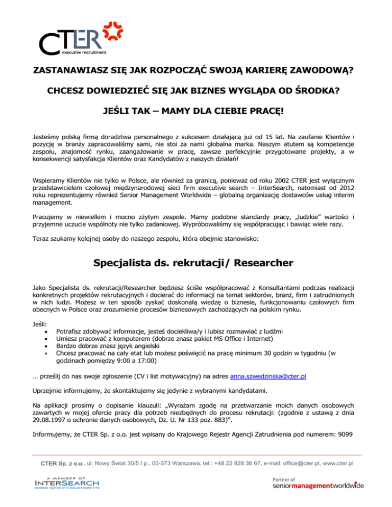 ZASTANAWIASZ SIĘ JAK ROZPOCZĄĆ SWOJĄ KARIERĘ ZAWODOWĄ? CHCESZ DOWIEDZIEĆ SIĘ JAK BIZNES WYGLĄDA OD ŚRODKA? JEŚLI TAK – MAMY DLA CIEBIE PRACĘ! Jesteśmy polską firmą doradztwa personalnego z sukcesem działającą już od 15 lat. Na zaufanie Klientów i pozycję w branży zapracowaliśmy sami, nie stoi za nami globalna marka. Naszym atutem są kompetencje zespołu, znajomość rynku, zaangażowanie w pracę, zawsze perfekcyjnie przygotowane projekty, a w konsekwencji satysfakcja Klientów oraz Kandydatów z naszych działań! Wspieramy Klientów nie tylko w Polsce, ale również za granicą, ponieważ od roku 2002 CTER jest wyłącznym przedstawicielem czołowej międzynarodowej sieci firm executive search – InterSearch, natomiast od 2012 roku reprezentujemy również Senior Management Worldwide – globalną organizację dostawców usług interim management. Pracujemy w niewielkim i mocno zżytym zespole. Mamy podobne standardy pracy, „ludzkie” wartości i przyjemne uczucie wspólnoty nie tylko zadaniowej. Wypróbowaliśmy się współpracując i bawiąc wiele razy. Teraz szukamy kolejnej osoby do naszego zespołu, która obejmie stanowisko: Specjalista ds. rekrutacji/ Researcher Jako Specjalista ds. rekrutacji/Researcher będziesz ściśle współpracować z Konsultantami podczas realizacji konkretnych projektów rekrutacyjnych i docierać do informacji na temat sektorów, branż, firm i zatrudnionych w nich ludzi. Możesz w ten sposób zyskać doskonałą wiedzę o biznesie, funkcjonowaniu czołowych firm obecnych w Polsce oraz zrozumienie procesów biznesowych zachodzących na polskim rynku. Jeśli: Potrafisz zdobywać informacje, jesteś dociekliwa/y i lubisz rozmawiać z ludźmi Umiesz pracować z komputerem (dobrze znasz pakiet MS Office i Internet) Bardzo dobrze znasz język angielski Chcesz pracować na cały etat lub możesz poświęcić na pracę minimum 30 godzin w tygodniu (w godzinach pomiędzy 9:00 a 17:00) … prześlij do nas swoje zgłoszenie (CV i list motywacyjny) na adres [email protected] Uprzejmie informujemy, że skontaktujemy się jedynie z wybranymi kandydatami. Na aplikacji prosimy o dopisanie klauzuli: „Wyrażam zgodę na przetwarzanie moich danych osobowych zawartych w mojej ofercie pracy dla potrzeb niezbędnych do procesu rekrutacji: (zgodnie z ustawą z dnia 29.08.1997 o ochronie danych osobowych, Dz. U. Nr 133 poz. 883)”. Informujemy, że CTER Sp. z o.o. jest wpisany do Krajowego Rejestr Agencji Zatrudnienia pod numerem: 9099 CTER Sp. z o.o., ul. Nowy Świat 30/5 I p., 00-373 Warszawa, tel.: +48 22 828 36 67, e-mail: [email protected], www.cter.pl