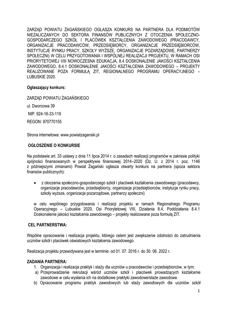 ZARZĄD POWIATU ŻAGAŃSKIEGO OGŁASZA KONKURS NA PARTNERA DLA PODMIOTÓW NIEZALICZANYCH DO SEKTORA FINANSÓW PUBLICZNYCH Z OTOCZENIA SPOŁECZNOGOSPODARCZEGO SZKÓŁ I PLACÓWEK KSZTAŁCENIA ZAWODOWEGO (PRACODAWCY, ORGANIZACJE PRACODAWCÓW, PRZEDSIĘBIORCY, ORGANIZACJE PRZEDSIĘBIORCÓW, INSTYTUCJE RYNKU PRACY, SZKOŁY WYŻSZE, ORGANIZACJE POZARZĄDOWE, PARTNERZY SPOŁECZNI) W CELU PRZYGOTOWANIA I WSPÓLNEJ REALIZACJI PROJEKTU, W RAMACH OSI PRIORYTETOWEJ VIII NOWOCZESNA EDUKACJA, 8.4 DOSKONALENIE JAKOŚCI KSZTAŁCENIA ZAWODOWEGO, 8.4.1 DOSKONALENIE JAKOŚCI KSZTAŁCENIA ZAWODOWEGO – PROJEKTY REALIZOWANE POZA FORMUŁĄ ZIT, REGIONALNEGO PROGRAMU OPERACYJNEGO – LUBUSKIE 2020. Ogłaszający konkurs: ZARZĄD POWIATU ŻAGAŃSKIEGO ul. Dworcowa 39 NIP: 924-16-33-119 REGON: 970770155 Strona internetowa: www.powiatzaganski.pl OGŁOSZENIE O KONKURSIE Na podstawie art. 33 ustawy z dnia 11 lipca 2014 r. o zasadach realizacji programów w zakresie polityki spójności finansowanych w perspektywie finansowej 2014–2020 (Dz. U. z 2014 r. poz. 1146 z późniejszymi zmianami) Powiat Żagański ogłasza otwarty konkurs na partnera (spoza sektora finansów publicznych): z otoczenia społeczno-gospodarczego szkół i placówek kształcenia zawodowego (pracodawcy, organizacje pracodawców, przedsiębiorcy, organizacje przedsiębiorców, instytucje rynku pracy, szkoły wyższe, organizacje pozarządowe, partnerzy społeczni) w celu wspólnego przygotowania i realizacji projektu w ramach Regionalnego Programu Operacyjnego – Lubuskie 2020, Osi Priorytetowej VIII, Działania 8.4, Poddziałania 8.4.1 Doskonalenie jakości kształcenia zawodowego – projekty realizowane poza formułą ZIT. CEL PARTNERSTWA: Wspólne opracowanie i realizacja projektu, którego celem jest zwiększenie zdolności do zatrudnienia uczniów szkół i placówek oświatowych kształcenia zawodowego. Realizacja projektu przewidywana jest w terminie: od 01. 07. 2016 r. do 30. 06. 2022 r. ZADANIA PARTNERA: 1. Organizacja i realizacja praktyk i staży dla uczniów u pracodawców i przedsiębiorców, w tym: a) Przeprowadzenie rekrutacji wśród uczniów szkół i placówek prowadzących kształcenie zawodowe w celu wysłania ich na dodatkowe praktyki zawodowe/staże zawodowe. b) Opracowanie programu praktyk zawodowych lub staży zawodowych dla uczniów szkół 1 i placówek prowadzących kształcenie zawodowe. c) Zapewnienie miejsca praktyki dla uczniów ze szkół znajdujących się na terenie powiatu, którzy wyrażają chęć wzięcia udziału w dodatkowych praktykach zawodowych, w odpowiednim obszarze kształcenia w tym monitorowanie i kontrolowanie jakości praktyk zawodowych lub staży zawodowych uczniów u pracodawców. 2. Organizacja i realizacja praktyk u pracodawców i przedsiębiorców dla nauczycieli, w tym a) Przeprowadzenie rekrutacji wśród nauczycieli szkół i placówek prowadzących kształcenie zawodowe w celu wysłania ich na dodatkowe praktyki zawodowe. b) Opracowanie programu praktyk zawodowych lub staży zawodowych dla nauczycieli szkół i placówek prowadzących kształcenie zawodowe. c) Zapewnienie miejsca praktyki dla nauczycieli ze szkół znajdujących się na terenie powiatu, którzy wyrażają chęć wzięcia udziału w dodatkowych praktykach zawodowych, w odpowiednim obszarze kształcenia w tym monitorowanie i kontrolowanie jakości praktyk zawodowych nauczycieli u pracodawców. 3. Organizacja i przeprowadzenie zajęć dla uczniów szkół zawodowych podnoszących ich kompetencje i kwalifikacje potrzebne na rynku pracy. 4. Organizacja i realizacja kursów kwalifikacyjnych, szkoleń doskonalących w zakresie tematyki związanej z nauczanym zawodem, studia podyplomowe, itp. dla nauczycieli. 5. Przeprowadzenie działań związanych z doradztwem zawodowym. ZAKRES TEMATYCZNY PROJEKTU: Realizacja projektu ma na celu wspierać kształcenie zawodowe w zakresie: 1. Podniesienie jakości kształcenia i szkolenia zawodowego, w tym rozwój współpracy szkół i placówek systemu oświaty prowadzących kształcenie zawodowe z ich otoczeniem społecznogospodarczym, poprzez: a) doskonalenie umiejętności i kompetencji zawodowych nauczycieli zawodu i instruktorów praktycznej nauki zawodu, związanych z nauczanym zawodem, we współpracy z instytucjami otoczenia społeczno-gospodarczego szkół i placówek systemu oświaty prowadzących kształcenie zawodowe; b) podnoszenie umiejętności oraz uzyskiwanie kwalifikacji zawodowych przez uczniów szkół lub placówek systemu oświaty prowadzących kształcenie zawodowe oraz uczestników pozaszkolnych form kształcenia zawodowego i wzmacnianie ich zdolności do zatrudnienia; c) tworzenie w szkołach lub placówkach systemu oświaty prowadzących kształcenie zawodowe warunków odzwierciedlających naturalne warunki pracy właściwe dla nauczanych zawodów; d) rozwój współpracy szkół lub placówek systemu oświaty prowadzących kształcenie zawodowe z ich otoczeniem społeczno-gospodarczym. 2. Rozwój doradztwa edukacyjno – zawodowego, poprzez: a) uzyskiwanie kwalifikacji doradców zawodowych przez osoby realizujące zadania z zakresu doradztwa zawodowego w szkołach i placówkach, które nie posiadają kwalifikacji z tego zakresu oraz poodnoszenie kwalifikacji zawodowych doradców edukacyjno-zawodowych, realizujących zadania z zakresu doradztwa edukacyjno-zawodowego; b) tworzenie Szkolnych Punktów Informacji i Kariery; c) zewnętrzne wsparcie szkół w obszarze doradztwa edukacyjno-zawodowego. WYMAGANIA WOBEC PARTNERA: 2 Do postępowania mogą przystąpić podmioty, które spełniają poniższe wymogi: 1. Nie są jednostką sektora finansów publicznych. 2. Mają zarejestrowaną działalność. 3. Nie podlegają wykluczeniu z ubiegania się o dofinansowanie na podstawie art. 207 ust. 4 ustawy z dnia 27 sierpnia 2009 r. o finansach publicznych (tekst jedn. Dz. U. z 2013 r. poz. 885 z późn. zm.) z zastrzeżeniem art. 207 ust. 7 tej Ustawy. 4. Nie zaleganie z z 