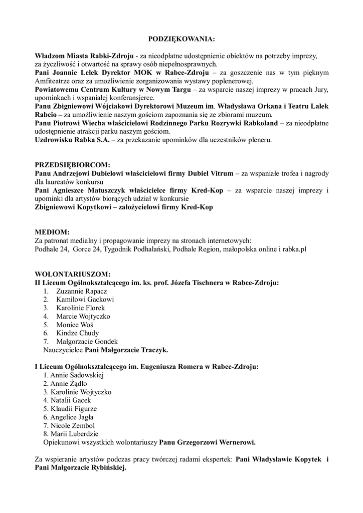PODZIĘKOWANIA: Władzom Miasta Rabki-Zdroju - za nieodpłatne udostępnienie obiektów na potrzeby imprezy, za życzliwość i otwartość na sprawy osób niepełnosprawnych. Pani Joannie Lelek Dyrektor MOK w Rabce-Zdroju – za goszczenie nas w tym pięknym Amfiteatrze oraz za umożliwienie zorganizowania wystawy poplenerowej. Powiatowemu Centrum Kultury w Nowym Targu – za wsparcie naszej imprezy w pracach Jury, upominkach i wspaniałej konferansjerce. Panu Zbigniewowi Wójciakowi Dyrektorowi Muzeum im. Władysława Orkana i Teatru Lalek Rabcio – za umożliwienie naszym gościom zapoznania się ze zbiorami muzeum. Panu Piotrowi Wiecha właścicielowi Rodzinnego Parku Rozrywki Rabkoland – za nieodpłatne udostępnienie atrakcji parku naszym gościom. Uzdrowisku Rabka S.A. – za przekazanie upominków dla uczestników pleneru. PRZEDSIĘBIORCOM: Panu Andrzejowi Dubielowi właścicielowi firmy Dubiel Vitrum – za wspaniałe trofea i nagrody dla laureatów konkursu Pani Agnieszce Matuszczyk właścicielce firmy Kred-Kop – za wsparcie naszej imprezy i upominki dla artystów biorących udział w konkursie Zbigniewowi Kopytkowi – założycielowi firmy Kred-Kop MEDIOM: Za patronat medialny i propagowanie imprezy na stronach internetowych: Podhale 24, Gorce 24, Tygodnik Podhalański, Podhale Region, małopolska online i rabka.pl WOLONTARIUSZOM: II Liceum Ogólnokształcącego im. ks. prof. Józefa Tischnera w Rabce-Zdroju: 1. Zuzannie Rapacz 2. Kamilowi Gackowi 3. Karolinie Florek 4. Marcie Wojtyczko 5. Monice Woś 6. Kindze Chudy 7. Małgorzacie Gondek Nauczycielce Pani Małgorzacie Traczyk. I Liceum Ogólnokształcącego im. Eugeniusza Romera w Rabce-Zdroju: 1. Annie Sadowskiej 2. Annie Żądło 3. Karolinie Wojtyczko 4. Natalii Gacek 5. Klaudii Figurze 6. Angelice Jagła 7. Nicole Zembol 8. Marii Luberdzie Opiekunowi wszystkich wolontariuszy Panu Grzegorzowi Wernerowi. Za wspieranie artystów podczas pracy twórczej radami ekspertek: Pani Władysławie Kopytek i Pani Małgorzacie Rybińskiej. Panu Marianowi Krzymińskiemu za wspaniałą i bogatą dokumentację fotograficzną.