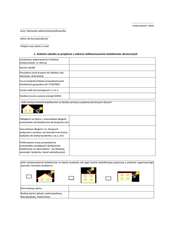……………………………. miejscowość i data ……………………………………………………………… Imię i Nazwisko właściciela/użytkownika ……………………………………….. Adres do korespondencji ……………………………………… Telefon oraz adres e-mail 1. Ankieta udziału w projekcie z zakresu dofinansowania kolektorów słonecznych Lokalizacja wykonywania instalacji (miejscowość, nr domu) Numer działki Posiadany tytuł prawny do obiektu (np. własność, dzierżawa) Czy w budynku/lokalu prowadzona jest działalność gospodarcza? (TAK/NIE) Liczba osób korzystających z c.w.u. Średnie roczne zużycie energii (kWh) Jeśli umiejscowienie kolektorów na działce proszę o podanie poniższych danych: Odległość od domu i szacunkowa długość przewodów od kolektorów do budynku (m) Szacunkowa długość rur służących połączeniu zestawu od zewnętrznej ściany budynku do kotła/zasobnika c.w.u. (m) Preferowana trasa prowadzenia przewodów zasilających (połączenie kolektorów ze zbiornikiem - po elewacji, wewnątrz budynku, kanał wentylacyjny) Jeśli umiejscowienie kolektorów na dachu budynku lub jego ścianie południowej poproszę o podanie sugerowanego sposobu montażu kolektora: Rok budowy domu Rodzaj dachu (płaski, jednospadowy, dwuspadowy, kopertowy) Pokrycie dachu (gont, papa, eternit, blacha, inne). Uwaga: jeżeli eternit, instalacja nie może być zamontowana na dachu Wymiary wolnej powierzchni dachu lub ściany skierowanej na południe (m2) Liczba kondygnacji nadziemnych Preferowana trasa prowadzenia przewodów zasilających (połączenie kolektorów ze zbiornikiem - po elewacji, wewnątrz budynku, wolny kanał wentylacyjny) Szacunkowa długość rur służących połączeniu zestawu z baterii z pozostałą częścią instalacji w budynku (m) Położenie kotłowni (węzła cieplnego) np. piwnica, poziom parteru Powierzchnia kotłowni (około m2) Wysokość kotłowni (około cm) Moc energii elektrycznej dostępna w kotłowni (czy można podłączyć urządzenie o mocy 60 W) TAK/NIE Lokalizacja istniejącego zbiornika c.w.u. (gdzie jest zamontowany bojler) Szerokość drzwi w celu wniesienia zasobnika (cm) Rodzaj opału wykorzystywanego do ogrzania budynku, wody (węgiel, koks, olej, gaz, drewno, słoma, energia) Roczne zużycie wykorzystywanego paliwa do ogrzewania budynku, wody (ton/rok) Ponadto: 1. Wyrażam zgodę na umieszczenie i utrzymywanie na powyższej nieruchomości, przez okres co najmniej 5 lat po zakończeniu realizacji projektu, zamontowanej instalacji oraz umieszczonego oznaczenia (ologowania) lub tablicy informacyjnej o sfinansowaniu projektu ze środków Europejskiego Funduszu Rozwoju Regionalnego w ramach Regionalnego Programu Operacyjnego Województwa Pomorskiego na lata 2014 – 2020. 2. Przyjmuję do wiadomości, iż realizacja operacji może pociągać za sobą dodatkowe koszty niekwalifikowane związane z niestandardowymi warunkami (np. nietypowe wpięcia do istniejącej instalacji co zwiększy zużycie materiału lub konieczność dokonania modernizacji istniejących instalacji), które w całości poniosę. 3. Udostępnię nieruchomość przedstawicielom Gminy Smołdzino oraz wykonawcom dla celów projektowych, montażu instalacji i eksploatacji urządzeń objętych projektem. 4. W przypadku uzyskania dofinansowania, na realizację projektu przez Gminę Smołdzino niezwłocznie podpiszę stosowną umowę oraz przedłożę dokumentację potwierdzającą posiadanie prawa do dysponowania nieruchomością na cele budowlane. 5. Przyjmuję do wiadomości, iż w przypadku, gdy: a) konstrukcja i stan techniczny dachu lub elewacji albo ukształtowanie nieruchomości uniemożliwi instalację urządzenia, b) kryteria formalne określone przez Instytucję organizującą konkurs (Urząd Marszałkowski Województwa Pomorskiego) wyłączą moją nieruchomość/ osobę z możliwości dofinansowania, nie będę mógł wziąć udziału w programie. 6. Wyrażam zgodę na przetwarzanie moich danych osobowych, zawartych w przedstawionych przeze mnie dokumentach, dla potrzeb niezbędnych do realizacji procedury związanej z przystąpieniem do projektu. Zostałem poinformowany, że podanie przeze mnie danych osobowych jest dobrowolne oraz, że przysługuje mi prawo dostępu do treści swoich danych oraz ich poprawiania zgodnie z przepisami ustawy z dnia 29 sierpnia 1997r. o ochronie danych osobowych (Dz. U. 1997 nr 133 poz. 883 z późn. zm.). Czytelny podpis wszystkich osób posiadających tytuł prawny do dysponowania nieruchomością: ………………………….. Czytelny podpis ………………………………… Czytelny podpis …………………………….. Czytelny podpis …………………………….. miejscowość i data ……………………………… miejscowość i data ………………………………….. miejscowość i data