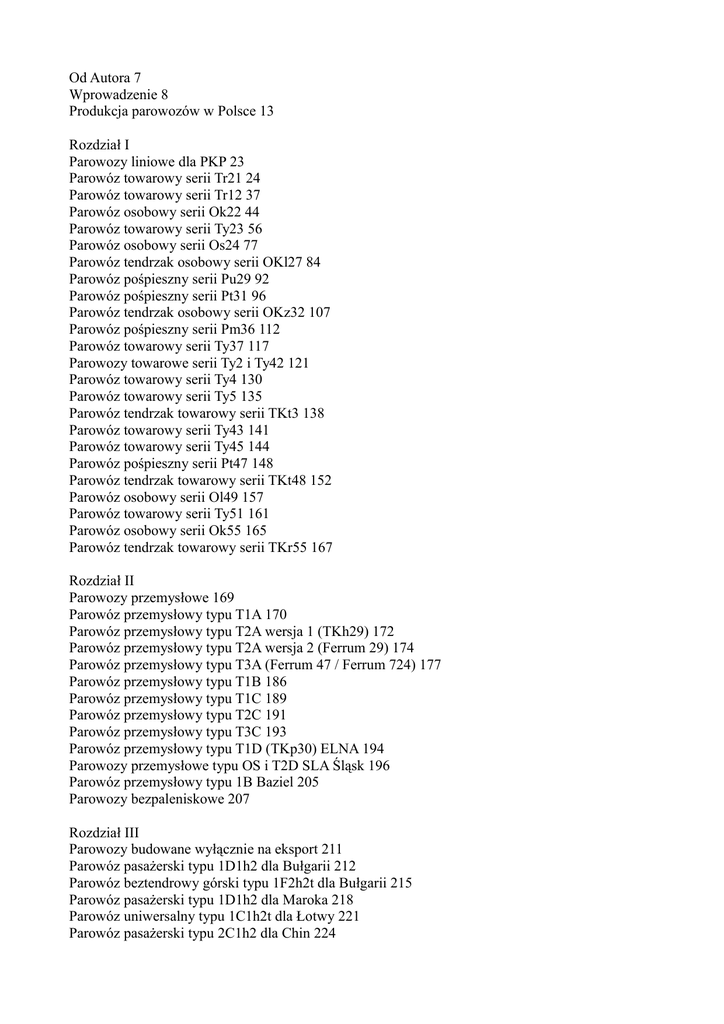 Od Autora 7 Wprowadzenie 8 Produkcja parowozów w Polsce 13 Rozdział I Parowozy liniowe dla PKP 23 Parowóz towarowy serii Tr21 24 Parowóz towarowy serii Tr12 37 Parowóz osobowy serii Ok22 44 Parowóz towarowy serii Ty23 56 Parowóz osobowy serii Os24 77 Parowóz tendrzak osobowy serii OKl27 84 Parowóz pośpieszny serii Pu29 92 Parowóz pośpieszny serii Pt31 96 Parowóz tendrzak osobowy serii OKz32 107 Parowóz pośpieszny serii Pm36 112 Parowóz towarowy serii Ty37 117 Parowozy towarowe serii Ty2 i Ty42 121 Parowóz towarowy serii Ty4 130 Parowóz towarowy serii Ty5 135 Parowóz tendrzak towarowy serii TKt3 138 Parowóz towarowy serii Ty43 141 Parowóz towarowy serii Ty45 144 Parowóz pośpieszny serii Pt47 148 Parowóz tendrzak towarowy serii TKt48 152 Parowóz osobowy serii Ol49 157 Parowóz towarowy serii Ty51 161 Parowóz osobowy serii Ok55 165 Parowóz tendrzak towarowy serii TKr55 167 Rozdział II Parowozy przemysłowe 169 Parowóz przemysłowy typu T1A 170 Parowóz przemysłowy typu T2A wersja 1 (TKh29) 172 Parowóz przemysłowy typu T2A wersja 2 (Ferrum 29) 174 Parowóz przemysłowy typu T3A (Ferrum 47 / Ferrum 724) 177 Parowóz przemysłowy typu T1B 186 Parowóz przemysłowy typu T1C 189 Parowóz przemysłowy typu T2C 191 Parowóz przemysłowy typu T3C 193 Parowóz przemysłowy typu T1D (TKp30) ELNA 194 Parowozy przemysłowe typu OS i T2D SLA Śląsk 196 Parowóz przemysłowy typu 1B Baziel 205 Parowozy bezpaleniskowe 207 Rozdział III Parowozy budowane wyłącznie na eksport 211 Parowóz pasażerski typu 1D1h2 dla Bułgarii 212 Parowóz beztendrowy górski typu 1F2h2t dla Bułgarii 215 Parowóz pasażerski typu 1D1h2 dla Maroka 218 Parowóz uniwersalny typu 1C1h2t dla Łotwy 221 Parowóz pasażerski typu 2C1h2 dla Chin 224 Parowóz pasażerski typu 1D1h3 dla Bułgarii 228 Parowóz towarowy typu Eh2 (Er) dla ZSRR 230 Parowóz pasażerski typu 2C1h2 (WP) dla Indii 233 Rozdział IV Niezrealizowane projekty parowozów Pociąg ekspresowy z parowozem typu 2B1h2t 237 Parowóz bezpaleniskowy typu Bn2ft 238 Parowóz towarowy serii Ty42 239 Parowóz pasażerski typu 1Ch2 dla Egiptu 240 Parowóz pasażerski typu 2D1h3 dla Bułgarii 242 Parowóz pasażerski typu 1D1h3 dla Bułgarii 243 Parowóz tendrzak pasażerski typu 1D2h3t dla Bułgarii 244 Parowóz przemysłowy typu D1h2t dla Bułgarii 244 Parowóz przemysłowy typu 1E1h2t 245 Parowóz przemysłowy typu Eh2t 246 Parowóz pośpieszny serii Pt47 półopływowy 247 Parowóz towarowy typu 1Dh2 dla Turcji 248 Parowóz pasażerski typu 2Ch2 dla Egiptu 249 Parowóz pasażerski typu 2Ch2 dla Egiptu 250 Parowóz towarowy typu 1E1h2 (Mir) dla Chin 251 Zakończenie 252 Załącznik 1. Parowozy liniowe w służbie PKP zbudowane w polskich fabrykach 254 Załącznik 2. Parowozy przemysłowe normalnotorowe zbudowane w Fabloku 256 Załącznik 3. Parowozy budowane w polskich fabrykach wyłącznie na eksport 257 Bibliografia 258