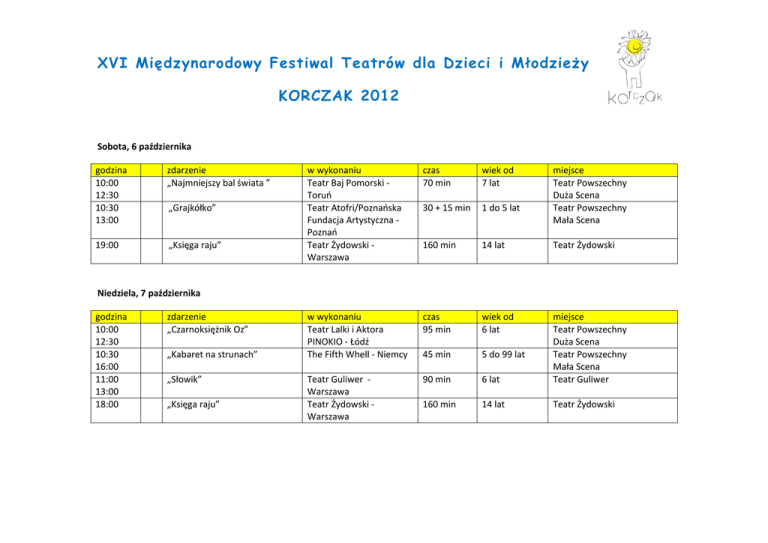 XVI Międzynarodowy Festiwal Teatrów dla Dzieci i Młodzieży KORCZAK 2012 Sobota, 6 października godzina 10:00 12:30 10:30 13:00 zdarzenie „Najmniejszy bal świata ” 19:00 „Księga raju” „Grajkółko” w wykonaniu Teatr Baj Pomorski Toruń Teatr Atofri/Poznańska Fundacja Artystyczna Poznań Teatr Żydowski Warszawa czas 70 min wiek od 7 lat miejsce Teatr Powszechny Duża Scena Teatr Powszechny Mała Scena 30 + 15 min 1 do 5 lat 160 min 14 lat Teatr Żydowski w wykonaniu Teatr Lalki i Aktora PINOKIO - Łódź The Fifth Whell - Niemcy czas 95 min wiek od 6 lat 45 min 5 do 99 lat Teatr Guliwer Warszawa Teatr Żydowski Warszawa 90 min 6 lat miejsce Teatr Powszechny Duża Scena Teatr Powszechny Mała Scena Teatr Guliwer 160 min 14 lat Teatr Żydowski Niedziela, 7 października godzina 10:00 12:30 10:30 16:00 11:00 13:00 18:00 zdarzenie „Czarnoksiężnik Oz” „Kabaret na strunach” „Słowik” „Księga raju” Poniedziałek, 8 października godzina 9:00 12:00 9:00 12:00 zdarzenie „Mikrokosmos. Kompozycje” 9:30 11:30 11:30 10:00 12:00 „Kabaret na strunach” „Aksamitny królik” „Słoneczniki” „Emil i detektywi” w wykonaniu Białostocki Teatr Lalek Białystok Teatr Lalki, Maski i Aktora GROTESKA Kraków The Fifth Whell - Niemcy czas 45 min wiek od 6 lat 90 min 6 do 13 lat 45 min 5 do 99 lat Dzieci i dorosłych Dječje Kazalište Branka Mihaljevića - Chorwacja 20 min 50 min 0 do 99 lat 7 lat Miejsce Teatr Powszechny Duża Scena Teatr Rampa Duża Scena Teatr Powszechny Mała Scena Teatr Lalka Teatr Lalka Wtorek, 9 października godzina zdarzenie 9:30 „Brzdęk, stuk, puk” 11:30 10:00 „Blee” 12:00 10:00 „XL” 13:00 17:00 „Wnyk” 20:00 Środa, 10 października w wykonaniu Theater o. N. - Niemcy czas 30 + 15 min wiek od 2 lata Teatr MASKA - Rzeszów 50 min 5 lat Compagnie Irene K. Belgia Teatr Lalki i Aktora Opole 45 min 7 lat 70 min 16 lat godzina 9:00 11:30 10:00 zdarzenie „Przygody małego M.” w wykonaniu Teatr Arka - Wrocław czas 80 min wiek od 5 lat „Mnemotechniki” 60 min 14 lat 13:30 „Alicja po drugiej stronie lustra” 15 min 0 do 99 lat 14:15 „Bajki z pudła” Stowarzyszenie Praktyków Kultury Warszawa Teatr „Na kółkach” Kowalki Teatr Lalki, Maski i Aktora GROTESKA - Kraków Teatr Lalka - Warszawa 35 min 8 do 11 lat 80 min 8 lat 17:30 „Tajemnicze dziecko” miejsce Teatr Powszechny Mała Scena Teatr Rampa Duża Scena Teatr Powszechny Duża Scena Teatr Konsekwentny miejsce Teatr Powszechny Duża Scena Teatr Powszechny Mała Scena Teatr Powszechny Mała Scena Teatr Powszechny Scena Pracownia Teatr Lalka Czwartek, 11 października godzina 9:30 12:00 10:00 10:00 12:00 10:30 12:30 12:00 zdarzenie „Podłogowo” w wykonaniu LALE.Teatr - Wrocław czas 30 + 15 min wiek od 1 do 5 lat „Wielkie i małe” Scena Otwarta/Teatr Lalka - Warszawa Teatr Baj - Warszawa 50 min 7 lat 70 min 5 lat TAM Teatromusica Włochy PEDAGOGIUM - Wyższa Szkoła Nauk Społecznych - Warszawa 50 min 6 do 10 lat 60 min 14 lat zdarzenie „Cyrk sierot” w wykonaniu Les Sages Fous - Kanada czas 60 min wiek od 9 lat „Cyrk na trzech łapach” Théâtre Oz - Belgia 45 min 3 lat “Farfalle” Compagnia TPO - Włochy 50 min 4 do 8 lat „Królowa Śniegu” „Picablo - w hołdzie Pablo Picasso” „Na huśtawce” miejsce Teatr Powszechny Mała Scena PEDAGOGIUM - Wyższa Szkoła Nauk Społecznych Teatr Baj Teatr Powszechny Duża Scena PEDAGOGIUM - Wyższa Szkoła Nauk Społecznych Piątek, 12 października godzina 9:30 12:00 10:00 12:00 10:00 12:30 miejsce Teatr Powszechny Mała Scena Teatr Rampa Duża scena Teatr Powszechny Duża Scena Sobota, 13 października godzina 18:00 zdarzenie w wykonaniu czas wiek od „Do zobaczenia” – widowisko teatralne zamykające Festiwal KORCZAK 2012 miejsce Teatr Powszechny Duża Scena UWAGA!!! Happeningi teatralne – 20 minut przed każdym spektaklem we foyer lub przed teatrem Spotkanie z twórcami spektaklu – po każdym przedstawieniu w sali teatralnej, ok. 30 minut. Legenda: - Wstęp bezpłatny po dokonaniu rezerwacji miejsc w kasie teatru GDZIE KUPIĆ BILETY: Teatr Powszechny 03-801 Warszawa, ul. Jana Zamoyskiego 20 tel. (22) 818 25 16 kasa tel. (22) 818 00 01 centrala wew. 144 tel. (22) 818-48-19 biuro obsługi widza - rezerwacja biletów tel. (22) 818 00 01 centrala wew. 118 możliwa rezerwacja drogą elektroniczną: [email protected] Teatr Rampa 03-536 Warszawa ul. Kołowa 20 tel. (22) 679-89-76 Teatr Lalka Pałac Kultury i Nauki 00-901 Warszawa, Plac Defilad 1 tel. (22) 656 69 56 Teatr Konsekwentny 03-736 Warszawa, ul. Ząbkowska 27/31 tel. 516 953 331 Teatr Żydowski im. Estery Rachel i Idy Kamińskich 00-104 Warszawa, Plac Grzybowski 12/16 tel. (22) 850 56 56 Teatr Lalek Guliwer 02-548 Warszawa, Różana 16 tel. (22) 845 16 76 wew. 123 (rezerw. dla grup) Teatr Baj 03-719 Warszawa, ul. Jagiellońska 28 tel. (22) 818 08 21 PEDAGOGIUM - Wyższa Szkoła Nauk Społecznych 00-102 Warszawa, ul. Marszałkowska 115 KONTAKT: Organizator Festiwalu Zespół Biura Festiwalu Polski Ośrodek Międzynarodowego Stowarzyszenia Teatrów dla Dzieci i Młodzieży ASSITEJ Małgorzata Marszałek-Nieszyn Justyna Gumienna Małgorzata Machałowska Biuro Festiwalu ul. Bartycka 18 tel. (22) 329 62 23 od 24.09.2012 r. w Teatrze Powszechnym 03-801 Warszawa, ul. Jana Zamoyskiego 20 tel. (22) 818 00 01 centrala wew. 148 tel. (22) 215 47 41 tel. (22) 215 47 45 e-mail: [email protected] www: www.korczak-festival.pl facebook: www.facebook.com/FestiwalTeatralnyKorczak Dyrektor Festiwalu Grażyna Karwowska-Winiarek tel. (22) 215 47 47 tel. 695 145 144 Dyrektor Artystyczny Festiwalu Wojciech Faruga tel. 501 966 366
