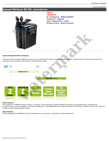Informacje o produkcie Utworzono 08-03-2017 Aquael Minikani 80 filtr zewnętrzny Cena : 160,00 zł Aquael Minikani 80 filtr zewnętrzny er m ar k Nr katalogowy : AQEL/105401 Producent : Aquael Stan magazynowy : niski Średnia ocena : brak recenzji w at Zewnętrzny filtr kanistrowy MINIKANI przeznaczony jest do filtrowania wody w akwariach słodkowodnych i akwaterrariach. Posiada zewnętrzną pompę zasysającą, która umożliwia pracę nawet w bardzo płytkiej wodzie. Skład zestawu: W standardzie filtr MINIKANI zawiera: korpus z z pokrywą, koszyki filtrujące i komplet wkładów filtracyjnych, wąż przyłączeniowy, komplet rurek przyłączeniowych, pompę zasilającą i przyssawki. Dodatkowo, z filtrem MINIKANI można stosować Sterylizer UV 3W UV-C lub Multi UVC 3W UV-C, który nie wchodzi w skład standardowego zestawu. Opis działania: Pompa zasilająca filtra MINIKANI może być montowana na trzy sposoby, w zależności od jego zastosowania: Wygenerowano w programie www.oscGold.com er m ar k - wewnątrz zbiornika do ścianki i pełnić funkcję pompy podającej wodę do filtra. Rozwiązanie to polecane jest w standardowych akwariach z rybami. - na zewnątrz, poniżej poziomu wody w akwarium i pełnić funkcję pompy przepływowej. Rozwiązanie to polecane jest w standardowych akwariach z rybami. W tym przypadku przed uruchomieniem filtra niezbędne jest podanie wody do pompy poprzez zassanie jej do węża doprowadzającego. - wewnątrz zbiornika, do jego dna i pełni funkcję pompy podającej wodę do filtra. Rozwiązanie polecane jest w akwariach z niskim poziomem wody. w at Wydajność pracy filtra MINIKANI można regulować poprzez przekręcenie zespołu sterującego w zakresie od 0 do 90 stopni. Przekręcenie zaworu sterującego, w kierunku zgodnym z ruchem wskazówek zegara, o pełne 90 stopni powoduje całkowite odcięcie dopływu wody i umożliwia jego bezpieczne wyjęcie z obudowy filtra bez konieczności odłączania pompy z sieci elektrycznej. Na rurce zasysającej zaleca się zastosowanie dodatkowego prefiltru w postaci wkładu gąbkowego, który nie wchodzi w skład standardowego zestawu. er m ar k Informacje o produkcie w at W filtrze MINIKANI można zastosować dowolne media filtracyjne do filtracji mechanicznej, biologicznej i chemicznej. Choć filtr ten nie wymaga częstego czyszczenia, jednak wkłady filtracyjne powinny być regularnie płukane w wodzie spuszczonej z akwarium (nigdy nie w wodzie kranowej). Wygenerowano w programie www.oscGold.com er m ar k Pierwsze czyszczenia zaleca się wykonać po 2 miesiącach od pierwszego uruchomienia filtra MINIKANI, a następnych – w miarę potrzeby sygnalizowanej widocznym spadkiem wydajności urządzenia. at W celu utrzymania optymalnej pracy filtra MINIKANI zaleca się wymieniać wkłady filtracyjne na nowe nie rzadziej niż raz na 12 miesięcy. W razie potrzeby obudowę pompy można oczyścić z glonów lub osadzającego się na niej kamienia używając miękkiej szmatki lub gąbki. w Media filtracyjne: Komplet wkładów filtracyjnych filtra MINIKANI w standardzie, oprócz gąbki i fizeliny do filtracji mechanicznej, zawiera: ZeoMAX Plus przeznaczony do chemicznej filtracji wody w akwarium. Jest to specjalny żwirek wykonany ze starannie selekcjonowanego zeolitu, który zapewnia bardzo dużą pojemność sorbcyjną. Model MINIKANI 120 zawiera dodatkowo BioCeraMAX Pro 600 przeznaczony do filtracji biologicznej wody w akwariach słodkowodnych i morskich. Ma postać walców, które wykonano z porowatego tworzywa ceramicznego. BioCeraMAX Pro 600 zapewnia bardzo dużą pojemność filtracyjną – 600m2. Nazwa liczba koszyków filtracyjnych pojemność wymiary filtra koszyków [mm] filtracyjnych [l] rekomendowana zużycie energii wydajność [l/h] pojemność [W] akwarium [l] MINI KANI 80 3 1 171x231x290 < 80 6 300 MINI KANI 120 4 1 171x231x354 80 - 120 6 350 Poniżej film instruktażowy Aquael: http://www.youtube.com/watch?v=ufWKvm5o4Ps