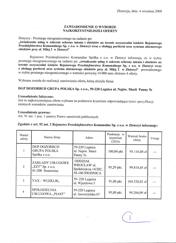Złotoryja, dnia 4 września2008 ZAWIADOMIENIE O WYBORZE NAJKORZYSTNIEJSZEJ OFERTY Dotyczy ; Przetargtnieograniczonego na zadaniepn ,,świadczenieusługw zakresie ochrony mienia i obiektów na terenie oczyszcza|niściekówRejonowego PrzedsiębiorstwaKomunalnegosp. Z o.o.w Złotoryiwraz Z obsługąportierni oraz systemualarmowego obiektów przy a|. Miłej 2 w Złotoryi,' Rejonowe Przedsiębiorstwo Komunalnę Spółka z o,o. w Złotoryi informuj e, że w trybie ptzetarga nieograniczonego na zadanie pn. ,,świadczenie usługw zakresie ochrony mienia i obiektów na terenie oczyszczalni ściekówRejonowego Przedsiębiorstwa Komunalnego sp. z o.o. w Z)otoryl, wraz z obsługąportierni oraz systemu alarmowego obiektów przy al. Miłej 2 w Złotoryi', p.o*ud"o,'"go w trybie przetarglnieograniczonego o wartościpowyżej 14 000 euro złożono4 oferty. Wybrana zostałado rca|izacji zamówienia oferta, którązłożyła ftrma: DGP DOZORBUD GRUPA PoLsKA Sp. z o.o., 59-220Legnica ul. Najśw.Marii Panny 5e Uzasadnienie faktyczne: Jest to najkorzystniejsza oferta wybrana na podstawie kryerium odpowiadającatreścispecyfikacji istotnych warunków zamówienia. Uzasadnienie prawne: Art. 91 ust. 1 poz. 1 ustawy Prawo zarnówienpublicznych. Zgodnie z art.92 ust.2 Rejonowe Przedsiębiorstwo Komunalne Sp. z o.o. w 7'łotoryiinformuje: Numer ofeĘ Nazwa firmy Adres Punktacja w kryterium CENA Wartość brutto ofeĘ 100,00pkt 95.116.08zł 95,29pIł,. 99.8|8,45 zł I DGP DOZORBUD GRUPA POLSKA Spółkaz o.o' 59-220Legnica ul. Najśw. Marii Panny5e f ZAI<ŁADYUSŁUGoWE ,,EZT"Sp.z o.o. 4l-200 Sosnowiec oDDZIAŁ WROCŁAW ul. YAX - WLEKLIK. 59-220 Legnica ul. Wjazdowa5 91,00pkt 104.520.82 zł SPoŁDZIELNIA USŁUGoWA ""PIAST'' 59-220 Legnica u|.Iaworzyńska67 95,80pkt 99.284.09zł J A Społdzie|cza|41202, 58-100ŚwtpNIc,ł Uwagi