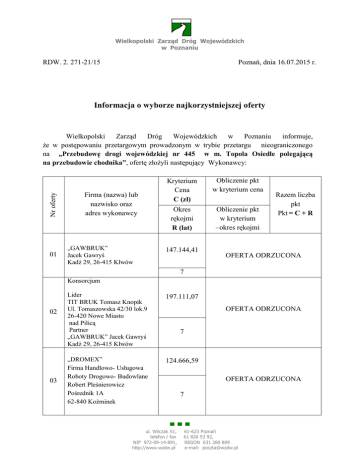 Wielkopolski Zarząd Dróg Wojewódzkich w Poznaniu Poznań, dnia 16.07.2015 r. RDW. 2. 271-21/15 Informacja o wyborze najkorzystniejszej oferty Nr oferty Wielkopolski Zarząd Dróg Wojewódzkich w Poznaniu informuje, że w postępowaniu przetargowym prowadzonym w trybie przetargu nieograniczonego na „Przebudowę drogi wojewódzkiej nr 445 w m. Topola Osiedle polegającą na przebudowie chodnika”, ofertę złożyli następujący Wykonawcy: 01 Firma (nazwa) lub nazwisko oraz adres wykonawcy „GAWBRUK” Jacek Gawryś Kadź 29, 26-415 Kłwów Kryterium Cena C (zł) Okres rękojmi R (lat) 147.144,41 Obliczenie pkt w kryterium cena Obliczenie pkt w kryterium –okres rękojmi Razem liczba pkt Pkt = C + R OFERTA ODRZUCONA 7 Konsorcjum 02 03 Lider TIT BRUK Tomasz Knopik Ul. Tomaszowska 42/30 lok.9 26-420 Nowe Miasto nad Pilicą Partner „GAWBRUK” Jacek Gawryś Kadź 29, 26-415 Kłwów 197.111,07 „DROMEX” Firma Handlowo- Usługowa Roboty Drogowo- Budowlane Robert Pleśnierowicz Pośrednik 1A 62-840 Koźminek 124.666,59 OFERTA ODRZUCONA 7 OFERTA ODRZUCONA 7 ▀ ▀ ▀ ul. Wilczak 51, telefon / fax NIP 972-09-14-891, http://www.wzdw.pl 61-623 Poznań 61 826 53 92, REGON 631 280 809 e-mail: [email protected] 04 05 06 P.P.H.U. „EUROBUD” Eugeniusz Jakubiak Huta 124 63-430 Odolanów 119.093,45 OFERTA ODRZUCONA 7 FIRMA 90 Budownictwa Wodnego, Melioracji I Robót Drogowych „BIOBUD” Jerzy Schabikowski Sokołowice 109 56-400 Oleśnica P.U.B. „BRUKPOL” s. c. Strzelce Wielkie 81C 63-820 Piaski 131.435,76 5 W wyniku postępowania wybrano ofertę firmy: 90,00+0 = 90,00 pkt 0 pkt 187.405,01 6 (131.435,76: 131.435,76) x 90 pkt = 90,00 pkt (131.435,76: 187.405,01) x 90 pkt = 63,12 pkt 5 pkt 63,12+5 = 68,12 pkt FIRMA 90 Budownictwa Wodnego, Melioracji I Robót Drogowych „BIOBUD” Jerzy Schabikowski Sokołowice 109, 56-400 Oleśnica za cenę: 131.435,76 zł brutto. Uzasadnienie wyboru oferty: oferta uzyskała najwyższą ilość punktów. Jednocześnie informujemy, że firma: 1) „DROMEX” Firma Handlowo- Usługowa Roboty Drogowo- Budowlane Robert Pleśnierowicz Pośrednik 1A 62-840 Koźminek została wykluczona z postępowania na podstawie art. 24 ust. 2 pkt 4 ustawy z dnia 29.01.2004r. – Prawo zamówień publicznych; Z postępowania o udzielenie zamówienia wyklucza się wykonawców, którzy nie wykazali spełniania warunków udziału w postępowaniu. Wykonawca na wezwanie Zamawiającego nie uzupełnił oferty o dokumenty wykazujące wykonanie trzech zadań związanych z układaniem nawierzchni z kostki betonowej brukowej o wartości nie mniejszej niż dwieście tysięcy złotych (brutto) pozwalające na stwierdzenie spełnienia wymagania pkt 6.2.2.SIWZ dotyczącego doświadczenia. ▀ ▀ ▀ ul. Wilczak 51, telefon / fax NIP 972-09-14-891, http://www.wzdw.pl 61-623 Poznań 61 826 53 92, REGON 631 280 809 e-mail: [email protected] 2) P.P.H.U. „EUROBUD” Eugeniusz Jakubiak Huta 124 63-430 Odolanów została wykluczona z postępowania na podstawie art. 24 ust.2 pkt 4 ustawy z dnia 29.01.2004r. – Prawo zamówień publicznych; Z postępowania o udzielenie zamówienia wyklucza się wykonawców, którzy nie wykazali spełniania warunków udziału w postępowaniu. Wykonawca na wezwanie Zamawiającego uzupełnił ofertę o poświadczenie Powiatowego Zarządu Dróg w Ostrowie Wlkp. które nie potwierdza wykonanie trzeciego zadania związanego z układaniem nawierzchni z kostki betonowej brukowej o wartości nie mniejszej niż dwieście tysięcy złotych (brutto) pozwalające na stwierdzenie spełnienia wymagania pkt 6.2.2.SIWZ dotyczącego doświadczenia. Na podstawie art. 24 ust.4 ustawy z dnia 29.01.2004r. – Prawo zamówień publicznych; Ofertę wykonawcy wykluczonego uznaje się za odrzuconą. Zamawiający informuje również, że oferty: 1) Firmy „GAWBRUK” Jacek Gawryś Kadź 29, 26-415 Kłwów 2) Konsorcjum Lider: TIT BRUK Tomasz Knopik Ul. Tomaszowska 42/30 lok.9 26-420 Nowe Miasto nad Pilicą Partner: „GAWBRUK” Jacek Gawryś, Kadź 29, 26-415 Kłwów zostają odrzucone z postępowania na podstawie art. 89 ust. 1 pkt 1 ustawy z dnia 29.01.2004r. – Prawo zamówień publicznych; Zamawiający odrzuca ofertę, jeżeli jest niezgodna z ustawą. Zgodnie z art. 82 ust.1 ustawy z dnia 29.01.2004r. – Prawo zamówień publicznych; Wykonawca może złożyć jedną ofertę. Firma „GAWBRUK” Jacek Gawryś złożyła dwie oferty: samodzielnie i jako partner konsorcjum. ▀ ▀ ▀ ul. Wilczak 51, telefon / fax NIP 972-09-14-891, http://www.wzdw.pl 61-623 Poznań 61 826 53 92, REGON 631 280 809 e-mail: [email protected]