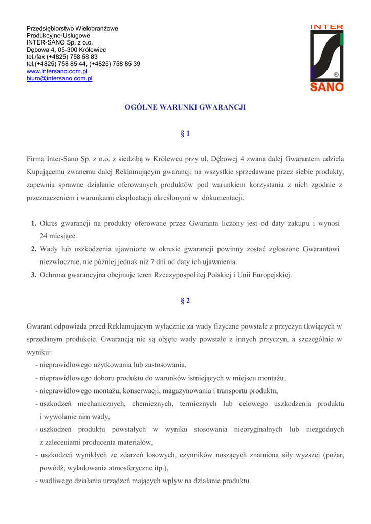 Przedsiębiorstwo Wielobranżowe Produkcyjno-Usługowe INTER-SANO Sp. z o.o. Dębowa 4, 05-300 Królewiec tel./fax (+4825) 758 58 83 tel.(+4825) 758 85 44, (+4825) 758 85 39 www.intersano.com.pl [email protected] R OGÓLNE WARUNKI GWARANCJI §1 Firma Inter-Sano Sp. z o.o. z siedzibą w Królewcu przy ul. Dębowej 4 zwana dalej Gwarantem udziela Kupującemu zwanemu dalej Reklamującym gwarancji na wszystkie sprzedawane przez siebie produkty, zapewnia sprawne działanie oferowanych produktów pod warunkiem korzystania z nich zgodnie z przeznaczeniem i warunkami eksploatacji określonymi w dokumentacji. 1. Okres gwarancji na produkty oferowane przez Gwaranta liczony jest od daty zakupu i wynosi 24 miesiące. 2. Wady lub uszkodzenia ujawnione w okresie gwarancji powinny zostać zgłoszone Gwarantowi niezwłocznie, nie później jednak niż 7 dni od daty ich ujawnienia. 3. Ochrona gwarancyjna obejmuje teren Rzeczypospolitej Polskiej i Unii Europejskiej. §2 Gwarant odpowiada przed Reklamującym wyłącznie za wady fizyczne powstałe z przyczyn tkwiących w sprzedanym produkcie. Gwarancją nie są objęte wady powstałe z innych przyczyn, a szczególnie w wyniku: - nieprawidłowego użytkowania lub zastosowania, - nieprawidłowego doboru produktu do warunków istniejących w miejscu montażu, - nieprawidłowego montażu, konserwacji, magazynowania i transportu produktu, - uszkodzeń mechanicznych, chemicznych, termicznych lub celowego uszkodzenia produktu i wywołanie nim wady, - uszkodzeń produktu powstałych w wyniku stosowania nieoryginalnych lub niezgodnych z zaleceniami producenta materiałów, - uszkodzeń wynikłych ze zdarzeń losowych, czynników noszących znamiona siły wyższej (pożar, powódź, wyładowania atmosferyczne itp.), - wadliwego działania urządzeń mających wpływ na działanie produktu. Gwarancja nie obejmuje części podlegających normalnemu zużyciu oraz części i materiałów eksploatacyjnych. Gwarancja nie obejmuje produktu, którego na podstawie przedłożonych dokumentów i cech znamionowych produktu nie można zidentyfikować jako produktu zakupionego u Gwaranta. §3 Ponadto Reklamujący traci uprawnienia z tytułu gwarancji na produkty w przypadku stwierdzenia: - jakiejkolwiek modyfikacji produktu, - ingerencji osób nieuprawnionych, - jakichkolwiek prób napraw dokonywanych przez osoby nieuprawnione, - nieprzestrzegania obowiązków dokonywania okresowych przeglądów jeśli są one wymagane. §4 Stwierdzenia przez Gwaranta zaistnienia przyczyn określonych w § 2 i § 3 jest podstawą do nie uznania reklamacji produktu. W przypadku nie uznania reklamacji reklamowany produkt będzie zwrócony Reklamującemu pod warunkiem uprzedniego pokrycia Gwarantowi kosztów przesłania produktu do Reklamującego. Nieodebrany towar po okresie 60 dni będzie utylizowany. §5 Podstawą przyjęcia reklamacji do rozpatrzenia jest spełnienie łącznie następujących warunków: 1. Pisemnego ewentualnie za pośrednictwem przedstawiciela handlowego, faxu lub poczty e-mail zgłoszenia reklamacji przez Reklamującego zawierającego: nazwę towaru, numer katalogowy lub kod kreskowy, szczegółowy opis uszkodzenia wraz z dodatkowymi informacjami dotyczącymi powstania wad produktu. 2. Okazanie oryginału faktury lub paragonu zakupu reklamowanego produktu. 3. Dostarczenia osobistego lub za pośrednictwem przewoźnika (spedytora), poczty, przedstawiciela handlowego reklamowanego produktu do siedziby Gwaranta, po uprzednim uzgodnieniu z Gwarantem. §6 1. Gwarancja ogranicza się jedynie do bezpłatnej naprawy produktu w siedzibie Gwaranta, dostawy części zamiennych, wymiany na nowy bądź inny produkt o takich samych parametrach technicznych, wystawienia korekty faktury zakupu (zwrotu pieniędzy). 2. Gwarant decyduje o zasadności zgłoszenia gwarancyjnego oraz o wyborze sposobu realizacji uznanych roszczeń gwarancyjnych. 3. Wymienione wadliwe produkty przechodzą na własność Gwaranta. 4. Gwarant zastrzega sobie prawo obciążenia Reklamującego kosztami manipulacyjnymi związanymi z przeprowadzeniem ekspertyzy i transportem, jeśli reklamowany produkt będzie sprawny lub uszkodzenie nie było objęte gwarancją. W takim przypadku Reklamujący zostanie obciążony opłatą manipulacyjną w wysokości kosztów Gwaranta. §7 Reklamowany produkt powinien być dostarczony odpowiednio zabezpieczony na czas transportu. Gwarant nie odpowiada za zniszczenia lub uszkodzenia produktu wynikające z niewłaściwego opakowania lub zabezpieczenia produktu przez Reklamującego. §8 1. Gwarant nie ponosi odpowiedzialności za wydłużenie czasu rozpatrzenia reklamacji spowodowane niepełnym lub wprowadzającym w błąd opisem usterki. 2. Przyjęcie produktu w celu rozpatrzenia reklamacji nie oznacza uznania reklamacji za zasadną. §9 Realizacja reklamacji będzie następowała w terminie do 14 dni od daty dostarczenia reklamacji. § 10 W uzasadnionych przypadkach możliwe jest ustalenie w formie pisemnej innego terminu lub sposobu rekompensaty roszczeń Reklamującego z tytułu gwarancji. § 11 W przypadku naprawy produktu czas trwania gwarancji ulega przedłużeniu o ten okres. W przypadku wymiany produktu na nowy, produkt ten jest objęty nową gwarancją od dnia wydania nowego produktu. § 12 Po dokonaniu naprawy reklamowany towar będzie odesłany na koszt Gwaranta. § 13 1. Gwarant nie jest zobowiązany do modernizowania lub modyfikowania istniejących produktów po wejściu na rynek ich nowszych wersji. 2. Gwarant nie ponosi odpowiedzialności za jakiekolwiek pośrednie lub bezpośrednie straty i szkody, poniesione przez Reklamującego z powodu wady produktu, a w szczególności utraty lub uszkodzenia innego sprzętu, wynikłych przestojów, utraty zysków lub dochodów, kosztów towarów zastępczych itp. § 14 Gwarancja nie wyłącza, nie ogranicza ani nie zawiesza uprawnień kupującego wynikających z przepisów o rękojmi za wady rzeczy sprzedanej. § 15 W sprawach nieuregulowa