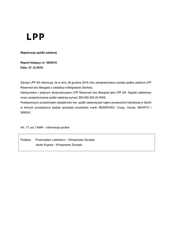 Rejestracja spółki zależnej Raport bieżący nr: 59/2016 Data: 27.12.2016 Zarząd LPP SA informuje, że w dniu 26 grudnia 2016 roku zarejestrowana została spółka zależna LPP Reserved doo Beograd z siedzibą w Belgradzie (Serbia). Założycielem i jedynym akcjonariuszem LPP Reserved doo Beograd jest LPP SA. Kapitał zakładowy nowo zarejestrowanej spółki zależnej wynosi 200.000.000,00 RDS. Podstawowym przedmiotem działalności ww. spółki zależnej jest najem powierzchni handlowej w Serbii w których prowadzona będzie sprzedaż produktów marki RESERVED, Cropp, House, MOHITO i SiNSAY. Art. 17 ust.1 MAR – informacje poufne Podpisy: Przemysław Lutkiewicz – Wiceprezes Zarządu Jacek Kujawa - Wiceprezes Zarządu
