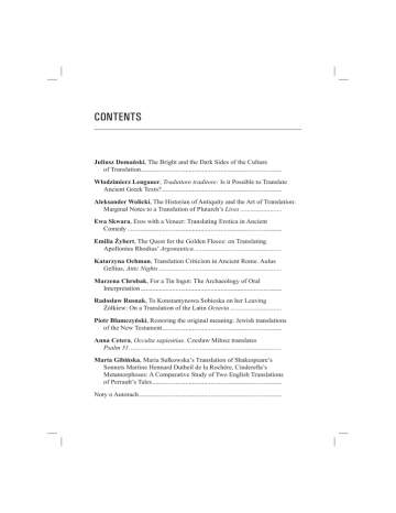 CONTENTS Juliusz Domański, The Bright and the Dark Sides of the Culture of Translation..................................................................................... Włodzimierz Lengauer, Traduttore traditore: Is it Possible to Translate Ancient Greek Texts? ........................................................................ Aleksander Wolicki, The Historian of Antiquity and the Art of Translation: Marginal Notes to a Translation of Plutarch’s Lives ......................... Ewa Skwara, Eros with a Veneer: Translating Erotica in Ancient Comedy ............................................................................................. Emilia Żybert, The Quest for the Golden Fleece: on Translating Apollonius Rhodius’ Argonautica ..................................................... Katarzyna Ochman, Translation Criticism in Ancient Rome. Aulus Gellius, Attic Nights .......................................................................... Marzena Chrobak, For a Tin Ingot: The Archaeology of Oral Interpretation ..................................................................................... Radosław Rusnak, To Konstantynowa Sobieska on her Leaving Żółkiew: On a Translation of the Latin Octavia ............................... Piotr Blumczyński, Restoring the original meaning: Jewish translations of the New Testament ........................................................................ Anna Cetera, Occulta sapientiae. Czesław Miłosz translates Psalm 51 ............................................................................................ Marta Gibińska, Maria Sułkowska’s Translation of Shakespeare’s Sonnets Martine Hennard Dutheil de la Rochère, Cinderella’s Metamorphoses: A Comparative Study of Two English Translations of Perrault’s Tales .............................................................................. Noty o Autorach ......................................................................................