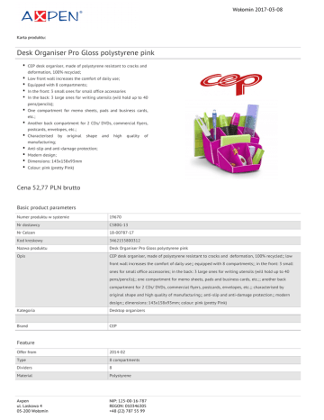 Wołomin 2017-03-08 Karta produktu: Desk Organiser Pro Gloss polystyrene pink CEP desk organiser, made of polystyrene resistant to cracks and deformation, 100% recycled; Low front wall increases the comfort of daily use; Equipped with 8 compartments; In the front: 3 small ones for small office accessories In the back: 3 large ones for writing utensils (will hold up to 40 pens/pencils); One compartment for memo sheets, pads and business cards, etc.; Another back compartment for 2 CDs/ DVDs, commercial flyers, postcards, envelopes, etc.; Characterised by original shape and high quality of manufacturing; Anti-slip and anti-damage protection; Modern design; Dimensions: 143x158x93mm Colour: pink (pretty Pink) Cena 52,77 PLN brutto Basic product parameters Numer produktu w systemie 19670 Nr dostawcy C580G-13 Nr Celcen 18-00787-17 Kod kreskowy 3462155800312 Nazwa produktu Desk Organiser Pro Gloss polystyrene pink Opis CEP desk organiser, made of polystyrene resistant to cracks and deformation, 100% recycled;; low front wall increases the comfort of daily use;; equipped with 8 compartments;; in the front: 3 small ones for small office accessories; in the back: 3 large ones for writing utensils (will hold up to 40 pens/pencils);; one compartment for memo sheets, pads and business cards, etc.;; another back compartment for 2 CDs/ DVDs, commercial flyers, postcards, envelopes, etc.;; characterised by original shape and high quality of manufacturing;; anti-slip and anti-damage protection;; modern design;; dimensions: 143x158x93mm; colour: pink (pretty Pink) Kategoria Desktop organizers Brand CEP Feature Offer from 2014-02 Type 8 compartments Dividers 8 Material Polystyrene Axpen ul. Laskowa 4 05-200 Wołomin NIP: 125-00-16-787 REGON: 010346305 +48 (22) 787 55 99 Wołomin 2017-03-08 Karta katalogowa produktu cd. Desk Organiser Pro Gloss polystyrene pink Product Holder Procurement vocabulary CPV 30193200-0 Korytka i organizatory na biurka Certifications New product Standard Hit Standard Dimensions Dimensions (mm) 143x158x93 Colour Colour Pink Pozostałe zdjęcia produktu Serdecznie zapraszamy do współpracy Axpen zespół. Axpen ul. Laskowa 4 05-200 Wołomin NIP: 125-00-16-787 REGON: 010346305 +48 (22) 787 55 99