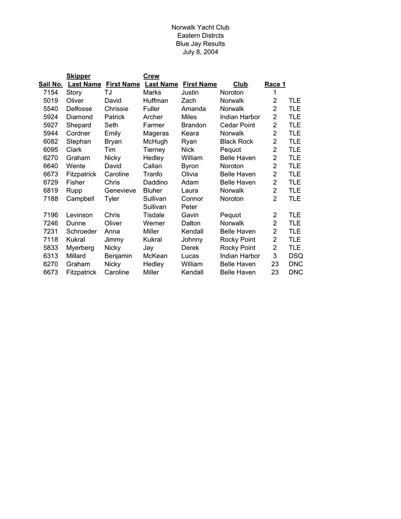 Norwalk Yacht Club Eastern Distrcts Blue Jay Results July 8, 2004 Skipper Sail No. Last Name 7154 Story 5019 Oliver 5540 Delfosse 5924 Diamond 5927 Shepard 5944 Cordner 6082 Stephan 6095 Clark 6270 Graham 6640 Wente 6673 Fitzpatrick 6729 Fisher 6819 Rupp 7188 Campbell 7196 7246 7231 7118 5833 6313 6270 6673 Levinson Dunne Schroeder Kukral Myerberg Millard Graham Fitzpatrick Crew First Name Last Name TJ Marks David Huffman Chrissie Fuller Patrick Archer Seth Farmer Emily Mageras Bryan McHugh Tim Tierney Nicky Hedley David Callan Caroline Tranfo Chris Daddino Genevieve Bluher Tyler Sullivan Sullivan Chris Tisdale Oliver Werner Anna Miller Jimmy Kukral Nicky Jay Benjamin McKean Nicky Hedley Caroline Miller First Name Justin Zach Amanda Miles Brandon Keara Ryan Nick William Byron Olivia Adam Laura Connor Peter Gavin Dalton Kendall Johnny Derek Lucas William Kendall Club Race 1 Noroton 1 Norwalk 2 Norwalk 2 Indian Harbor 2 Cedar Point 2 Norwalk 2 Black Rock 2 Pequot 2 Belle Haven 2 Noroton 2 Belle Haven 2 Belle Haven 2 Norwalk 2 Noroton 2 TLE TLE TLE TLE TLE TLE TLE TLE TLE TLE TLE TLE TLE Pequot Norwalk Belle Haven Rocky Point Rocky Point Indian Harbor Belle Haven Belle Haven TLE TLE TLE TLE TLE DSQ DNC DNC 2 2 2 2 2 3 23 23