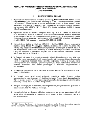 REGULAMIN PROMOCJI SPRZEDAŻY PREMIOWEJ ZMYWAREK WHIRLPOOL „BŁYSKAWICZNY DUET” (dalej: Regulamin) I. POSTANOWIENIA OGÓLNE 1. Organizatorem konsumenckiej sprzedaży premiowej „BŁYSKAWICZNY DUET” (zwana dalej: Promocją) jest spółka Albedo Marketing sp. z o.o., z siedzibą w Poznaniu przy ul. Tatrzańskiej 8, zarejestrowana w Sądzie Rejonowym Poznań – Nowe Miasto i Wilda w Poznaniu VIII Wydział Gospodarczy KRS, wpisana do Krajowego Rejestru Sądowego pod numerem KRS 125373, NIP 779-21-83-071, kapitał zakładowy 50.000 zł (zwana dalej: Organizatorem). 2. Organizator działa na zlecenie Whirlpool Polska Sp. z o. o. Oddział w Warszawie, ul. 1 Sierpnia 6A, wpisana do rejestru przedsiębiorców Krajowego Rejestru Sądowego, prowadzonego przez Są d Rejonowy dla Wrocław ia Fabrycznej , VI Wydział Gospodarczy Krajowego Rejestru Są dowego , pod numerem KRS 0000025866, o kapitale zakładowym 294.341.430,00 PLN, wpłaconym w całości, NIP: 896-000-04-92. 3. Promocja trwać będzie w dniach od 1.07.2016 r. do 30.10.2016 r. lub do wyczerpania zapasów (dalej: Okres Promocyjny) i będzie prowadzona na obszarze Rzeczpospolitej Polskiej. Aby wziąć udział w Promocji zakup produktów premiowych, o których mowa w pkt 9 Regulaminu musi zostać dokonany w okresie wskazanym w zdaniu poprzednim. Czynności związane z wydaniem nagród oraz rozpatrywaniem reklamacji zostaną zakończone do dnia 01.02.2017 r. 4. W Promocji nie mogą brać udziału pracownicy Albedo Marketing sp. z o.o., Whirlpool Polska Sp. z o.o. oraz członkowie ich rodzin, jak również inne osoby biorące bezpośredni udział w organizacji Promocji. Przez członków najbliższej rodziny, o których mowa powyżej rozumie się: rodziców, opiekunów prawnych, dzieci, rodzeństwo, małżonków, rodziców małżonków oraz osoby pozostające w stosunku przysposobienia z pracownikiem. 5. Promocją nie są objęte produkty zakupione w ramach programów pracowniczych „EURO Family” i „Dla Ciebie”. 6. W Promocji mogą wziąć udział wyłącznie pełnoletnie osoby fizyczne, będące konsumentami w rozumieniu art. 221 Kodeksu Cywilnego1 (zwane dalej: Uczestnikami), które w okresie trwania Promocji dokonają zakupu jedną transakcją przynajmniej jednej zmywarki, o której mowa w punkcie 9 Regulaminu. 7. Niniejsza Promocja jest realizowana przez Organizatora jako przyrzeczenie publiczne w rozumieniu art. 919-921 Kodeksu cywilnego. 8. Promocja nie jest grą losową, zakładem wzajemnym, ani grą na automatach których wynik zależy od przypadku w rozumieniu art. 2 ustawy z dnia 19 listopada 2009 r. o grach hazardowych. 1 Art. 22¹ Kodeksu Cywilnego – Za konsumenta uważa się osobę fizyczną dokonującą czynności prawnej niezwiązanej bezpośrednio z jej działalnością gospodarczą lub zawodową. 1 II. ZASADY SPRZEDAŻY PREMIOWEJ OBEJMUJĄCEJ WSZYSTKIE MODELE ZMYWAREK WHIRLPOOL. 9. Promocja obejmuje wszystkie modele zmywarek marki Whirlpool. Zmywarki marki Whirlpool biorące udział w Promocji są dalej odpowiednio zwane zmywarkami Whirlpool. 10. Promocja polega na możliwości uzyskania przez Uczestnika, który w okresie trwania Promocji zakupi dowolny model zmywarki Whirlpool, gwarantowanej nagrody rzeczowej w postaci 90-ciu kapsułek Fairy Platinum. Nagroda rzeczowa obejmuje 2 opakowania kapsulek Fairy Platinum do zmywarki. W każdym opakowaniu znajduje się 45 szt. kapsułek Fairy Platinum. Rynkowa wartość nagrody rekomendowana przez producenta to 107,98 PLN. 11. Dowodem zakupu zmywarki Whirlpool akceptowanym przez Organizatora będzie paragon lub faktura VAT, potwierdzająca datę dokonania zakupu oraz miejsce dokonania zakupu (obszar Polski). 12. W celu otrzymania nagrody, o której mowa w pkt 10 nabywca zmywarki Whirlpool zobowiązany jest prawidłowo wypełnić formularz dostępny na stronie Promocji www.whirlpool-promocja.pl poprzez podanie następujących danych: a. imię i nazwisko b. adres zamieszkania c. numer telefonu d. e-mail e. model zakupionej zmywarki f. dwunastocyfrowy numer seryjny zmywarki g. data zakupu zmywarki oraz załączyć skan dowodu zakupu. Uczestnik biorący udział w promocji oświadcza, że nie skorzystał i nie skorzysta z prawa do odstąpienia od umowy, na mocy której dokonał zakupu zmywarki Whirlpool. Ponadto Uczestnik obowiązany jest wyrazić zgodę na przetwarzanie jego danych osobowych na potrzeby realizacji niniejszej Promocji oraz zgodę na przesyłanie na podany przez Uczestnika adres e-mail informacji handlowych i marketingowych dotyczących produktów Whirlpool Polska Sp. z o. o. Podanie danych ma charakter dobrowolny, jednak jest konieczne dla rozpatrzenia zgłoszenia Uczestnika. 13. Prawidłowo wypełniony formularz promocyjny Uczestnik powinien wypełnić i przesłać online za pośrednictwem strony: www.whirlpool-promocja.pl załączając skan dowodu zakupu, w terminie 30 dni od dnia dokonania zakupu zmywarki Whirlpool. Zgłoszenia przesłane po upływie terminu wskazanego w zdaniu poprzednim, tj. najpóźniej po dniu 30.11.2016 r., nie będą rozpatrywane. 14. W razie wątpliwości, co do wiarygodności zgłoszenia i spełnienia przez Uczestnika wszystkich warunków udziału w Promocji, Organizator może zobowiązać Uczestnika do przesłania lub udostępnienia w inny sposób oryginału paragonu, faktury VAT potwierdzającego zakup zmywarki Whirlpool oraz zdjęcia numeru seryjnego zmywarki. 15. Warunkiem koniecznym pozytywnego zweryfikowania Uczestnika, jest wykorzystanie w formularzu numeru seryjnego zmywarki Whirlpool. Paragony lub faktury VAT wykorzystane w zgłoszeniu przez jednego Uczestnika, nie podlegają ponownemu zgłoszeniu przez inne osoby. 2 16. Kapsułki Fairy Platinum zostaną wysłane do Uczestnika w terminie 30 dni od daty otrzymania przez Organizatora prawidłowo wypełnionego zgłoszenia (w formie on-line) wraz ze skanem dowodu zakupu (paragon/faktura). Organizator zastrzega sobie prawo pozostawienia bez rozpoznania zgłoszeń niepełnych