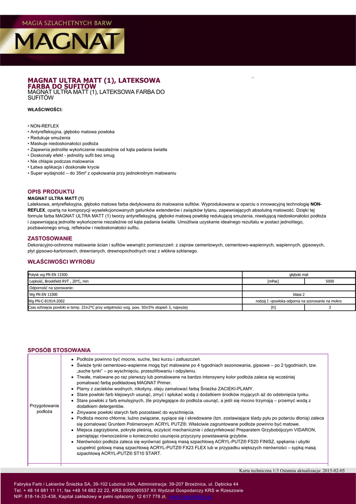 MAGNAT ULTRA MATT (1), LATEKSOWA FARBA DO SUFITÓW MAGNAT ULTRA MATT (1), LATEKSOWA FARBA DO SUFITÓW WŁAŚCIWOŚCI: • NONREFLEX • Antyrefleksyjna, głęboko matowa powłoka • Redukuje smużenia • Maskuje niedoskonałości podłoża • Zapewnia jednolite wykończenie niezależnie od kąta padania światła • Doskonały efekt jednolity sufit bez smug • Nie chlapie podczas malowania • Łatwa aplikacja i doskonałe krycie • Super wydajność – do 35m² z opakowania przy jednokrotnym malowaniu OPIS PRODUKTU MAGNAT ULTRA MATT (1) Lateksowa, antyrefleksyjna, głęboko matowa farba dedykowana do malowania sufitów. Wyprodukowana w oparciu o innowacyjną technologię NONREFLEX, opartą na kompozycji wyselekcjonowanych gatunków extenderów i związków tytanu, zapewniających absolutną matowość. Dzięki tej formule farba MAGNAT ULTRA MATT (1) tworzy antyrefleksyjną, głęboko matową powłokę redukującą smużenia, niwelującą niedoskonałości podłoża i zapewniającą jednolite wykończenie niezależnie od kąta padania światła. Umożliwia uzyskanie idealnego rezultatu w postaci jednolitego, pozbawionego smug, refleksów i niedoskonałości sufitu. ZASTOSOWANIE Dekoracyjnoochronne malowanie ścian i sufitów wewnątrz pomieszczeń: z zapraw cementowych, cementowowapiennych, wapiennych, gipsowych, płyt gipsowokartonowch, drewnianych, drewnopochodnych oraz z włókna szklanego. WŁAŚCIWOŚCI WYROBU Połysk wg PN EN 13300 głęboki mat [mPas] Lepkość, Brookfield RVT , 20°C, min 5000 Odporność na szorowanie: Wg PN EN 13300 klasa 2 Wg PN-C-81914:2002 rodzaj I –powłoka odporna na szorowanie na mokro [h] Czas schnięcia powłoki w temp. 23±2°C przy wilgotności wzg. pow. 50±5% stopień 3, najwyżej 3 SPOSÓB STOSOWANIA Przygotowanie podłoża Podłoże powinno być mocne, suche, bez kurzu i zatłuszczeń. Świeże tynki cementowowapienne mogą być malowane po 4 tygodniach sezonowania, gipsowe – po 2 tygodniach, tzw. „suche tynki” – po wyschnięciu, przeszlifowaniu i odpyleniu. Trwałe, malowane po raz pierwszy lub pomalowane na bardzo intensywny kolor podłoża zaleca się wcześniej pomalować farbą podkładową MAGNAT Primer. Plamy z zacieków wodnych, nikotyny, oleju zamalować farbą Śnieżka ZACIEKIPLAMY. Stare powłoki farb klejowych usunąć, zmyć i spłukać wodą z dodatkiem środków myjących aż do odsłonięcia tynku. Stare powłoki z farb emulsyjnych, źle przylegające do podłoża usunąć, a jeśli się mocno trzymają – przemyć wodą z dodatkiem detergentów. Zmywane powłoki starych farb pozostawić do wyschnięcia. Podłoża mocno chłonne, luźno związane, sypiące się i skredowane (tzn. zostawiające ślady pyłu po potarciu dłonią) zaleca się pomalować Gruntem Polimerowym ACRYL PUTZ®. Właściwie zagruntowane podłoże powinno być matowe. Miejsca zagrzybione, pokryte pleśnią, oczyścić mechanicznie i zdezynfekować Preparatem Grzybobójczym VIDARON, pamiętając równocześnie o konieczności usunięcia przyczyny powstawania grzybów. Nierówności podłoża zaleca się wyrównać gotową masą szpachlową ACRYLPUTZ® FS20 FINISZ, spękania i ubytki uzupełnić gotową masą szpachlową ACRYLPUTZ® FX23 FLEX lub w przypadku większych nierówności – sypką masą szpachlową ACRYLPUTZ® ST10 START. Karta techniczna 1/3 Ostatnia aktualizacja: 2015-02-05 Fabryka Farb i Lakierów Śnieżka SA, 39102 Lubzina 34A, Administracja: 39207 Brzeźnica, ul. Dębicka 44 Tel. + 48 14 681 11 11, fax +48 14 682 22 22, KRS 0000060537 XII Wydział Gospodarczy KRS w Rzeszowie NIP: 8181433438, Kapitał zakładowy w pełni opłacony: 12 617 778 zł, www.magnatfarby.pl Przygotowanie wyrobu Malowanie UWAGI Farbę przed malowaniem dokładnie wymieszać. Do farby nie dodawać wapna, kredy, bieli tytanowej, ani nie mieszać z innymi farbami. Farby z różnych partii produkcyjnych wymieszać razem przed ich użyciem. Do pierwszego malowania świeżych niegruntowanych podłoży zaleca się rozcieńczyć farbę, w zależności od chłonności podłoża dodając do 10% wody. Na zagruntowane podłoże nakładać farbę nierozcieńczoną. Do malowania tapet z włókna szklanego(w zależności od ich struktury) dopuszczalne jest 10procentowe rozcieńczenie produktu. Należy stosować się do zaleceń producenta tapet. W przypadku „wzrostu lepkości po czasie” dopuszcza się rozcieńczyć farbę dodatkiem od 3 do 5% wody. Malować wewnątrz pomieszczeń w temperaturze otoczenia i podłoża od +10°C do +30°C. Nakładać pędzlem, wałkiem lub natryskiem dwie warstwy farby – warstwę drugą po wyschnięciu poprzedniej tj. po około 24 h. W przypadku podłoży niegruntowanych do pierwszego malowania wyrób rozcieńczyć dodając maksymalnie 10%. Kolejne dwie warstwy farby nakładać bez rozcieńczania. Narzędzia po zakończeniu prac malarskich umyć w wodzie. Pełne właściwości wytrzymałościowe powłoka uzyskuje po 28 dniach. W czasie prac malarskich i po ich zakończeniu pomieszczenie wietrzyć do zaniku zapachu. Przechowywać i magazynować w szczelnie zamkniętych pojemnikach. PARAMETRY MALOWANIA DLA POSZCZEGÓLNYCH METOD PARAMETRY MALOWANIA METODY lepkość farby dodatek rozcieńczalnika średnica dyszy pistoletu ciśnienie natrysku [s] [%] [mm] [MPa] postać handlowa - - - 2 postać handlowa - 0,43÷0,66 20÷21 1-2 zalecana ilość warstw MALOWANIA Pędzel, wałek Natrysk hydrodynamiczny* * natrysk wykonany na urządzeniach firmy Graco, model 395 ST PRO OKRES PRZYDATNOŚCI 48 miesięcy od daty produkcji. OPAKOWANIA 2,5L, 5L, 10L WYDAJNOŚĆ do 14 m²/L przy jednokrotnym malowaniu KOLORYSTYKA Śnieżnobiały LZO Limit zawartości LZO dla produktu (kat. A/a/FW): 30 g/l. Produkt zawiera max.30g/l. NORMY I ATESTY PNC81914:2002 Rodzaj I – farba odporna na szorowanie na mokro WSKAZÓWKI BHP I PPOŻ BEZPIECZEŃSTWO: Zawiera 1,2benzoizotiazol3(2H)on. Może powodować wystąpienie reakcji alergicznej. W razie konieczności zasięgni