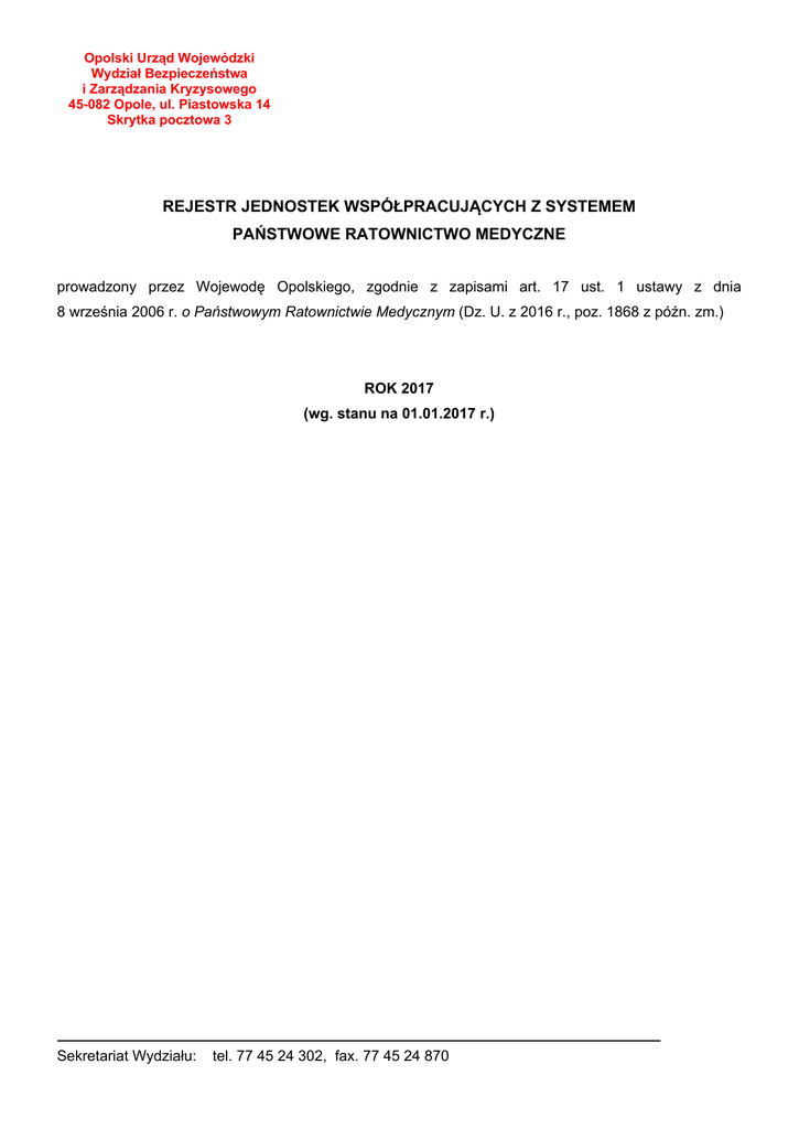 Opolski Urząd Wojewódzki Wydział Bezpieczeństwa i Zarządzania Kryzysowego 45-082 Opole, ul. Piastowska 14 Skrytka pocztowa 3 REJESTR JEDNOSTEK WSPÓŁPRACUJĄCYCH Z SYSTEMEM PAŃSTWOWE RATOWNICTWO MEDYCZNE prowadzony przez Wojewodę Opolskiego, zgodnie z zapisami art. 17 ust. 1 ustawy z dnia 8 września 2006 r. o Państwowym Ratownictwie Medycznym (Dz. U. z 2016 r., poz. 1868 z późn. zm.) ROK 2017 (wg. stanu na 01.01.2017 r.) Sekretariat Wydziału: tel. 77 45 24 302, fax. 77 45 24 870 REJESTR JEDNOSTEK WSPÓŁPRACUJĄCYCH Z SYSTEMEM PAŃSTWOWE RATOWNICTWO MEDYCZNE PROWADZONY PRZEZ WOJEWODĘ OPOLSKIEGO L.p. 1. Nazwa jednostki współpracującej z systemem Komenda Wojewódzka Państwowej Straży Pożarnej wraz z podległymi jej Komendami: Miejską oraz Powiatowymi Sekretariat Wydziału: Siedziba jednostki Opole Adres jednostki 45-202 Opole, ul. Budowlanych 1 tel. 77 45 24 302, fax. 77 45 24 870 Obszar działania województwo opolskie Liczba ratowników posiadających ważne zaświadczenia o ukończeniu kursu i uzyskaniu tytułu ratownika 792 Wykaz wyposażenia, jakim dysponuje jednostka współpracująca z systemem 1) 7 manekinów szkoleniowych osób dorosłych 2) 2 manekiny noworodka 3) 1 zestaw ratowniczy PSP R-2 4) 2 zestawy ratownicze PSP R-1 5) 2 defibrylatory półautomatyczne ćwiczebne 6) 1 zestaw „TRIAGE” 7) głowa do nauki intubacji 8) 2 zestawy ran Maksymalny czas dotarcia jednostki na miejsce zdarzenia uzależniony od lokalizacji miejsca zdarzenia i jednostki organizacyjnej PSP Numery telefonów kontaktowych 77 422 33 85 (Wojewódzkie Stanowisko Kierowania Ratowniczego) 2. Opolski Oddział Okręgowy Polski Czerwony Krzyż Sekretariat Wydziału: Opole 45-018 Opole, ul. Krakowska 51 tel. 77 45 24 302, fax. 77 45 24 870 województwo opolskie 12 1) Ochrona osobista: - 29 kombinezonów ochronnych jednoczęściowych wg standardu, - 30 kurtek ochronnych wg standardu - 30 spodni ochronnych oznakowanych wg standardu, - 30 bluz ochronnych oznakowanych wg standardu, - 30 kasków ochronnych PETZL Vaertex Best, - 30 sztuk oświetlenia osobistego – czołówka, - 30 okularów ochronnych. 2) Sprzęt ratowniczy: - 4 torby PSP R-1, - 12 apteczek plecakowych, opatrunkowych z wyposażeniem, - 4 deski ortopedyczne ze stabilizatorami i pasami, - 3 nosze podbierakowe, - 4 zestawy szyn Kramera, - 2 nosze pneumatyczne, - 1 defibrylator AED, - 4 ciśnieniomierze, - 2 glukometry, - 2 pulsoksymetry. 4 godziny 77 454 53 40, 792 311 102 3) Transport: - 1 samochód Volkswagen. Transporter 4 4) Łączność/lokalizacja: - 5 radiotelefonów nasobnych, - 1 GPS, 5) Logistyka: - 1 namiot z podłogą o pow. 50 m2, - 2 namioty szybkorozkładalne o pow. 18m2, - 1 agregat prądotwórczy, - 3 przedłużacze bębnowe, - 8 lamp oświetleniowych do Polowego Punktu Medycznego, - 2 nagrzewnice olejowe, - 30 łóżek polowych, 6) Pozostałe: - 2 kamizelki KED, -5 latarek typu szperacz, - 1 zestaw do segregacji TRIAGE. Sekretariat Wydziału: tel. 77 45 24 302, fax. 77 45 24 870 3. Wodne Ochotnicze Pogotowie Ratunkowe Województwa Opolskiego Opole 45-301 Opole, ul. Małopolska 3 województwo opolskie 17 1) samochód terenowy Ssangyong Action Sports- Picup. 4x4WD, 2) samochód terenowy Ssangyong KYRONPicup. 4x4WD, 3) samochód osobowy Renault Trafic, 4) 3 przyczepy podłodziowe, 5) 2 łodzie hybrydowe z sil. 30kM, 6) 1 łódź z pokładem ABS z sil. 75kM, 7) 2 skutery wodne 150kM z przyczepą, 8) 5 zestawów nurkowych, 9) 3 zestawy WOPR R-1, 10) 3 defibrylatory AED, 11) 8 kpl. zestawów wspinaczkowych, 12) 10 kół ratunkowych, 13) 20 rzutków ratunkowych, 14) 12 środków łączności radiowej. Zarząd Wojewódzki: 77 455 47 00, 602 588 746; 3 godziny Wojewódzka Grupa Operacyjna Opole: 600 809 847, 602 531 159; Rejonowa grupa interwencyjna KędzierzynKoźle: 668 682 885, 606 394 719. RAZEM: 3 Dyrektor Wydziału Bezpieczeństwa i Zarządzania Kryzysowego Henryk Ferster Sekretariat Wydziału: tel. 77 45 24 302, fax. 77 45 24 870