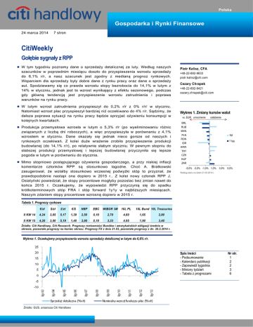 Polska Gospodarka i Rynki Finansowe 24 marca 2014 7 stron CitiWeekly Gołębie sygnały z RPP W tym tygodniu poznamy dane o sprzedaży detalicznej za luty. Według naszych szacunków w poprzednim miesiącu doszło do przyspieszenia wzrostu sprzedaży do 6,1% r/r, a nasz szacunek jest zgodny z medianą prognoz rynkowych. Wsparciem dla sprzedaży były dobre dane z rynku pracy oraz dane o sprzedaży aut. Spodziewamy się co prawda wzrostu stopy bezrobocia do 14,1% w lutym z 14% w styczniu, jednak jest to wzrost wynikający z efektu sezonowego, podczas gdy główną tendencją jest przyspieszenie wzrostu zatrudnienia i poprawa warunków na rynku pracy. W lutym wzrost zatrudnienia przyspieszył do 0,2% r/r z 0% r/r/ w styczniu. Natomiast wzrost płac przyspieszył bardziej niż oczekiwano do 4% r/r. Sądzimy, że dalsza poprawa sytuacji na rynku pracy będzie sprzyjać ożywieniu konsumpcji w kolejnych kwartałach. Produkcja przemysłowa wzrosła w lutym o 5,3% r/r (po wyeliminowaniu różnic związanych z liczbą dni roboczych), a więc przyspieszyła w porównaniu z 4,1% wzrostem w styczniu. Dane okazały się jednak nieco gorsze od naszych i rynkowych oczekiwań. Z kolei duże wrażenie zrobiło przyspieszenie produkcji budowlanej (do 14,1% r/r), po relatywnie słabym styczniu. W pewnym stopniu do słabszej produkcji przemysłowej i lepszej budowlanej przyczyniła się lepsze pogoda w lutym w porównaniu do stycznia. Mimo stopniowo postępującego ożywienia gospodarczego, a przy niskiej inflacji komentarze członków RPP są stosunkowo łagodne. Choć A. Bratkowski zasugerował, że wolałby stosunkowo wczesnej podwyżki stóp to przyznał, że prawdopodobnie nastapi ona dopiero w 2015 r.. Z kolei nowy członek RPP J. Osiatyński powiedział, że stopy procentowe mogłyby pozostac bez zmian nawet do końca 2015 r. Oczekujemy, że wypowiedzi RPP przyczynią się do spadku krótkoterminowych stóp FRA i stóp forward 1y1y w najbliższych miesiącach. Naszym zdaniem stopy procentowe wzrosną dopiero w 2015 r. Piotr Kalisz, CFA +48-22-692-9633 [email protected] Cezary Chrapek +48-22-692-9421 [email protected] Wykres 1. Zmiany kursów walut vs. EUR umocnienie osłabienie BRL RUB MXN PLN RON IDR KRW TRY CZK HUF ZAR 1M 1 tyg. -5,0% -3,0% -1,0% 1,0% 3,0% 5,0% Według stanu na dzień 21.03.2014 r. Tabela 1. Prognozy rynkowe €/zł $/zł £/zł €/$ NBP EBC WIBOR 3M 10L PL 10L Bund 10L Treasuries II KW 14 4,24 3,05 5,17 1,39 2,50 0,10 2,70 4,60 1,65 2,80 II KW 15 4,20 3,00 5,19 1,40 3,00 0,10 3,33 4,95 1,90 3,40 Źródło: Citi Handlowy, Citi Research. Prognozy rentowności Bundów i amerykańskich obligacji średnio w okresie, pozostałe prognozy na koniec okresu. Prognozy FX z dnia 21.03, pozostałe prognozy z dn. 26.2.2014 r. Wykres 1. Oczekujemy przyspieszenia wzrostu sprzedaży detalicznej w lutym do 6,6% r/r. Spis treści - Podsumowanie - Kalendarz publikacji - Zapowiedź tygodnia - Miniony tydzień - Tabela z prognozami Źródło: GUS, prognoza Citi Handlowy Nr str. 1 2 2 3 6 CitiWeekly 24/03/2014 Kalendarz publikacji Godz. publikacji Kraj Informacja 24 mar jednostka Okres Prognoza Citi Konsensus rynkowy Poprzednia wartość PONIEDZIAŁEK 09:58 EMU Wstępny indeks PMI dla przemysłu pkt III 53,5 53,2 53,2 09:58 EMU Wstępny indeks PMI dla usług pkt III 52,1 52,6 52,6 14:58 USA Wstępny indeks PMI dla przemysłu pkt III 56,6 57,1 % r/r II 6,6 6,0 4,8 25 mar WTOREK 10:00 PL Sprzedaż detaliczna 10:00 PL Stopa bezrobocia % II 14,1 14,1 14,0 10:00 DE Indeks Ifo pkt III 110,1 110,9 111,3 14:00 USA Indeks cen domów Case-Shiler % r/r III 13,3 13,4 15:00 USA Zaufanie konsumentów pkt III 79,0 78,7 78,1 15:00 USA Sprzedaż nowych domów tys. III 475 447 468 26 mar ŚRODA 08:00 DE Indeks Gfk pkt IV 14:30 USA Zamówienia na dobra trwałe % II 14:58 USA Wstępny indeks PMI dla usług pkt III 27 mar 8,5 0,0 1,1 -1,0 54,2 53,3 CZWARTEK 10:00 EMU Podaż pieniądza % r/r II 1,2 1,3 1,2 13:30 USA Liczba nowych bezrobotnych tys. tyg. 320 326 320 13:30 USA PKB tys. IV kw. 2,8 2,7 16:00 USA Niesfinalizowana sprzedaż domów % r/r II 28 mar -9,0 PIĄTEK 11:00 EMU Zaufanie konsumentów pkt III 101,5 101,3 101,2 13:30 USA Dochody konsumentów % m/m II 0,1 0,4 0,3 14:30 USA Wydatki konsumentów % m/m II 0,3 0,3 0,4 15:55 USA Indeks nastrojów Michigan pkt III 81,5 80,6 81,6 Źródło: Reuters, Bloomberg, Parkiet, urzędy statystyczne, banki centralne, prognozy Citi Wystąpienia członków FOMC: Lockhart, Plosser (wtorek), Bullard (środa, czwartek), Pianalto (czwartek), George (piątek) Zapowiedź tygodnia Sprzedaż detaliczna W lutym oczekujemy przyspieszenia wzrostu sprzedaży detalicznej do 6,6% r/r z 4,8% r/r w styczniu. Nasza prognoza jest nieznaczniej powyżej rynkowego kosnensusu na poziomie 6%. Wspierają ją stopniowo poprawiająca się sytuacja na rynku pracy, a szczególnie lepsze od oczekiwań dane o płacach za luty. Jednocześnie pozytywnym czynnikiem jest dalsze przyspieszenie wzrostu kredytów i poprawa zaufania konsumentów. W lutym dodatkowym czynnikiem zwiększającym sprzedaż może być sprzedaż samochodów ze względu na czasowe zawieszenie 2 CitiWeekly 24/03/2014 ograniczenia na odpisy VAT od aut „z kratką”. W drugą stronę oddziaływać będzie niższa od oczekiwań inflacja za luty. Miniony tydzień Produkcja oraz płace wyraźnie w górę Produkcja przemysłowa wzrosła w lutym o 5,3% r/r (po wyeliminowaniu różnic związanych z liczbą dni roboczych), a więc przyspieszyła w porównaniu z 4,1% wzrostem w styczniu. Dane okazały się jednak nieco gorsze od naszych i rynkowych oczekiwań. Wyraźną poprawę odnotowano w przetwórstwie przemysłowym, podczas gdy spadki odnotowano w wytwarzaniu i zaopatrywaniu w energię elektryczną, gaz oraz wodę, co było zapewne związane z łagodniejszymi niż rok wcześniej warunkami pogodowymi. Duże wrażenie robi przyspieszenie produkcji budowlanej (do 14,1% r/r), po relatywnie słabym styczniu. Złożyła się na to poprawa w firmach 