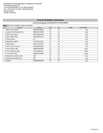 Państwowe Przedsiębiorstwo Odzieżowe "RAKON" ZK Herby Kantyna-14 J.Von Eichendorffa 14, 47-400 Racibórz Tel.: 32 415 44 43, NIP: 639-000-26-93 nazwa banku, numer rachunku Cennik Artykuły Tytoniowe cennik obowiązuje od 2016-04-01 do 2016-06-30 Opis: Ceny artykułów mogą ulec zmianie. Lp VAT Jm 1 Bibułki Huzar 50szt Nazwa 5908309530905 Symbol 23 szt. Uwagi Cena brutto 1,00 2 Cygaro olsen/Gringo/Kotva 5998242100686 23 szt. 2,50 3 Gilzy Fenix 500szt 5902768823042 23 szt. 8,00 4 Gilzy WRB 100szt. 5908278573316 23 szt. 2,00 5 Lufka szklana 46 23 szt. 0,40 6 Napełniarka MB-01 8710732216724 23 szt. 9,50 7 Papierośnica 5907221627557 23 szt. 9,00 8 Tyton verso xxl 2016 5908249938250 23 szt. 7,50 9 Tytoń Guliwer 90g 5908249934603 23 szt. 38,00 10 Tytoń P&S black 80g 4030700064381 23 szt. 39,99 11 Tytoń RGD 145g 5903621032656 23 szt. 66,95 12 Zapalniczka elektroniczna 108 23 szt. 2,50 13 Zapalniczka krzesiwowa 844 23 szt. 1,50 14 Zapałki 5908280900025 23 szt. 0,20 2016-03-29