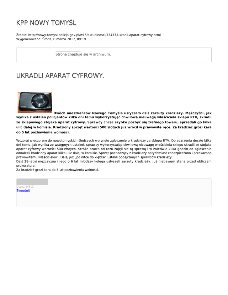 KPP NOWY TOMYŚL Źródło: http://nowy-tomysl.policja.gov.pl/w15/aktualnosci/73433,Ukradli-aparat-cyfrowy.html Wygenerowano: Środa, 8 marca 2017, 09:19 Strona znajduje się w archiwum. UKRADLI APARAT CYFROWY. Dwóch mieszkańców Nowego Tomyśla usłyszało dziś zarzuty kradzieży. Mężczyźni, jak wynika z ustaleń policjantów kilka dni temu wykorzystując chwilową nieuwagę właściciela sklepu RTV, skradli ze sklepowego stojaka aparat cyfrowy. Sprawcy chcąc szybko pozbyć się trefnego towaru, sprzedali go kilka ulic dalej w komisie. Kradziony sprzęt wartości 500 złotych już wrócił w prawowite ręce. Za kradzież grozi kara do 5 lat pozbawienia wolności. Wczoraj wieczorem do nowotomyskich śledczych wpłynęło zgłoszenie o kradzieży ze sklepu RTV. Do zdarzenia doszło kilka dni temu. Jak wynika ze wstępnych ustaleń, sprawcy wykorzystując chwilową nieuwagę właściciela sklepu skradli ze stojaka aparat cyfrowy wartości 500 złotych. Stróże prawa od razu zajęli się tą sprawą i w zaledwie kilka godzin od zgłoszenia odnaleźli kradziony aparat kilka ulic dalej w komisie. Sprzęt pochodzący z kradzieży natychmiast zabezpieczono i przekazano prawowitemu właścicielowi. Dalej już „po nitce do kłębka” ustalili podejrzanych sprawców kradzieży. Dziś 28-letni mężczyzna i jego o 6 lat młodszy kolega usłyszeli zarzuty kradzieży. Już niebawem staną przed obliczem prokuratora. Za kradzież grozi kara do 5 lat pozbawienia wolności. Ocena: 0/5 (0) Tweetnij