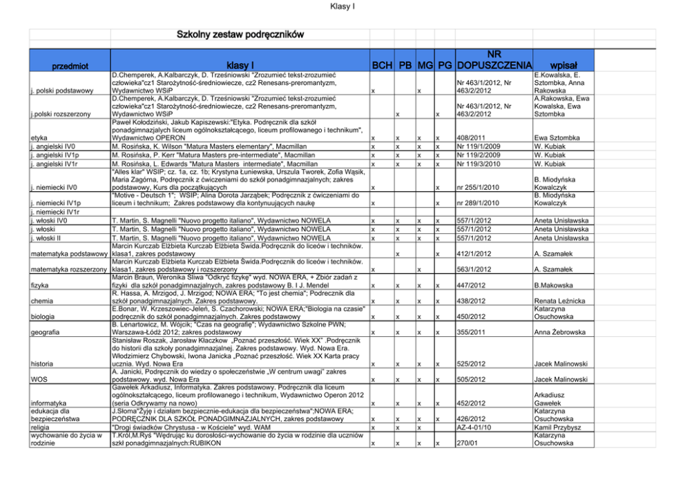 Klasy I Szkolny zestaw podręczników przedmiot j. polski podstawowy j.polski rozszerzony etyka j. angielski IV0 j. angielski IV1p j. angielski IV1r j. niemiecki IV0 j. niemiecki IV1p j. niemiecki IV1r j. włoski IV0 j. włoski j. włoski II klasy I D.Chemperek, A.Kalbarczyk, D. Trześniowski "Zrozumieć tekst-zrozumieć człowieka"cz1 Starożytność-średniowiecze, cz2 Renesans-preromantyzm, Wydawnictwo WSiP D.Chemperek, A.Kalbarczyk, D. Trześniowski "Zrozumieć tekst-zrozumieć człowieka"cz1 Starożytność-średniowiecze, cz2 Renesans-preromantyzm, Wydawnictwo WSiP Paweł Kołodziński, Jakub Kapiszewski:"Etyka. Podręcznik dla szkół ponadgimnazjalych liceum ogólnokształcącego, liceum profilowanego i technikum", Wydawnictwo OPERON M. Rosińska, K. Wilson "Matura Masters elementary", Macmillan M. Rosińska, P. Kerr "Matura Masters pre-intermediate", Macmillan M. Rosińska, L. Edwards "Matura Masters intermediate", Macmillan "Alles klar" WSIP; cz. 1a, cz. 1b; Krystyna Łuniewska, Urszula Tworek, Zofia Wąsik, Maria Zagórna, Podręcznik z ćwiczeniami do szkół ponadgimnazjalnych; zakres podstawowy, Kurs dla początkujących "Motive - Deutsch 1"; WSIP; Alina Dorota Jarząbek; Podręcznik z ćwiczeniami do liceum i technikum; Zakres podstawowy dla kontynuujących naukę T. Martin, S. Magnelli "Nuovo progetto italiano", Wydawnictwo NOWELA T. Martin, S. Magnelli "Nuovo progetto italiano", Wydawnictwo NOWELA T. Martin, S. Magnelli "Nuovo progetto italiano", Wydawnictwo NOWELA Marcin Kurczab Elżbieta Kurczab Elżbieta Świda.Podręcznik do liceów i techników. matematyka podstawowy klasa1, zakres podstawowy Marcin Kurczab Elżbieta Kurczab Elżbieta Świda.Podręcznik do liceów i techników. matematyka rozszerzony klasa1, zakres podstawowy i rozszerzony Marcin Braun, Weronika Śliwa "Odkryć fizykę" wyd. NOWA ERA, + Zbiór zadań z fizyka fizyki dla szkół ponadgimnazjalnych, zakres podstawowy B. I J. Mendel R. Hassa, A. Mrzigod, J. Mrzigod; NOWA ERA; "To jest chemia"; Podrecznik dla chemia szkół ponadgimnazjalnych. Zakres podstawowy. E.Bonar, W. Krzeszowiec-Jeleń, S. Czachorowski; NOWA ERA;"Biologia na czasie" biologia podręcznik do szkół ponadgimnazjalnych. Zakres podstawowy B. Lenartowicz, M. Wójcik; "Czas na geografię"; Wydawnictwo Szkolne PWN; geografia Warszawa-Łódź 2012; zakres podstawowy Stanisław Roszak, Jarosław Kłaczkow „Poznać przeszłość. Wiek XX” .Podręcznik do historii dla szkoły ponadgimnazjalnej. Zakres podstawowy. Wyd. Nowa Era. Włodzimierz Chybowski, Iwona Janicka „Poznać przeszłość. Wiek XX Karta pracy historia ucznia. Wyd. Nowa Era A. Janicki, Podręcznik do wiedzy o społeczeństwie „W centrum uwagi” zakres WOS podstawowy. wyd. Nowa Era Gawełek Arkadiusz, Informatyka. Zakres podstawowy. Podręcznik dla liceum ogólnokształcącego, liceum profilowanego i technikum, Wydawnictwo Operon 2012 informatyka (seria Odkrywamy na nowo) edukacja dla J.Słoma"Żyję i działam bezpiecznie-edukacja dla bezpieczeństwa";NOWA ERA; bezpieczeństwa PODRĘCZNIK DLA SZKÓŁ PONADGIMNAZJALNYCH, zakres podstawowy religia "Drogi świadków Chrystusa - w Kościele" wyd. WAM wychowanie do życia w T.Król,M.Ryś "Wędrując ku dorosłości-wychowanie do życia w rodzinie dla uczniów rodzinie szkł ponadgimnazjalnych:RUBIKON NR BCH PB MG PG DOPUSZCZENIA wpisał x Nr 463/1/2012, Nr 463/2/2012 E.Kowalska, E. Sztombka, Anna Rakowska A.Rakowska, Ewa Kowalska, Ewa Sztombka x x x x 408/2011 Nr 119/1/2009 Nr 119/2/2009 Nr 119/3/2010 Ewa Sztombka W. Kubiak W. Kubiak W. Kubiak x x nr 255/1/2010 x x nr 289/1/2010 B. Miodyńska Kowalczyk B. Miodyńska Kowalczyk x x x 557/1/2012 557/1/2012 557/1/2012 Aneta Unisławska Aneta Unisławska Aneta Unisławska x 412/1/2012 A. Szamałek 563/1/2012 A. Szamałek x x x x x x x x x Nr 463/1/2012, Nr 463/2/2012 x x x x x x x x x x x x x x x x x x x x x x 447/2012 B.Makowska x x x x 438/2012 x x x x 450/2012 Renata Leźnicka Katarzyna Osuchowska x x x x 355/2011 Anna Żebrowska x x x x 525/2012 Jacek Malinowski x x x x 505/2012 Jacek Malinowski x x x x 452/2012 x x x x x x x 426/2012 AZ-4-01/10 x x x x 270/01 Arkadiusz Gawełek Katarzyna Osuchowska Kamil Przybysz Katarzyna Osuchowska Klasy I podstawy przedsiębiorczości wiedza o kulturze Zbigniew Makieła, Tomasz Rachwał, Krok w przedsiębiorczość. Podręcznik do podstaw przedsiębiorczości dla szkół ponadgimnazjalnych, wyd. Nowa Era. Zbigniew Makieła, Tomasz Rachwał, Krok w przedsiębiorczość. Zeszyt ćwiczeń, wyd Nowa Era Monika Bokiniec, Barbara Forysiewicz, Jacek Michałowski, Natalia MrozkowiakNastrożna, Grzegorz Nazaruk, magdalena Sacha, Grazyna Świętochowska "Spotkania z kulturą. Podręcznik do wiedzy o kulturze dla liceum i technikum" (Wydawnictwo NOWA ERA) x x x x 467/2012 Jacek Malinowski x x x x 449/2012 Ewa Sztombka, Anna Rakowska klasy II Szkolny zestaw podręczników 2012/2013 przedmiot j. polski j.polski etyka klasy II A.Nawarecki, D.Siwicka, E.Paczoska "Przeszłość to dziś" Wyd. Stentor K.Biedrzycki, D.Pasieka, B.Pędracka "Opowieśc o człowieku" Wyd.ZNAK Paweł Kołodziński, Jakub Kapiszewski "Etyka.Podręcznik dla liceum ogólnokształcącego, liceum profilowanego i technikum", Operon, Gdynia 2008 NR H B M DOPUSZCZENIA x x Nr 199/03 Nr 110/03 x x x x wpisał E.Kowalska, A. Rakowska A.Rakowska j. angielski I j. angielski II j. niemiecki I "Matura Masters", Macmillan - zależnie od poziomu grupy M. Rosińska, P. Kerr "Matura Masters pre-intermediate ", Macmillan x x x x x x 408/2011 Nr 119/2/2009 , 119/3/2010, 119/4/2011 Nr 119/2/2009 j. niemiecki II j. włoski j. włoski II j. francuski j. francuski II "Hier und da" cz.2 Wydawnictwo Szkolne PWN x x x B.Miodyńska 130/06; DKOS-5002-51/03 Kowalczyk T. Martin, S. Magnelli "Nuovo progetto italiano" G. Capelle, R. Menand "Le nouveau taxi!", wydawnicwto HACHETTE G. Capelle, R. Menand "Le nouveau taxi!", wydawnicwto HACHETTE Małgorzata Wiatr-Kmieciak, Sławomira Wujec: Вот и мы 2, Wy
