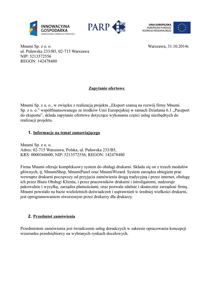 Mnumi Sp. z oo Warszawa, 31.10.2014r. ul. Puławska 233/B5, 02
