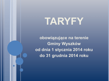 TARYFY obowiązujące na terenie Gminy Wyszków od dnia 1 stycznia 2014 roku do 31 grudnia 2014 roku Taryfy przygotowane są na podstawie zasad określonych artykułach 20-23 Ustawy z dnia 7.06.2001 roku w o zbiorowym zaopatrzeniu w wodę i zbiorowym odprowadzeniu ścieków z późniejszymi zmianami ( Dz. U. z 2006r Nr 123 poz. 858 z późn.zm.) oraz przepisami Rozporządzenia Ministra Budownictwa z dnia 28 czerwca 2006 roku w sprawie określenia taryf, wzoru wniosku o zatwierdzenie taryf oraz warunków rozliczeń za zbiorowe zaopatrzenie w wodę i zbiorowe odprowadzanie ścieków ( Dz. U. Nr 127, poz. 886) W skład taryfy wchodzi: Cena za m³ dostarczanej wody, Cena za m ³ odprowadzanych ścieków, Opłata abonamentowa na odbiorcę, Opłata przyłączeniowa, Opłata za przekroczenia warunków wprowadzania ścieków przemysłowych do urządzeń kanalizacyjnych. GRUPY ODBIORCÓW Odbiorcy wody jedna grupa odbiorców Dostarczający ścieki dwie grupy odbiorców: • gospodarstwa domowe • pozostali odbiorcy SPOSÓB ROZLICZANIA Odbiorcy rozliczani według wodomierza głównego lub urządzenia pomiarowego, Odbiorcy rozliczani według przeciętnych norm zużycia. OKRES ROZLICZENIOWY 1 miesięczny, 3 miesięczny. Cenę kształtują : Planowane koszty, Marża zysku, Ilość ( w m³) sprzedanej wody lub dostarczonych ścieków, Podatek VAT wg obowiązujących przepisów ( 8%). Planowane koszty określa się według kosztów za 4 miesiące 2012 roku i za 8 miesięcy 2013 roku z uwzględnieniem planowanych zmian w 2014 roku. Na koszty ma wpływ: rozwój ( budowa) i modernizacja urządzeń wod-kan, które w szczególności wpływają na koszty: - podatków i opłat, - amortyzacji, - eksploatacji. ilość odbiorców na kilometr sieci , zjawiska inflacyjne, które w szczególności wpływają na koszty: - materiałów i energii, - wynagrodzenia, - usług obcych. Opłatę abonamentową kształtują: Planowane koszty : • gotowości Spółki do świadczenia usług, • odczytu wodomierzy, • rozliczenie należności, Marża zysku, Ilość odczytów wodomierzy lub urządzeń pomiarowych na odbiorcę, Podatek VAT. Ustawa zabrania subsydiowania skrośnego ( tj. pokrywanie kosztów dotyczących jednego rodzaju prowadzonej przez przedsiębiorstwo wodociągowo-kanalizacyjne działalności gospodarczej lub jednej z grup taryfowych odbiorców usług przychodami pochodzącymi z innego rodzaju prowadzonej działalności gospodarczej lub od innej taryfowej grupy odbiorców.) Przykład rozwoju Spółki Porównanie wartości rzeczowych środków trwałych, kosztów amortyzacji oraz kosztów podatków i opłat w latach 2006 – 2012 Rzeczowe środki trwałe to : • Nowe sieci wod-kan przekazane aportem i umową użyczenia przez Gminę Wyszków oraz wykonane przez PWiK Sp. z o.o., • Przebudowana Oczyszczalnia Ścieków w Rybienku Starym, • Przebudowana Stacja Uzdatniania Wody w Wyszkowie, • I inne. Koszty amortyzacji – odpisy od wartości początkowej środków trwałych zgodnie z ustawą o rachunkowości i podatku dochodowym od osób prawnych. Koszty podatków i opłat – to koszty podatku od nieruchomości, opłata za wieczyste użytkowanie gruntu, podatek od środków transportu i opłata na rzecz ochrony środowiska. 2006 Rzeczowe środki trwałe Koszty amortyzacji Podatki i opłaty w tym podatek od nieruchomości 2012 22.435.083,00 zł 41.694.620,00 zł 1.477.186,00 zł 2.901.484,00 zł 947.733,00 zł 1.304.865,00 zł W Taryfie na 2014 rok uwzględniono dane z roku obrachunkowego 2012, 2013 oraz zastosowano: wzrost wynagrodzeń na poziomie 3,5 %, pomimo planowanego wzrostu wynagrodzenia o wskaźnik inflacyjny ogólne koszty wynagrodzenia planuje się na niższym poziomie w 2014 roku niż w 2013 roku ( mniejsze zatrudnienie). opłaty za korzystanie ze środowiska według obowiązujących przepisów, wskaźnik wzrostu materiałów i usług 2,3 %, obniżenie kosztów energii elektrycznej o 5 % w stosunku do 2013 roku, stawki podatku od nieruchomości od urządzeń kanalizacyjnych i wodociągowych 2 %, pozostały podatek od nieruchomości zgodnie z Uchwałą Rady Miejskiej na 2014 rok, marże zysku na poziomie 2 %. Przyjęto ilościową roczną sprzedaż : • wody 1 390 000 m³ • ścieków 1 090 000 m³ Porównanie taryfy na 2013 i 2014 na wodę i ścieki od 01.01.2014 do 31.12.2014 dla gospodarstw domowych i pozostałych odbiorców Podane ceny są cenami brutto (VAT 8%) Dla gospodarstw domowych Pozostali odbiorcy 2013 2014 2013 2014 Cena za wodę (zł/m³) 3,06 3,20 3,06 3,20 Cena za ścieki (zł/m³) 5,95 6,06 7,73 8,05 Za okres rozliczeniowy Opłaty 1 miesięczny 3 miesięczny 2013 2014 2013 2014 Opłata abonamentowa za wodę (zł) 16,16 17,04 18,18 18,46 Opłata abonamentowa za ścieki (zł) 14,97 15,92 18,17 18,26 Opłata za wodę i ścieki (zł) 23,59 25,04 28,80 28,80 Opłata abonamentowa za dodatkowy wodomierz (zł) 16,16 17,04 18,18 18,46 dla odbiorców rozliczanych wg przeciętnych norm zużycia dla gospodarstw domowych pozostali odbiorcy 2013 2014 2013 2014 Cena za wodę (zł/m³) 3,06 3,20 3,06 3,20 Cena za ścieki (zł/m³) 5,95 6,06 7,73 8,05 Za okres rozliczeniowy Opłaty 1 miesięczny 3 miesięczny 2013 2014 2013 2014 Opłata abonamentowa za wodę (zł) 8,62 9,13 10,64 10,54 Opłata abonamentowa za ścieki (zł) 7,43 8,00 10,63 10,35 Opłata abonamentowa za wodę i ścieki (zł) 16,05 17,00 18,18 20,89 Taryfy opracowywane są w cenach netto ( bez podatku VAT) Porównanie taryf Cena za wodę w zł/m³ 2013 2014 2,83 2,96 ZMIANA w zł/m³ % 0,13 4,59 Główne przyczyny wzrostu : Wzrost wartości amortyzacji i podatku od nieruchomości, który wynika : • z naliczenia w 2013 roku kosztów amortyzacji od przebudowanej Stacji Wodociągowej przez 11 miesięcy a nie 12, gdyż była ona przekazana do użytkowania w styczniu 2013r, • z nowo przyjętych ( wybudowanych) sieci wodociągowych. Wzrost amortyzacji o 106.181 zł – daje wzrost ceny o 0,08 zł/m³ Wzrost podatku od nieruchomości 