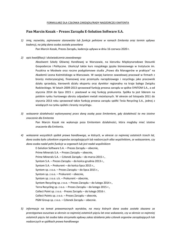 FORMULARZ DLA CZŁONKA ZARZĄDU/RADY NADZORCZEJ EMITENTA Pan Marcin Kozak – Prezes Zarządu E-Solution Software S.A. 1) imię, nazwisko, zajmowane stanowisko lub funkcje pełnione w ramach Emitenta oraz termin upływu kadencji, na jaką dana osoba została powołana Pan Marcin Kozak, Prezes Zarządu, kadencja upływa w dniu 16 czerwca 2020 r. 2) opis kwalifikacji i doświadczenia zawodowego Absolwent Szkoły Głównej Handlowej w Warszawie, na kierunku Międzynarodowe Stosunki Gospodarcze i Polityczne. Ukończył także kurs rosyjskiego języka biznesowego w Instytucie im. Puszkina w Moskwie oraz roczne podyplomowe studia „Prawo dla Managerów w praktyce” na Akademii Leona Koźmińskiego w Warszawie. W swojej karierze zawodowej pracował w firmach z branży motoryzacyjnej, finansowej oraz przemysłu narzędziowego i recyclingu jako pracownik działu sprzedaży, kierownik działu eksportu oraz dyrektor regionalny na kraje byłego Związku Radzieckiego. W latach 2009-2013 sprawował funkcję prezesa zarządu w spółce SYNTOM S.A., a od stycznia 2014 do lipca 2015 r. piastował w niej funkcję prokurenta. Spółka ta jest liderem na polskim rynku hurtowego obrotu odpadami metali nieżelaznych. W okresie od listopada 2011 do stycznia 2013 roku sprawował także funkcję prezesa zarządu spółki Tesla Recycling S.A., jednej z wiodących na rynku spółek z branży recyclingu. 3) wskazanie działalności wykonywanej przez daną osobę poza Emitentem, gdy działalność ta ma istotne znaczenie dla Emitenta Pan Marcin Kozak nie wykonuje poza Emitentem działalności, która mogłaby mieć istotne znaczenie dla Emitenta. 4) wskazanie wszystkich spółek prawa handlowego, w których, w okresie co najmniej ostatnich trzech lat, dana osoba była członkiem organów zarządzających lub nadzorczych albo wspólnikiem, ze wskazaniem, czy dana osoba nadal pełni funkcje w organach lub jest nadal wspólnikiem E-Solution Software S.A. – Prezes Zarządu – obecnie, Prime Minerals S.A. – Prezes Zarządu – obecnie, Prime Minerals S.A. – Członek Zarządu – do marca 2015 r., Syntom S.A. – Prezes Zarządu – do końca grudnia 2013 r., Syntom S.A. – Prokurent – do końca lipca 2015 r., Syntom sp. z o.o. – Prezes Zarządu – do lipca 2015 r., Syntom sp. z o.o. – Prokurent – obecnie, Syntom sp. z o.o. s.k. – Prokurent – obecnie, Syntom Recycling sp. z o.o. – Prezes Zarządu – do lutego 2014 r., Terra Recycling sp. z o.o. – Prezes Zarządu – do lutego 2015 r., Collect Point sp. z o.o. - Prezes Zarządu – do lutego 2016 r. Collect Points sp. z o.o. – Prezes Zarządu – obecnie, PGM Group sp. z o.o. – Członek Zarządu – obecnie. 5) informacje na temat prawomocnych wyroków, na mocy których dana osoba została skazana za przestępstwa oszustwa w okresie co najmniej ostatnich pięciu lat oraz wskazanie, czy w okresie co najmniej ostatnich pięciu lat osoba taka otrzymała sądowy zakaz działania jako członek organów zarządzających lub nadzorczych w spółkach prawa handlowego W okresie ostatnich pięciu lat Pan Marcin Kozak nie został skazany za przestępstwa oszustwa oraz nie orzeczono sądowego zakazu działania jako członek organów zarządzających lub nadzorczych w spółkach prawa handlowego. 6) szczegóły wszystkich przypadków upadłości, zarządu komisarycznego lub likwidacji, w okresie co najmniej ostatnich pięciu lat, w odniesieniu do podmiotów, w których dana osoba pełniła funkcje członka organu zarządzającego lub nadzorczego W okresie ostatnich pięciu lat nie wystąpiły przypadki upadłości, zarządu komisarycznego lub likwidacji w odniesieniu do podmiotów, w których Pan Marcin Kozak pełnił funkcje członka organu zarządzającego lub nadzorczego. 7) informacja, czy dana osoba prowadzi działalność, która jest konkurencyjna w stosunku do działalności emitenta, oraz czy jest wspólnikiem konkurencyjnej spółki cywilnej lub osobowej albo członkiem organu spółki kapitałowej lub członkiem organu jakiejkolwiek konkurencyjnej osoby prawnej Pan Marcin Kozak nie prowadzi działalności, która jest konkurencyjna w stosunku do działalności emitenta oraz nie jest wspólnikiem konkurencyjnej spółki cywilnej ani członkiem organu spółki kapitałowej lub członkiem organu jakiejkolwiek konkurencyjnej osoby prawnej. 8) informacja, czy dana osoba figuruje w rejestrze dłużników niewypłacalnych, prowadzonym na podstawie ustawy z dnia 20 sierpnia 1997 r. o Krajowym Rejestrze Sądowym Pan Marcin Kozak nie figuruje w rejestrze dłużników niewypłacalnych, prowadzonym na podstawie ustawy z dnia 20 sierpnia 1997 r. o Krajowym Rejestrze Sądowym.