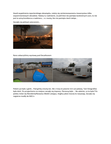 Gwoli wypełnienia reporterskiego obowiązku, należy się zainteresowanemu towarzystwu kilka wspomnieniowych obrazków. Należy tu nadmienić, że jeśli ktoś nie pamięta konkretnych scen, to nie jest to winą kronikarza a nadmiaru… a z resztą, kto nie pamięta niech żałuje… Zaczęło się późnym wieczorem… Rano zobaczyliśmy wystawę pod Decathonem Potem już było z górki… Pod górkę zresztą też. Ale z trasy to pewnie inni coś pokażą. Tam fotografów było dość. Po przyjechaniu na miejsce zaczęły się imprezy. Pierwszą było … No właśnie, co to było? Po polsku mówi się Niezidentyfikowany Obiekt Latający. Anglicy jakoś inaczej to nazywają. Zaczęły się najpierw modły do NOL’a Niektórzy próbowali go strącić… Pojawił się mistrz ceremonii… Nie, no to nie tak!!! Poczekajcie, wdzieję strój odpowiedni… I wdział… I radości nie było końca… I modły poprowadził… Za jego śladem poszli następcy… I stało się… NOL pozwolił wiernym lewitować… Obserwatorzy jednak zachwyceni nie byli Dzieci jednak uniesienia religijne dorosłych niezbyt interesowały… Tak intensywne odczucia musiały jednak odbić się na zdrowiu wiernych. Służba zdrowia, tym razem dopisała… Nastąpił wieczór, a wraz z nim pojawili się nowi goście… No i oczywiście sam… Choć później… Co się działo po drodze – nie wnikajmy w szczegóły. Kilka kadrów z nocy… Podobno w nocy jeszcze miała dodatkową akcję służba zdrowia, ale tego kronikarz nie odnotował. Za to następnego dnia należało przygotować odpowiedni posiłek. Ilu było kucharzy… trudno zliczyć. Nie wszyscy pozwolili uwiecznić się. Jedni chętnie brali się do pracy… Inni starali się sprawiać dobre wrażenie. Jednak jak doszło do dzielenia mięska… to pojawili się chętni do skonsumowania przed przygotowaniem… Praca paliła się w rękach, więc należało czasem nieco ostudzić pracujących Jednak w większości dawali sobie radę sami. Proszę samemu sobie dopisać treść pytania w oczach Nadzór oczywiście musiał być, inaczej by się praca nie udała! W końcu trzeba rozpalić ognisko Walnie w palec, czy nie??? Zdjęć ze zjadania nie będzie… Zbyt pyszne były. Za to po jedzeniu niektórzy chcieli sprawdzać, czy jeszcze znajdzie się miejsce na więcej. Tylko, czemu nie u siebie? Nadszedł wieczór. Podobno jakiś mecz był? Kolejny dzień, to już dzień odjazdu. O mały włos zapomnielibyśmy o zdjęciu grupowym. Ale na szybko pojawiło się hasło – za 5 minut zdjęcie i… zdążyliśmy!