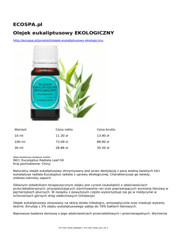 ECOSPA.pl Olejek eukaliptusowy EKOLOGICZNY http://ecospa.pl/produkt/olejek-eukaliptusowy-ekologiczny Wariant Cena netto Cena brutto 10 ml 11.30 zł 13.90 zł 100 ml 73.09 zł 89.90 zł 30 ml 28.86 zł 35.50 zł Olejek eukaliptusowy ekologiczny (radiata) INCI: Eucalyptus Radiata Leaf Oil Kraj pochodzenia: Chiny Naturalny olejek eukaliptusowy otrzymywany jest przez destylację z parą wodną świeżych liści eukaliptusa radiata Eucalyptus radiata z uprawy ekologicznej. Charakteryzuje go świeży, ziołowo-ziemisty zapach. Głównym składnikiem terapeutycznym olejku jest cyneol (eukaliptol) o właściwościach przeciwbakteryjnych, przyspieszających ziarninowanie ran oraz poprawiających wymianę tlenową w pęcherzykach płucnych. W związku z powyższym często wykorzystuje się go w medycynie w schorzeniach górnych dróg oddechowych (inhalacje). Olejek eukaliptusowy stosowany na skórę działa chłodząco, antyseptycznie oraz niweluje wykwity skórne. Emulsja z 2% olejku eukaliptusowego zabija do 70% bakterii tlenowych. Najnowsze badania donoszą o jego właściwościach przeciwbólowych i przeciwzapalnych. Wymienia TXT_PDF_PAGE_NUMBER 1 TXT_PDF_PAGE_OUT_OF 2 się go również przy okazji paradontozy, gdyż tworzy na zębach ochronny, bakteriostatyczny film. Zastosowanie: inhalacje parowe – przy stanach grypopodobnych, oleje do masażu – w reumatyzmie, bólach mięśniowych, kremy po goleniu, depilacji, płyny do kąpieli, pasty do zębów, płyny do płukania ust. Uwagi: Chronić przed dziećmi. Nie stosować bezpośrednio na skórę w postaci nie rozcieńczonej. * naturalny składnik olejku eterycznego uwzględniony w wykazie INCI zgodnie z 7 poprawką do Dyrektywny Kosmetycznej UE TXT_PDF_PAGE_NUMBER 2 TXT_PDF_PAGE_OUT_OF 2