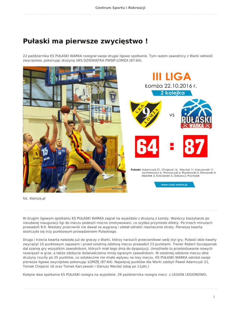 Centrum Sportu i Rekreacji Pułaski ma pierwsze zwycięstwo ! 22 października KS PUŁASKI WARKA rozegrał swoje drugie ligowe spotkanie. Tym razem zawodnicy z Warki odnieśli zwycięstwo, pokonując drużynę UKS DZIEWIĄTKA PWSIP ŁOMŻA (87:64). fot. 4lomza.pl W drugim ligowym spotkaniu KS PUŁASKI WARKA zagrał na wyjeździe z drużyną z Łomży. Wareccy koszykarze po nieudanej inauguracji ligi do meczu podeszli mocno zmotywowani, co szybko przyniosło efekty. Po trzech minutach prowadzili 9:0. Niestety przeciwnik nie dawał za wygraną i zdołał odrobić nieznacznie straty. Pierwsza kwarta skończyła się trzy punktowym prowadzeniem Pułaskiego. Druga i trzecia kwarta należała już do graczy z Warki, którzy narzucili przeciwnikowi swój styl gry. Pułaski obie kwarty zwyciężył 10 punktowym zapasem i przed ostatnią odsłoną meczu prowadził 23 punktami. Trener Robert Szczepaniak dał szansę gry wszystkim zawodnikom, których miał tego dnia do dyspozycji. Umożliwiło to przetestowanie nowych rozwiązań w grze, a także zdobycie doświadczenia mniej ogranym zawodnikom. W ostatniej odsłonie meczu obie drużyny rzuciły po 25 punktów, co ostatecznie nie miało wpływu na losy meczu. KS PUŁASKI WARKA odniósł swoje pierwsze ligowe zwycięstwo pokonując ŁOMŻĘ (87:64). Najwięcej punktów dla Warki zdobyli Paweł Adamczyk 21, Tomek Chojecki 16 oraz Tomek Karczewski i Dariusz Wecłaś (obaj po 11pkt.) Kolejne dwa spotkania KS PUŁASKI rozegra na wyjeździe. 29 października rozegra mecz z LEGION LEGIONOWO, 1 Centrum Sportu i Rekreacji następnie 5 listopada zmierzy się w Warszawie z tamtejszym HUTNIKIEM. Na mecz w Warce kibice musza poczekać do 19 listopada. Wtedy to PUŁASKI podejmie na własnym parkiecie GLKS Nadarzyn. TABELA III LIGA – Grupa A WYJAZD PKT. ZD. PKT. STR. RÓŻNICA STOSUNEK M DRUŻYNA PKT MECZE ZW. POR. 1 MUKS Hutnik 8 4 4-0 3-0 1-0 361 247 +114 1.4615 2 GLKS Nadarzyn 7 4 3-1 2-0 1-1 420 292 +128 1.4384 3 Legia Warszawa 6 4 2-2 1-0 1-2 291 283 +8 1.0283 4 KS Legion Legionowo 5 3 2-1 1-1 1-0 249 219 +30 1.1370 5 MUKS Piaseczno 4 3 1-2 0-1 1-1 198 208 -10 0.9519 6 UKS 9 PWSIP Łomża 4 4 0-4 0-2 0-2 266 426 -160 0.6244 7 KS PUŁASKI Warka 3 2 1-1 0-1 1-0 156 153 +3 1.0196 8 NOSiR 2 2 0-2 0-1 0-1 108 221 -113 0.4887 DOM 2