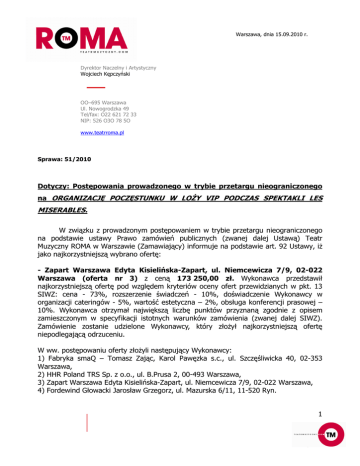 Warszawa, dnia 15.09.2010 r. Dyrektor Naczelny i Artystyczny Wojciech Kępczyński OO–695 Warszawa Ul. Nowogrodzka 49 Tel/fax: O22 621 72 33 NIP: 526 O3O 78 5O www.teatrroma.pl Sprawa: 51/2010 Dotyczy: Postępowania prowadzonego w trybie przetargu nieograniczonego na ORGANIZACJĘ POCZĘSTUNKU W LOŻY VIP PODCZAS SPEKTAKLI LES MISERABLES. W związku z prowadzonym postępowaniem w trybie przetargu nieograniczonego na podstawie ustawy Prawo zamówień publicznych (zwanej dalej Ustawą) Teatr Muzyczny ROMA w Warszawie (Zamawiający) informuje na podstawie art. 92 Ustawy, iż jako najkorzystniejszą wybrano ofertę: - Zapart Warszawa Edyta Kisielińska-Zapart, ul. Niemcewicza 7/9, 02-022 Warszawa (oferta nr 3) z ceną 173 250,00 zł. Wykonawca przedstawił najkorzystniejszą ofertę pod względem kryteriów oceny ofert przewidzianych w pkt. 13 SIWZ: cena - 73%, rozszerzenie świadczeń - 10%, doświadczenie Wykonawcy w organizacji cateringów - 5%, wartość estetyczna – 2%, obsługa konferencji prasowej – 10%. Wykonawca otrzymał największą liczbę punktów przyznaną zgodnie z opisem zamieszczonym w specyfikacji istotnych warunków zamówienia (zwanej dalej SIWZ). Zamówienie zostanie udzielone Wykonawcy, który złożył najkorzystniejszą ofertę niepodlegającą odrzuceniu. W ww. postępowaniu oferty złożyli następujący Wykonawcy: 1) Fabryka smaQ – Tomasz Zając, Karol Pawęzka s.c., ul. Szczęśliwicka 40, 02-353 Warszawa, 2) HHR Poland TRS Sp. z o.o., ul. B.Prusa 2, 00-493 Warszawa, 3) Zapart Warszawa Edyta Kisielińska-Zapart, ul. Niemcewicza 7/9, 02-022 Warszawa, 4) Fordewind Głowacki Jarosław Grzegorz, ul. Mazurska 6/11, 11-520 Ryn. 1 Streszczenie oceny i porównanie złożonych ofert wraz z punktację przyznaną ofertom: Liczba pkt w Liczba pkt Liczba pkt w kryterium Liczba pkt w Liczba pkt w w kryterium Numer kryterium DOŚWIADCZENIE kryterium WARTOŚĆ OBSŁUGA oferty kryterium ROZSZERZENIE WYKONAWCY W CENA ŚWIADCZEŃ ORGANIZACJI ESTETYCZNA KONFERENCJI PRASOWEJ CATERINGÓW 1 2 3 4 26,02 0 4 2 10 Razem pkt. 42,02 Wykonawca wykluczony. Oferta uznana za odrzuconą. 73 1 1 0 10 85 Wykonawca wykluczony. Oferta uznana za odrzuconą. Punktacja w kryterium „Cena” została przyznana na podstawie wzoru matematycznego umieszczonego w SIWZ. Oferta najkorzystniejsza cenowo Cena oferty analizowanej X 73 pkt. Punktacja w kryterium „rozszerzenie świadczeń” została przyznana na podstawie oświadczeń Wykonawców obejmujących zestawienie dodatkowych świadczeń ponad wyspecyfikowane w opisie przedmiotu zamówienia. Zamawiający przyznając punkty w ww. kryterium, kierował się oceną propozycji odnośnie dodatkowej ilość jedzenia i napojów. Punktacja w kryterium „Doświadczenie Wykonawcy w organizacji cateringów” została przyznana na podstawie spisu organizowanych cateringów wraz z dołączonymi referencjami. W ocenie nie zostały wzięte pod uwagę cateringi, do których nie został dostarczony dokument potwierdzający ich należyte wykonanie lub dołączony dokument nie wskazywał jednoznacznie na podmiot, który potwierdził należyte wykonanie. Zamawiający przyznał punktacje zgodnie z tabelą zamieszczoną w pkt. 13 SIWZ. 2 Punktacja w kryterium „Wartość estetyczna” została przyznana na podstawie prezentacji cateringu Wykonawców. Zamawiający oceniał wystrój stołu cateringowego wraz z oferowanymi potrawami i napojami. Zamawiający brał pod uwagę staranność przygotowania potraw, odpowiednie podanie napojów (we właściwych szklankach i kieliszkach), wystrój stołu oraz koncepcję rozmieszczenia potraw i napoi oraz aranżację prezentacji. Punktacja w kryterium „Obsługa konferencji prasowej” została przyznana na podstawie oświadczeń Wykonawców. Wykonawcy w ofertach złożyli oświadczenia odnośnie obsługi restauracyjnej i kelnerskiej konferencji prasowej dla 70 dziennikarzy w ramach wykonywania przedmiotowego zamówienia. Zamawiający wykluczył z przedmiotowego postępowania następujących Wykonawców: 1) HHR Poland TRS Sp. z o.o., ul. B.Prusa 2, 00-493 Warszawa. Wykonawca podlega wykluczeniu z udziału w postępowaniu na podstawie art. 24 ust. 2 pkt. 4 Ustawy tj. z powodu, iż nie wykazał spełniania warunków udziału w postępowaniu. Wykonawca nie wykazał, iż w ciągu ostatnich trzech lat przed upływem terminu składania ofert, a jeżeli okres prowadzenia działalności jest krótszy – w tym okresie – należycie zrealizował dwa kontrakty obejmujące obsługę cateringową. Załączony do oferty wykaz nie potwierdza spełnienia warunku udziału w postępowaniu polegającego na posiadaniu wiedzy i doświadczenia. Wykonawca przedstawił w wykazie tylko jeden kontrakt i tym samym nie spełnił warunku udziału w postępowaniu. Wykonawca został wezwany na podstawie art. 26 ust. 3 Ustawy do uzupełnienia dokumentów i oświadczeń potwierdzających spełnienie warunków udziału w postępowaniu. W wyznaczonym terminie Wykonawca nie uzupełnił żądanych dokumentów i oświadczeń. Zgodnie z art. 24 ust. 4 Ustawy ofertę Wykonawcy wykluczonego uznaje się za odrzuconą. 2) Fordewind Głowacki Jarosław Grzegorz, ul. Mazurska 6/11, 11-520 Ryn. Wykonawca podlega wykluczeniu z udziału w postępowaniu na podstawie art. 24 ust. 2 pkt. 4 Ustawytj. z powodu, iż nie wykazał spełniania warunków udziału w postępowaniu. Wykonawca nie wykazał, iż dysponuje opłaconą polisą, a w przypadku jej braku innym dokumentem potwierdzającym fakt ubezpieczenia od odpowiedzialności cywilnej w zakresie prowadzonej działalności związanej z przedmiotem zamówienia na kwotę nie niższą niż 50 000 zł. Do oferty została załączona kopia polisy OC firmy Kawiarnia Catering Aleksandra Mroczkowska. Firma Kawiarnia Catering Aleksandra Mroczkowska została wskazana jako podwykonawca. Zgodnie z ustawą Prawo zamówień publicznych, Wykonawca może polegać na wiedzy i doświadczeniu, potencjale technicznym, osobach zdolnych do wykona