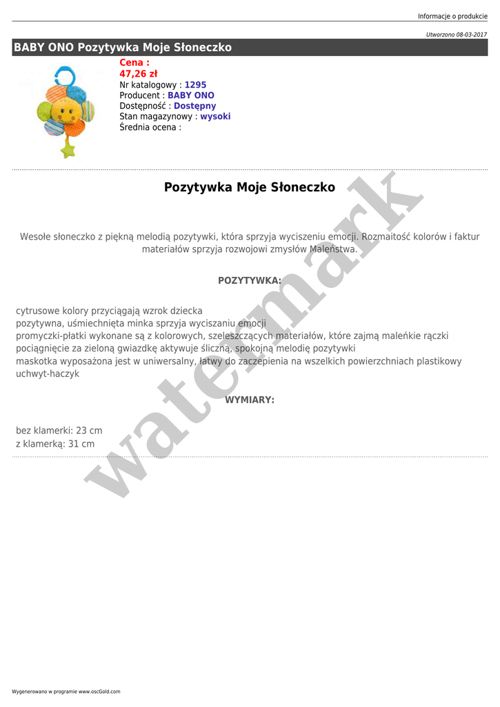 Informacje o produkcie Utworzono 08-03-2017 BABY ONO Pozytywka Moje Słoneczko Cena : 47,26 zł Nr katalogowy : 1295 Producent : BABY ONO Dostępność : Dostępny Stan magazynowy : wysoki Średnia ocena : er m ar k Pozytywka Moje Słoneczko Wesołe słoneczko z piękną melodią pozytywki, która sprzyja wyciszeniu emocji. Rozmaitość kolorów i faktur materiałów sprzyja rozwojowi zmysłów Maleństwa. POZYTYWKA: cytrusowe kolory przyciągają wzrok dziecka pozytywna, uśmiechnięta minka sprzyja wyciszaniu emocji promyczki-płatki wykonane są z kolorowych, szeleszczących materiałów, które zajmą maleńkie rączki pociągnięcie za zieloną gwiazdkę aktywuje śliczną, spokojną melodię pozytywki maskotka wyposażona jest w uniwersalny, łatwy do zaczepienia na wszelkich powierzchniach plastikowy uchwyt-haczyk at WYMIARY: w bez klamerki: 23 cm z klamerką: 31 cm Wygenerowano w programie www.oscGold.com