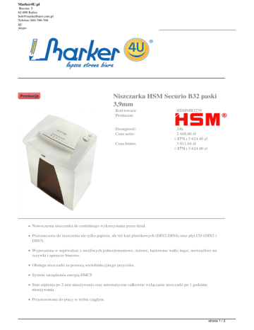 Marker4U.pl Boczna 5 62-800 Kalisz [email protected] Telefon: 884-760-760 gg: skype: Niszczarka HSM Securio B32 paski 3,9mm Kod towaru: Producent: Dostępność: Cena netto: Cena brutto: HSMNIB3239 24h 2 448.00 zł (-17%) 3 624.40 zł 3 011.04 zł (-17%) 3 624.40 zł Nowoczesna niszczarka do centralnego wykorzystania przez dział. Przeznaczona do niszczenia nie tylko papieru, ale też kart plastikowych (DIN2-DIN4) oraz płyt CD (DIN2 i DIN3). Wyposażona w najtrwalsze z możliwych jednoelementowe, stalowe, hartowane wałki tnące, niewrażliwe na zszywki i spinacze biurowe. Obsługa niszczarki za pomocą wielofunkcyjnego przycisku. System zarządzania energią EMCS Stan uśpienia po 2 min nieużywania oraz automatyczne całkowite wyłączanie niszczarki po 1 godzinie nieużywania. Przystosowana do pracy w trybie ciągłym. strona 1 / 2 Marker4U.pl Boczna 5 62-800 Kalisz [email protected] Telefon: 884-760-760 gg: skype: Automatyczny włącznik start/stop uruchamiany fotokomórką. Automatyczny rewers w przypadku zacięcia papieru. Automatyczny stop w momencie przepełnienia worka na ścinki, łatwy sposób wyciągania worka ze ścinkami. Rolki ułatwiające przesuwanie urządzenia. Specjalny oddzielny kosz na niszczone płyty CD. Mocny i energooszczędny silnik z zabezpieczeniem przeciwprzeciążeniowym, cicha praca. Szerokość szczeliny wejściowej: 310 mm, Pojemność kosza na ścinki: 82 l. Produkt niemiecki. Gwarancja: 2 lata na urządzenie, dożywotnia na noże tnące. Liczba arkuszy: 22-24 kartki jednorazowo Cięcie: paski 3,9mm Poziom bezpieczeństwa DIN: 2 strona 2 / 2 Powered by TCPDF (www.tcpdf.org)