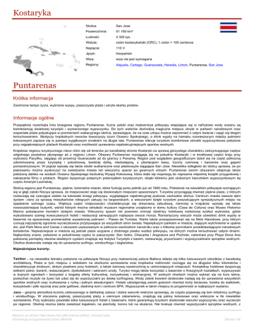 Kostaryka Stolica: San Jose Powierzchnia: 51 100 km² Ludność: 4 325 tys. Waluta: colon kostarykański (CRC), 1 colon = 100 centavos Napięcie: 110 V Język: hiszpański Wiza: wiza nie jest wymagana Regiony: Alajuela, Cartago, Guanacaste, Heredia, Limon, Puntarenas, San Jose Puntarenas Krótka informacja Zwolnione tempo życia, wyśnione wyspy, piaszczyste plaże i ukryte skarby piratów. Informacje ogólne Przepięknie rozwinięta linia brzegowa regionu Puntaneras, liczne zatoki oraz malownicze półwyspy wtapiające się w nefrytowe wody oceanu są kwintesencją światowej turystyki i wymarzonego wypoczynku. Do tych walorów dochodzą magiczne miejsca ukryte w parkach narodowych oraz wspaniałe plaże połyskujące w promieniach wakacyjnego słońca, sprawiające, że na czas urlopu można zapomnieć o całym świecie i zająć się błogim leniuchowaniem. Słodyczy tropikalnych owoców towarzyszy szum Oceanu Spokojnego, a drink wypity na hamaku rozwieszonym między palmami kokosowymi zapisze się w pamięci wyjątkowym smakiem na długie lata. Puntarenas oferuje turystom komfortowe ośrodki wypoczynkowe położone przy najpiękniejszych plażach Kostaryki oraz możliwość uprawiania najatrakcyjniejszych sportów wodnych. Krajobraz regionu turystycznego nieco różni się od terenów po karaibskiej stronie Kostaryki za sprawą górzystego charakteru zatrzymującego napływ wilgotnego powietrza płynącego aż z regionu Limon. Obszary Puntarenas rozciągają się na południu Kostaryki i w środkowej części kraju przy wybrzeżu Pacyfiku, sięgając od prowincji Guanacaste aż do granicy z Panamą. Region pod względem geograficznym dzieli się na część północną zdominowaną przez turystykę i południową, bardziej dziką, niedostępną, z plantacjami kawy, trzciny cukrowej i bananów oraz gajami pomarańczowymi. W pejzaż wpisały się także stożki wulkaniczne oraz płaskowyże sięgające San Jose. Niewielka odległość do stolicy sprawia, że po plażowaniu można wyskoczyć na zwiedzanie miasta lub wieczorny spacer po gwarnych ulicach. Puntarenas swoim obszarem obejmuje także położoną daleko na wodach Oceanu Spokojnego bezludną Wyspę Kokosową, która stała się inspiracją do napisania niejednej książki przygodowej i nakręcania filmu o piratach. Region dysponuje potężnym potencjałem turystycznym, dzięki któremu jest ulubionym kierunkiem wypoczynkowym tej części Ameryki Łacińskiej. Stolicą regionu jest Puntarenas, piękne, kolonialne miasto, które funkcję portu pełniło już od 1800 roku. Położenie na niewielkim półwyspie wcinającym się w głąb zatoki Nicoya sprawia, że miejscowość staje się doskonałym miejscem spacerowym. Turystów przyciągają również piękne plaże, z których roztaczają się czarujące widoki na łukowate brzegi półwyspu, wyglądające najatrakcyjniej podczas zachodów słońca. Centrum miasta zawsze tętni życiem –rano za sprawą mieszkańców robiących zakupy na targowiskach, a wieczorami dzięki turystom poszukującym sympatycznych miejsc na spędzenie wolnego czasu. Większa część miejscowości charakteryzuje się drewnianą zabudową, niemniej w krajobraz wpisały się także nowocześniejsze budynki, wśród których można odnaleźć muzeum regionalne urządzone w domu kultury (Casa de Cultura) oraz Museo Historico Marino poświęcone morskim dziejom miasta. Wieczorny spacer nie powinien ominąć dzielnicy hotelowej rozłożonej wzdłuż wybrzeża, gdzie wybudowano szereg nowoczesnych hoteli i restauracji serwujących najlepsze owoce morza. Romantyczny wieczór może uświetnić drink wypity w tawernie na spacerowej promenadzie wysadzonej palmami – Paseo de Turistas. Warto także przespacerować się na Molo Narodowe, przy którym cumują najczęściej ogromne wycieczkowce przybywające ze wszystkich stron świata. Największym parkiem w mieście, dającym wytchnienie w upalne dni, jest Park Mora and Canas z ratuszem usytuowanym w północno-wschodnim narożniku oraz z kilkoma pomnikami przedstawiającymi narodowych bohaterów. Najważniejsze w mieście są jednak plaże usypane z drobnego piasku wzdłuż półwyspu, na których można leniuchować całymi dniami. Najbardziej znane, położone w południowej części to piaszczyste: San Isidro, Chacarita i Angostura and Pochote, natomiast przy Playa Dona Ana położonej pomiędzy dwoma skalistymi cyplami znajduje się Instytut Turystyki z barem, restauracją, prysznicami i wypożyczalniami sprzętów wodnych. Okolica doskonale nadaje się do uprawiania surfingu, windsurfingu i żeglarstwa. Najważniejsze kurorty: Tambor – na niewielkie letnisko położone na półwyspie Nicoya przy malowniczej zatoce Ballena składa się kilka luksusowych ośrodków z karaibską architekturą. Plaża w tym miejscu z widokiem na okoliczne wzniesienia oraz tropikalna roślinność rozciąga się na długości kilku kilometrów i charakteryzuje drobnym, złotym piaskiem przy hotelach, a także żwirową nawierzchnią w ustronniejszych miejscach. Kompleksy hotelowe dysponują setkami pokoi, barami, restauracjami, dyskotekami i salonami urody. Turyści mogą także korzystać z basenów o finezyjnych kształtach, wypoczywać w bujnych ogrodach i korzystać z bogatej oferty kulturalnej, rozrywkowej i animacyjnej. W wolnych chwilach można wybrać się na kurs tańca, posłuchać muzyki na żywo lub udać się do wypożyczalni po deskę surfingową. Wody zatoki bowiem doskonale nadają się do uprawiania wszystkich sportów wodnych oraz nurkowania z rurką i pełnym akwalungiem. Hotele udostępniają swoim gościom również korty tenisowe, boiska do siatkówki, koszykówki i piłki ręcznej oraz pole golfowe, stadninę koni i centrum SPA. Wypoczynek w takim miejscu to przyjemność w najlepszym wydaniu. Jaco – gwarna atmosfera kurortu ulokowanego w delikatnej zatoce i dobre warunki wietrzne sprawiają, że często pojawiają się tam miłośnicy surfingu i wind