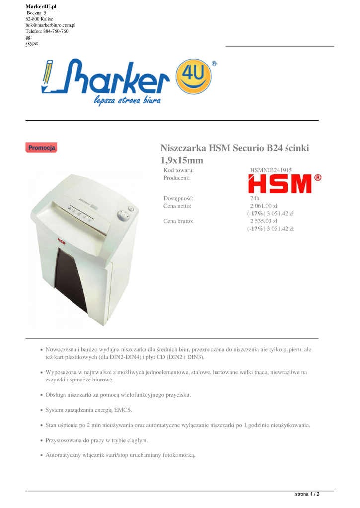 Marker4U.pl Boczna 5 62-800 Kalisz [email protected] Telefon: 884-760-760 gg: skype: Niszczarka HSM Securio B24 ścinki 1,9x15mm Kod towaru: Producent: HSMNIB241915 Dostępność: Cena netto: 24h 2 061.00 zł (-17%) 3 051.42 zł 2 535.03 zł (-17%) 3 051.42 zł Cena brutto: Nowoczesna i bardzo wydajna niszczarka dla średnich biur, przeznaczona do niszczenia nie tylko papieru, ale też kart plastikowych (dla DIN2-DIN4) i płyt CD (DIN2 i DIN3). Wyposażona w najtrwalsze z możliwych jednoelementowe, stalowe, hartowane wałki tnące, niewrażliwe na zszywki i spinacze biurowe. Obsługa niszczarki za pomocą wielofunkcyjnego przycisku. System zarządzania energią EMCS. Stan uśpienia po 2 min nieużywania oraz automatyczne wyłączanie niszczarki po 1 godzinie nieużytkowania. Przystosowana do pracy w trybie ciągłym. Automatyczny włącznik start/stop uruchamiany fotokomórką. strona 1 / 2 Marker4U.pl Boczna 5 62-800 Kalisz [email protected] Telefon: 884-760-760 gg: skype: Automatyczny rewers w przypadku zacięcia papieru. Automatyczny stop w momencie przepełnienia pojemnika z workiem na ścinki, obudowa zapobiegająca wydostawaniu się pyłu z niszczarki. Kółka ułatwiające przesuwanie urządzenia. Specjalny oddzielny kosz na niszczone płyty CD. Mocny i energooszczędny silnik z zabezpieczeniem przeciwprzeciążeniowym, cicha praca. Szerokość szczeliny wejściowej: 240 mm. Pojemność kosza na ścinki: 34 l. Produkt niemiecki. Gwarancja: 2 lata na urządzenie, dożywotnia na noże tnące. Liczba arkuszy: 11-13 kartek jednorazowo Cięcie: ścinki 1,9x15mm Poziom bezpieczeństwa DIN: 4 strona 2 / 2 Powered by TCPDF (www.tcpdf.org)