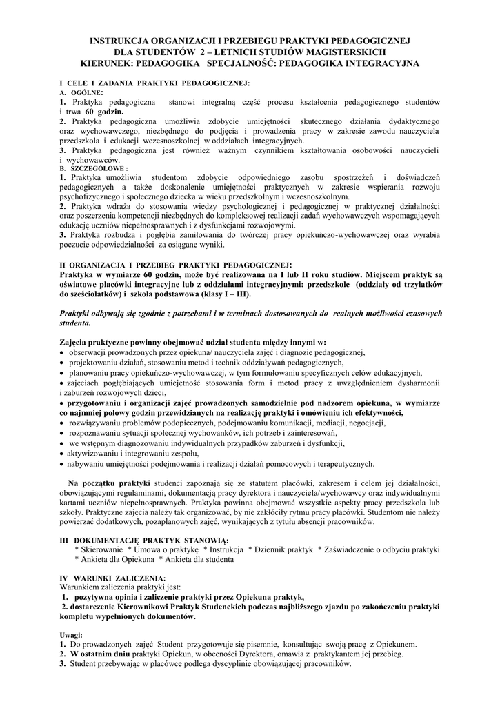 INSTRUKCJA ORGANIZACJI I PRZEBIEGU PRAKTYKI PEDAGOGICZNEJ DLA STUDENTÓW 2 – LETNICH STUDIÓW MAGISTERSKICH KIERUNEK: PEDAGOGIKA SPECJALNOŚĆ: PEDAGOGIKA INTEGRACYJNA I CELE I ZADANIA PRAKTYKI PEDAGOGICZNEJ: A. OGÓLNE: 1. Praktyka pedagogiczna stanowi integralną część procesu kształcenia pedagogicznego studentów i trwa 60 godzin. 2. Praktyka pedagogiczna umożliwia zdobycie umiejętności skutecznego działania dydaktycznego oraz wychowawczego, niezbędnego do podjęcia i prowadzenia pracy w zakresie zawodu nauczyciela przedszkola i edukacji wczesnoszkolnej w oddziałach integracyjnych. 3. Praktyka pedagogiczna jest również ważnym czynnikiem kształtowania osobowości nauczycieli i wychowawców. B. SZCZEGÓŁOWE : 1. Praktyka umożliwia studentom zdobycie odpowiedniego zasobu spostrzeżeń i doświadczeń pedagogicznych a także doskonalenie umiejętności praktycznych w zakresie wspierania rozwoju psychofizycznego i społecznego dziecka w wieku przedszkolnym i wczesnoszkolnym. 2. Praktyka wdraża do stosowania wiedzy psychologicznej i pedagogicznej w praktycznej działalności oraz poszerzenia kompetencji niezbędnych do kompleksowej realizacji zadań wychowawczych wspomagających edukację uczniów niepełnosprawnych i z dysfunkcjami rozwojowymi. 3. Praktyka rozbudza i pogłębia zamiłowania do twórczej pracy opiekuńczo-wychowawczej oraz wyrabia poczucie odpowiedzialności za osiągane wyniki. II ORGANIZACJA I PRZEBIEG PRAKTYKI PEDAGOGICZNEJ: Praktyka w wymiarze 60 godzin, może być realizowana na I lub II roku studiów. Miejscem praktyk są oświatowe placówki integracyjne lub z oddziałami integracyjnymi: przedszkole (oddziały od trzylatków do sześciolatków) i szkoła podstawowa (klasy I – III). Praktyki odbywają się zgodnie z potrzebami i w terminach dostosowanych do realnych możliwości czasowych studenta. Zajęcia praktyczne powinny obejmować udział studenta między innymi w: obserwacji prowadzonych przez opiekuna/ nauczyciela zajęć i diagnozie pedagogicznej, projektowaniu działań, stosowaniu metod i technik oddziaływań pedagogicznych, planowaniu pracy opiekuńczo-wychowawczej, w tym formułowaniu specyficznych celów edukacyjnych, zajęciach pogłębiających umiejętność stosowania form i metod pracy z uwzględnieniem dysharmonii i zaburzeń rozwojowych dzieci, przygotowaniu i organizacji zajęć prowadzonych samodzielnie pod nadzorem opiekuna, w wymiarze co najmniej połowy godzin przewidzianych na realizację praktyki i omówieniu ich efektywności, rozwiązywaniu problemów podopiecznych, podejmowaniu komunikacji, mediacji, negocjacji, rozpoznawaniu sytuacji społecznej wychowanków, ich potrzeb i zainteresowań, we wstępnym diagnozowaniu indywidualnych przypadków zaburzeń i dysfunkcji, aktywizowaniu i integrowaniu zespołu, nabywaniu umiejętności podejmowania i realizacji działań pomocowych i terapeutycznych. Na początku praktyki studenci zapoznają się ze statutem placówki, zakresem i celem jej działalności, obowiązującymi regulaminami, dokumentacją pracy dyrektora i nauczyciela/wychowawcy oraz indywidualnymi kartami uczniów niepełnosprawnych. Praktyka powinna obejmować wszystkie aspekty pracy przedszkola lub szkoły. Praktyczne zajęcia należy tak organizować, by nie zakłóciły rytmu pracy placówki. Studentom nie należy powierzać dodatkowych, pozaplanowych zajęć, wynikających z tytułu absencji pracowników. III DOKUMENTACJĘ PRAKTYK STANOWIĄ: * Skierowanie * Umowa o praktykę * Instrukcja * Dziennik praktyk * Zaświadczenie o odbyciu praktyki * Ankieta dla Opiekuna * Ankieta dla studenta IV WARUNKI ZALICZENIA: Warunkiem zaliczenia praktyki jest: 1. pozytywna opinia i zaliczenie praktyki przez Opiekuna praktyk, 2. dostarczenie Kierownikowi Praktyk Studenckich podczas najbliższego zjazdu po zakończeniu praktyki kompletu wypełnionych dokumentów. Uwagi: 1. Do prowadzonych zajęć Student przygotowuje się pisemnie, konsultując swoją pracę z Opiekunem. 2. W ostatnim dniu praktyki Opiekun, w obecności Dyrektora, omawia z praktykantem jej przebieg. 3. Student przebywając w placówce podlega dyscyplinie obowiązującej pracowników.