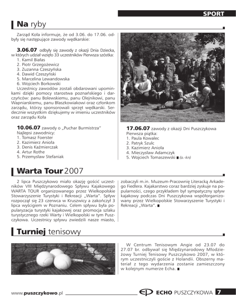 SPORT Na ryby Zarząd Koła informuje, że od 3.06. do 17.06. odbyły się następujące zawody wędkarskie: 3.06.07 odbyły się zawody z okazji Dnia Dziecka, w których udział wzięło 33 uczestników Pierwsza szóstka: 1. Kamil Białas 2. Piotr Grzegożewicz 3. Zuzanna Czeszyńska 4. Dawid Czeszyński 5. Marcelina Lewandowska 6. Wojciech Borkowski Uczestnicy zawodów zostali obdarowani upominkami dzięki pomocy starostwa poznańskiego i darczyńców: panu Bolewskiemu, panu Olejnikowi, panu Wapniarskiemu, panu Błaszkowiakowi oraz członkom zarządu, którzy sponsorowali sprzęt wędkarski. Serdecznie wszystkim dziękujemy w imieniu uczestników oraz zarządu Koła 10.06.07 zawody o „Puchar Burmistrza” Najlepsi zawodnicy: 1. Tomasz Foerster 2. Kazimierz Anioła 3. Denis Kaźmierczak 4. Artur Rothe 5. Przemysław Stefaniak 17.06.07 zawody z okazji Dni Puszczykowa Pierwsza piątka: 1. Paula Kowalec 2. Patryk Szulc 3. Kazimierz Anioła 4. Mieczysław Adamczyk 5. Wojciech Tomaszewski (o.-kn) Warta Tour 2007 2 lipca Puszczykowo miało okazję gościć uczestników VIII Międzynarodowego Spływu Kajakowego WARTA TOUR organizowanego przez Wielkopolskie Stowarzyszenie Turystyki i Rekreacji „Warta”. Spływ rozpoczął się 23 czerwca w Kruszwicy a zakończył 3 lipca wyścigiem w Poznaniu. Celem spływu była popularyzacja turystyki kajakowej oraz promocja szlaku turystycznego rzeki Warty i Wielkopolski w tym Puszczykowa. Uczestnicy spływu zwiedzili nasze miasto, zobaczyli m.in. Muzeum-Pracownię Literacką Arkadego Fiedlera. Kajakarstwo coraz bardziej zyskuje na popularności, czego przykładem był sympatyczny spływ kajakowy podczas Dni Puszczykowa współorganizowany przez Wielkopolskie Stowarzyszenie Turystyki i Rekreacji „Warta”. Turniej tenisowy W Centrum Tenisowym Angie od 23.07 do 27.07 br. odbywał się Międzynarodowy Młodzieżowy Turniej Tenisowy Puszczykowo 2007, w którym uczestniczyli goście z Holandii. Obszerny materiał z tego wydarzenia zostanie zamieszczony w kolejnym numerze Echa. www.puszczykowo.pl ECHO PUSZCZYKOWA