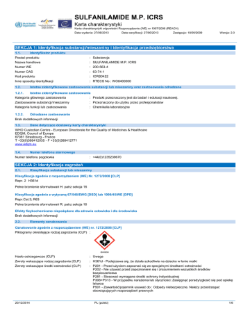 SULFANILAMIDE M.P. ICRS Karta charakterystyki Karta charakterystyki odpowiedni Rozporządzenie (WE) nr 1907/2006 (REACH) Data wydania: 27/06/2013 Data weryfikacji: 27/06/2013 Zastępuje: 18/09/2009 Wersja: 2.0 SEKCJA 1: Identyfikacja substancji/mieszaniny i identyfikacja przedsiębiorstwa 1.1. Identyfikator produktu Postać produktu : Substancja Nazwa handlowa : SULFANILAMIDE M.P. ICRS Numer WE : 200-563-4 Numer CAS : 63-74-1 Kod produktu : ICRS0422 Inne sposoby identyfikacji : RTECS No : WO8400000 1.2. Istotne zidentyfikowane zastosowania substancji lub mieszaniny oraz zastosowania odradzane 1.2.1. Istotne zidentyfikowane zastosowania Kategoria głównego zastosowania : Produkt przeznaczony jest do badań i edukacji naukowej. Zastosowanie substancji/mieszaniny : Przeznaczony do użytku przez profesjonalistów Kategoria funkcji lub zastosowania : Chemikalia laboratoryjne 1.2.2. Odradzane zastosowanie Brak dodatkowych informacji 1.3. Dane dotyczące dostawcy karty charakterystyki WHO Custodian Centre - European Directorate for the Quality of Medicines & Healthcare EDQM, Council of Europe 67081 Strasbourg - France T +33(0)388412035 - F +33(0)388412771 www.edqm.eu 1.4. Numer telefonu alarmowego Numer telefonu pogotowia : +44(0)1235239670 SEKCJA 2: Identyfikacja zagrożeń 2.1. Klasyfikacja substancji lub mieszaniny Klasyfikacja zgodnie z rozporządzeniem (WE) Nr. 1272/2008 [CLP] Repr. 2 H361d Pełne brzmienie sformułowań H: patrz sekcja 16 Klasyfikacja zgodnie z wytyczną 67/548/EWG [DSD] lub 1999/45/WE [DPD] Repr.Cat.3; R63 Pełne brzmienie sformułowań R: patrz sekcja 16 Efekty fizykochemiczne niepożądane dla zdrowia człowieka i dla środowiska Brak dodatkowych informacji 2.2. Elementy oznakowania Oznakowanie zgodnie z rozporządzeniem (WE) nr. 1272/2008 [CLP] Piktogramy określające rodzaj zagrożenia (CLP) : GHS08 Hasło ostrzegawcze (CLP) : Uwaga Zwroty wskazujące rodzaj zagrożenia (CLP) : H361d - Podejrzewa się, że działa szkodliwie na dziecko w łonie matki Zwroty wskazujące środki ostrożności (CLP) : P201 - Przed użyciem zapoznać się ze specjalnymi środkami ostrożności P202 - Nie używać przed zapoznaniem się i zrozumieniem wszystkich środków bezpieczeństwa P281 - Stosować wymagane środki ochrony indywidualnej P308+P313 - W przypadku narażenia lub styczności: Zasięgnąć porady/zgłosić się pod opiekę lekarza P501 - Zawartość/pojemnik usuwać do : Odpady niebezpieczne. Należy przestrzegać obowiązujących rozporządzeń prawnych 20/12/2014 PL (polski) 1/6 SULFANILAMIDE M.P. ICRS Karta charakterystyki Karta charakterystyki odpowiedni Rozporządzenie (WE) nr 1907/2006 (REACH) 2.3. Inne zagrożenia Inne zagrożenia mające wpływ na klasyfikację : Ekspozycja może spowodować reakcję alergiczną. SEKCJA 3: Skład/informacja o składnikach 3.1. Substancja Nazwa : SULFANILAMIDE M.P. Numer CAS : 63-74-1 Numer WE : 200-563-4 Nazwa Identyfikator produktu % Klasyfikacja zgodnie z dyrektywą 67/548/EEC SULFANILAMIDE M.P. (Numer CAS) 63-74-1 (Numer WE) 200-563-4 ≤ 100 Repr.Cat.3; R63 Nazwa Identyfikator produktu % Klasyfikacja zgodnie z rozporządzeniem (WE) Nr. 1272/2008 [CLP] SULFANILAMIDE M.P. (Numer CAS) 63-74-1 (Numer WE) 200-563-4 ≤ 100 Repr. 2, H361d Brzmienie sformułowań R i H: patrz sekcja 16 3.2. Mieszanina Nie dotyczy SEKCJA 4: Środki pierwszej pomocy 4.1. Opis środków pierwszej pomocy Pierwsza pomoc - środki po zainhalowaniu : W razie przypadkowej inhalacji, wyprowadzić poszkodowanego na świeże powietrze. Zapewnić oddychanie świeżym powietrzem. Pierwsza pomoc - środki po kontakcie ze skórą : Spłukać skórę pod strumieniem wody/prysznicem. Pierwsza pomoc - środki po kontakcie z oczami : Płukanie w wodzie trzymając powieki szeroko rozwarte. Zdjąć soczewki kontaktowe. Pierwsza pomoc - środki po połknięciu : Przepłukać usta wodą. 4.2. Najważniejsze ostre i opóźnione objawy oraz skutki narażenia Symptomy/urazy 4.3. : Patrz Punkt 2. Wskazania dotyczące wszelkiej natychmiastowej pomocy lekarskiej i szczególnego postępowania z poszkodowanym W przypadku jakichkolwiek wątpliwości lub jeśli objawy się utrzymują, zwrócić się do lekarza. SEKCJA 5: Postępowanie w przypadku pożaru 5.1. Środki gaśnicze Odpowiednie środki gaśnicze 5.2. Szczególne zagrożenia związane z substancją lub mieszaniną Reaktywny w przypadku pożaru 5.3. : Małe ilości: Stosować odpowiednie środki do zwalczania pożaru w sąsiedztwie. Woda rozpylana. Ditlenek węgla. Suchy proszek. Piana. Duże ilości: Nie dotyczy. : Patrz Rubryka 10.1. Informacje dla straży pożarnej Środki zapobiegawcze celem uniknięcia pożaru : Małe ilości: Stosować zwykły, indywidualny sprzęt ochrony przeciwpożarowej. Duże ilości: Nie dotyczy. Instrukcja gaśnicza : Rozcieńczyć w wodzie. SEKCJA 6: Postępowanie w przypadku niezamierzonego uwolnienia do środowiska 6.1. Indywidualne środki ostrożności, wyposażenie ochronne i procedury w sytuacjach awaryjnych Ogólne środki zaradcze 6.1.1. Dla osób nienależących do personelu udzielającego pomocy Wyposażenie ochronne 6.1.2. : Unikać wydzielania się pyłów. Nosić odpowiednią odzież ochronną, odpowiednie rękawice i okulary ochronne lub osłonę twarzy. Duże ilości: Nie dotyczy. : Patrz Nagłówek 7/8. Dla osób udzielających pomocy Brak dodatkowych informacji 6.2. Środki ostrożności w zakresie ochrony środowiska Brak dodatkowych informacji 20/12/2014 PL (polski) 2/6 SULFANILAMIDE M.P. ICRS Karta charakterystyki Karta charakterystyki odpowiedni Rozporządzenie (WE) nr 1907/2006 (REACH) 6.3. Metody i materiały zapobiegające rozprzestrzenianiu się skażenia i służące do usuwania skażenia Metody oczyszczania 6.4. : Zamieść i zebrać rozprzestrzenioną substancję do pojemników. Należy upewnić się, że odpady zostaną zebrane i zmagazynowane w bezpiecznym miejscu. Dokładnie wyczyścić. Czyszczenie w wodzie. Odniesienia do innych sekcji Brak dodatkowych inform