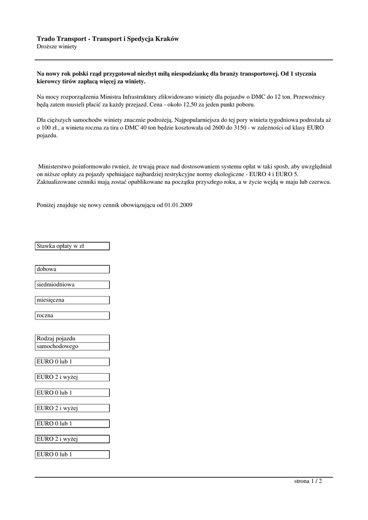Trado Transport - Transport i Spedycja Kraków Droższe winiety Na nowy rok polski rząd przygotował niezbyt miłą niespodziankę dla branży transportowej. Od 1 stycznia kierowcy tirów zapłacą więcej za winiety. Na mocy rozporządzenia Ministra Infrastruktury zlikwidowano winiety dla pojazdw o DMC do 12 ton. Przewoźnicy będą zatem musieli płacić za każdy przejazd. Cena - około 12,50 za jeden punkt poboru. Dla cięższych samochodw winiety znacznie podrożeją. Najpopularniejsza do tej pory winieta tygodniowa podrożała aż o 100 zł., a winieta roczna za tira o DMC 40 ton będzie kosztowała od 2600 do 3150 - w zależności od klasy EURO pojazdu. Ministerstwo poinformowało rwnież, że trwają prace nad dostosowaniem systemu opłat w taki sposb, aby uwzględniał on niższe opłaty za pojazdy spełniające najbardziej restrykcyjne normy ekologiczne - EURO 4 i EURO 5. Zaktualizowane cenniki mają zostać opublikowane na początku przyszłego roku, a w życie wejdą w maju lub czerwcu. Poniżej znajduje się nowy cennik obowiązującu od 01.01.2009 Stawka opłaty w zł dobowa siedmiodniowa miesięczna roczna Rodzaj pojazdu samochodowego EURO 0 lub 1 EURO 2 i wyżej EURO 0 lub 1 EURO 2 i wyżej EURO 0 lub 1 EURO 2 i wyżej EURO 0 lub 1 strona 1 / 2 Trado Transport - Transport i Spedycja Kraków Droższe winiety EURO 2 i wyżej Pojazdy i zespoły pojazdów inne niż autobusy o dmc** co najmniej 12 t 38 38 130 110 400 360 3150 2600 Autobusy o dmc co najmniej 12 t. 16 14 59 52 156 140 1040 910 strona 2 / 2