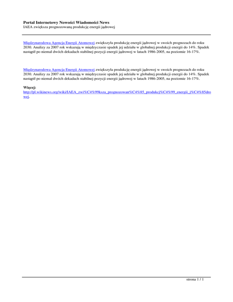 Portal Internetowy Nowości Wiadomości News IAEA zwiększa prognozowaną produkcję energii jądrowej Międzynarodowa Agencja Energii Atomowej zwiększyła produkcję energii jądrowej w swoich prognozach do roku 2030. Analizy za 2007 rok wskazują w międzyczasie spadek jej udziału w globalnej produkcji energii do 14%. Spadek nastąpił po niemal dwóch dekadach stabilnej pozycji energii jądrowej w latach 1986-2005, na poziomie 16-17%. Międzynarodowa Agencja Energii Atomowej zwiększyła produkcję energii jądrowej w swoich prognozach do roku 2030. Analizy za 2007 rok wskazują w międzyczasie spadek jej udziału w globalnej produkcji energii do 14%. Spadek nastąpił po niemal dwóch dekadach stabilnej pozycji energii jądrowej w latach 1986-2005, na poziomie 16-17%. Więcej: http://pl.wikinews.org/wiki/IAEA_zwi%C4%99ksza_prognozowan%C4%85_produkcj%C4%99_energii_j%C4%85dro wej. strona 1 / 1