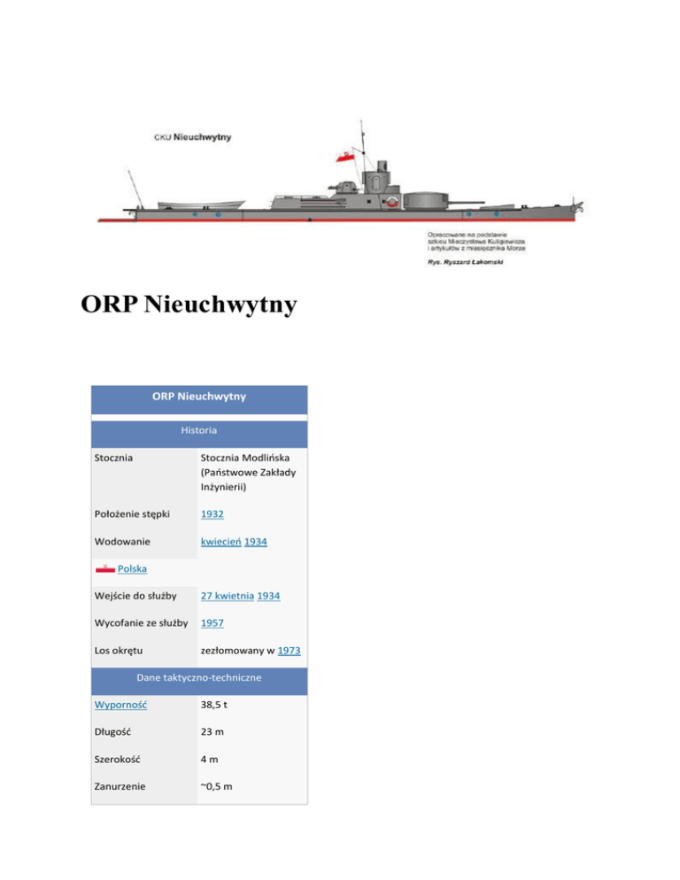 ORP Nieuchwytny ORP Nieuchwytny Historia Stocznia Stocznia Modlińska (Państwowe Zakłady Inżynierii) Położenie stępki 1932 Wodowanie kwiecień 1934 Polska Wejście do służby 27 kwietnia 1934 Wycofanie ze służby 1957 Los okrętu zezłomowany w 1973 Dane taktyczno-techniczne Wyporność 38,5 t Długość 23 m Szerokość 4m Zanurzenie ~0,5 m Prędkość ~21 km/h (~11,5 węzła) Zasięg 1250 km Załoga 16-18 ludzi Napęd 2 silniki 6-cylindrowe benzynowe Beardmore o mocy łącznej 450-500 KM[1] 2 śruby Uzbrojenie do 1944: 1 działko 'Puteaux' wz. S.A. kal. 37 mm w wieży typu „Ursus”; 1 ckm ‘Hotchiss” wz. 28 kal. 7,92 mm od 1944: 2 działka p.lot kal. 37 mm; 4 sprzężone ckm-y Wyposażenie lotnicze 1 działko p.lot. 'Vickers' L39 M1928 kal. 40 mm w wieży (od 1937[2]: 1 działko plot. 'Bofors' kal. 40 mm) Następna nazwa jesień 1939 – styczeń 1945 Wachtkutter "Pionier" 1945- 1957 , ORP "Okoń" ORP Nieuchwytny – polski ciężki kuter uzbrojony z okresu międzywojennego, II wojny światowej i okresu powojennego. Historia Do lat 30. XX wieku Polska Marynarka Wojenna nie dysponowała jednostkami pośrednimi pomiędzy monitorami rzecznymi a małymi jednostkami jak kanonierka czy zwykłe kutry uzbrojone. Dlatego też komandor Witold Zajączkowski zlecił opracowanie projektu takiej jednostki (tzw. kuter typu N). Tak narodził się projekt ciężkiego kutra uzbrojonego, którego jedynym egzemplarzem w polskiej flocie był ORP "Nieuchwytny". Kuter budowano w latach 1932- 1934 w Stoczni Modlińskiej, podległej Państwowym Zakładom Inżynierii. Mimo pewnych niedociągnięć i zmian konstrukcyjnych w porównaniu do pierwotnego projektu[3] okręt został odebrany i 27 kwietnia 1934 roku włączony do III Dywizjonu flotylli pińskiej. Pierwszym dowódcą jednostki został bosmanmat Czesław Majewski. Jednak jeszcze w tym samym roku musiano – po interwencji kmdra Zajączkowskiego – dokonać wymiany śrub na większe i "Nieuchwytny" zwiększył swoją prędkość z 18 km/h do ponad 21 km/h. Do końca roku prowadzono też inne drobne modernizacje. Kłopoty przy budowie pierwszego egzemplarza kutra typu N sprawiły jednak, że zrezygnowano z budowy kolejnych jednostek tego typu. Służba Do września 1939 Do roku 1939 okręt służył niezmiennie we flotylli pińskiej. Jednak w marcu 1939 zdecydowano o powołaniu do życia tzw. Oddziału Wydzielonego Rzeki Wisły, do którego wszedł także ORP "Nieuchwytny"[4]. W tym czasie jego dowódcą był por. mar. Olgierd Koreywo. W związku z przeniesieniem do nowej jednostki ORP "Nieuchwytny" w połowie kwietnia przypłynął do Modlina, ale w drugiej połowie czerwca wraz z innymi jednostkami został przeniesiony do Torunia, aby już 6 lipca stanąć portem w Brdyujściu. Miało to związek z podporządkowaniem OW Wisła Armii Pomorze i rozkazem wzmocnienia obrony mostów na Wiśle. Kampania wrześniowa Do czynnej walki w wojnie obronnej ORP "Nieuchwytny" włączył się 2 września, gdy wraz z innymi jednostkami odpierał naloty bombowców pod Fordonem, gdzie zanotował – wspólnie z resztą okrętów – zestrzelenie jednego bombowca. Następnego dnia kuter brał udział w ewakuacji resztek pułku starogardzkich szwoleżerów pod Strzelcami. W następnych dniach cały OW osłaniał Toruń od strony rzeki Drwęcy, a 8 września ORP "Nieuchwytny" przedarł się do Włocławka. W tym czasie kuter miał już poważne problemy z pływaniem, ze względu na dość szybko opadający poziom wody. 10 września okręt został niemal zupełnie unieruchomiony na Wiśle pod Popłacinem. W związku z tym załoga dokonała jego samozatopienia. Dalsza służba Po zakończeniu walk, kuter został wydobyty przez Niemców i wyremontowany w Płocku. Do początku 1945 służył jako Wachtkutter "Pionier", biorąc udział m.in. w ostrzeliwaniu stolicy podczas powstania warszawskiego. W międzyczasie – w 1944 – dokonano modernizacji jego uzbrojenia[5]. W czasie radzieckiej ofensywy na początku 1945, Niemcy zatopili kuter pod Płockiem, gdzie spoczywał aż do wiosny 1947. Wtedy to zdecydowano się na jego ponowne wydobycie. Remont jednostki zakończono jesienią i – już po raz drugi – zmieniono mu nazwę. Do końca służby ORP "Nieuchwytny" służył jako ORP "Okoń": w latach 1947 – 1955 w Szczecińskim Obszarze Nadmorskim; w okresie 1955 – 1957 w Wojskach Ochrony Pogranicza. W roku 1957 kuter został wycofany ze służby, a w 1973 zdecydowano się go zezłomować. Czwartego kwietnia 1939 powstał Oddział Wydzielony Wisła pod dowództwem kmdr. ppor. Romana Kanafoyskiego. Dca grupy Kutrów Uzbrojonych por. mar. Janusz Marciniewski; od 19.06 bsm. Michał Gostomski; p.o. oficera mechanika chor. mar. Bolesław Chabałowski w składzie: CKU ORP Nieuchwytny por. mar. Olgierd Koreywo + 18; KU 6 bosmanmat Witold Bonfig +6; KU 30 bosmanmat Edward Adamoszek + 8; KU 4 mat Aleksander Kopeć + 6; KU 5 mat Franciszek Kuchno (mat H. Mazurek) + 6; KM 12 st. mar. nadt. Edmund Łukaszewski + 4; KM 13 st. mar. nadt. Bronisław Duch +4; nieobsadzony gliser Nr 5 w dyspozycji dowódcy; K 5 krypa mieszkalna załóg i K 22 – krypa paliwowa. Ostatecznie OW liczył 3 oficerów oraz 75 podoficerów i marynarzy obsadzających 8 jednostek bojowych i 4 pomocnicze. Uzbrojenie: 4 działa 40 mm; 3 działa 37 mm, 2 nkm 13.2 mm i 12 ckm 7,9 mm. Trzeba przypomnieć, że sprzęt był przestarzały a niski stan wody Wisły we wrześniu znacznie pogorszył warunki nawigacyjne, 5 maja w Modlinie usamodzielniono CKU Nieuchwytny; przyjęto statek sztabowy z cywilną załogą Hetman Żółkiewski z Państwowego Zarządu Wód w Wyszkowie. Jednostki poza sztabowym przemalowano na barwy ochronne. 6 lipca OW przeszedł do Brdyujścia w podporządkowanie i zaopatrzenie bydgoskiej 15. DP gen. bryg. Zdzisława Przyjałkowskiego. Generał nakazał: bronić mostów i przepraw wiślanych na odcinku Tczew-Dobrzyń; niszczyć przeprawy wiślane nieprzyjaciela; utrzymywać łączność mi