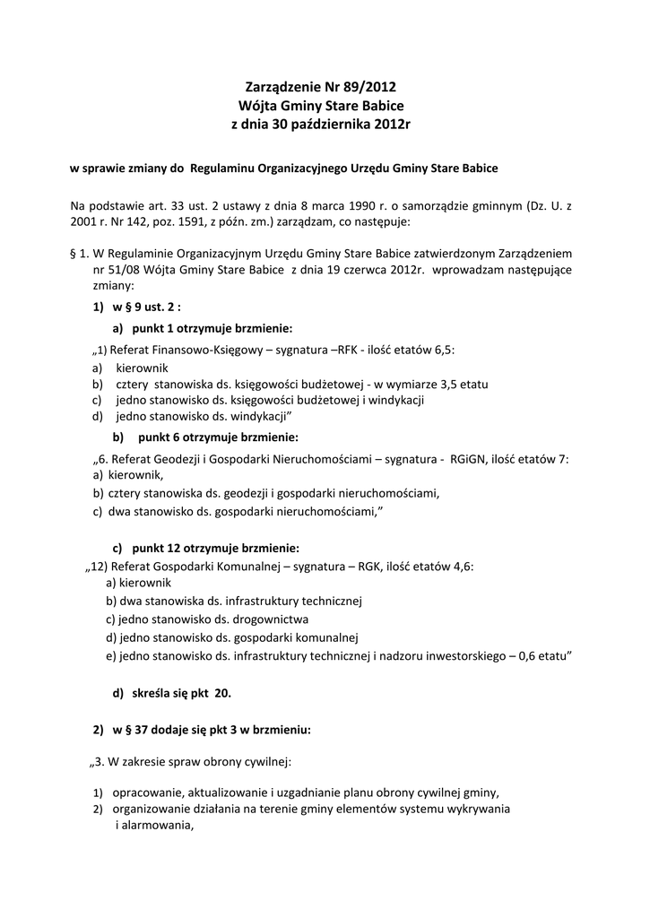 Zarządzenie Nr 89/2012 Wójta Gminy Stare Babice z dnia 30 października 2012r w sprawie zmiany do Regulaminu Organizacyjnego Urzędu Gminy Stare Babice Na podstawie art. 33 ust. 2 ustawy z dnia 8 marca 1990 r. o samorządzie gminnym (Dz. U. z 2001 r. Nr 142, poz. 1591, z późn. zm.) zarządzam, co następuje: § 1. W Regulaminie Organizacyjnym Urzędu Gminy Stare Babice zatwierdzonym Zarządzeniem nr 51/08 Wójta Gminy Stare Babice z dnia 19 czerwca 2012r. wprowadzam następujące zmiany: 1) w § 9 ust. 2 : a) punkt 1 otrzymuje brzmienie: „1) Referat Finansowo-Księgowy – sygnatura –RFK - ilość etatów 6,5: a) b) c) d) kierownik cztery stanowiska ds. księgowości budżetowej - w wymiarze 3,5 etatu jedno stanowisko ds. księgowości budżetowej i windykacji jedno stanowisko ds. windykacji” b) punkt 6 otrzymuje brzmienie: „6. Referat Geodezji i Gospodarki Nieruchomościami – sygnatura - RGiGN, ilość etatów 7: a) kierownik, b) cztery stanowiska ds. geodezji i gospodarki nieruchomościami, c) dwa stanowisko ds. gospodarki nieruchomościami,” c) punkt 12 otrzymuje brzmienie: „12) Referat Gospodarki Komunalnej – sygnatura – RGK, ilość etatów 4,6: a) kierownik b) dwa stanowiska ds. infrastruktury technicznej c) jedno stanowisko ds. drogownictwa d) jedno stanowisko ds. gospodarki komunalnej e) jedno stanowisko ds. infrastruktury technicznej i nadzoru inwestorskiego – 0,6 etatu” d) skreśla się pkt 20. 2) w § 37 dodaje się pkt 3 w brzmieniu: „3. W zakresie spraw obrony cywilnej: 1) opracowanie, aktualizowanie i uzgadnianie planu obrony cywilnej gminy, 2) organizowanie działania na terenie gminy elementów systemu wykrywania i alarmowania, 3) przygotowanie i przedstawianie Wójtowi - Szefowi Obrony Cywilnej Gminy propozycji dotyczących tworzenia formacji obrony cywilnej gminy oraz wyznaczania komendantów terenowych formacji obrony cywilnej , 4) organizowanie szkolenia formacji obrony cywilnej oraz szkolenia ludności w zakresie powszechnej samoobrony, 5) prowadzenie kontroli realizacji zadań w zakresie obrony cywilnej w instytucjach i podmiotach gospodarczych działających na terenie gminy, 6) planowanie oraz przygotowanie decyzji administracyjnych dotyczących obowiązku świadczeń osobistych i rzeczowych na rzecz obrony cywilnej, 7) planowanie i realizacja zadań związanych z zaopatrywaniem w sprzęt i środki obrony cywilnej, a także nadzór nad zapewnieniem właściwych warunków ich przechowywania, konserwacji i eksploatacji, 8) prowadzenie ewidencji i nadzór nad przygotowaniem budowli ochronnych, 9) planowanie i nadzór nad realizacją zadań związanych z likwidacją skażeń lub innych zagrożeń środowiska, 10) uczestniczenie w przygotowaniu i organizowaniu ewakuacji ludności wraz z zabezpieczeniem pomocy medycznej i podstawowych warunków przetrwania na wypadek powstania masowego zagrożenia, 11) planowanie i nadzór nad realizacją zadań w zakresie ochrony dóbr kultury, płodów rolnych, dostaw wody pitnej dla ludności, zwierząt gospodarskich i zakładów przemysłu spożywczego oraz dla celów przeciwpożarowych i likwidacji skażeń.” 3) w § 47 ust. 2 otrzymuje brzmienie: „2. Wójt lub Zastępca Wójta lub Sekretarz Gminy przyjmują interesantów w sprawach skarg i wniosków w poniedziałek w godz. 800 -1730.” § 2. Wykonanie zarządzenia powierzam Sekretarzowi Gminy § 3. Zarządzenie wchodzi w życie z dniem 1 listopada 2012r. Wójt Krzysztof Turek