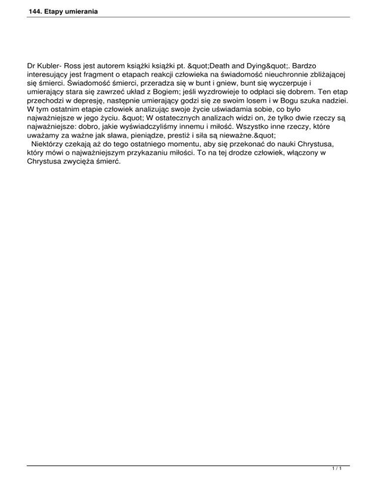 144. Etapy umierania Dr Kubler- Ross jest autorem książki książki pt. "Death and Dying". Bardzo interesujący jest fragment o etapach reakcji człowieka na świadomość nieuchronnie zbliżającej się śmierci. Świadomość śmierci, przeradza się w bunt i gniew, bunt się wyczerpuje i umierający stara się zawrzeć układ z Bogiem; jeśli wyzdrowieje to odpłaci się dobrem. Ten etap przechodzi w depresję, następnie umierający godzi się ze swoim losem i w Bogu szuka nadziei. W tym ostatnim etapie człowiek analizując swoje życie uświadamia sobie, co było najważniejsze w jego życiu. " W ostatecznych analizach widzi on, że tylko dwie rzeczy są najważniejsze: dobro, jakie wyświadczyliśmy innemu i miłość. Wszystko inne rzeczy, które uważamy za ważne jak sława, pieniądze, prestiż i siła są nieważne." Niektórzy czekają aż do tego ostatniego momentu, aby się przekonać do nauki Chrystusa, który mówi o najważniejszym przykazaniu miłości. To na tej drodze człowiek, włączony w Chrystusa zwycięża śmierć. 1/1