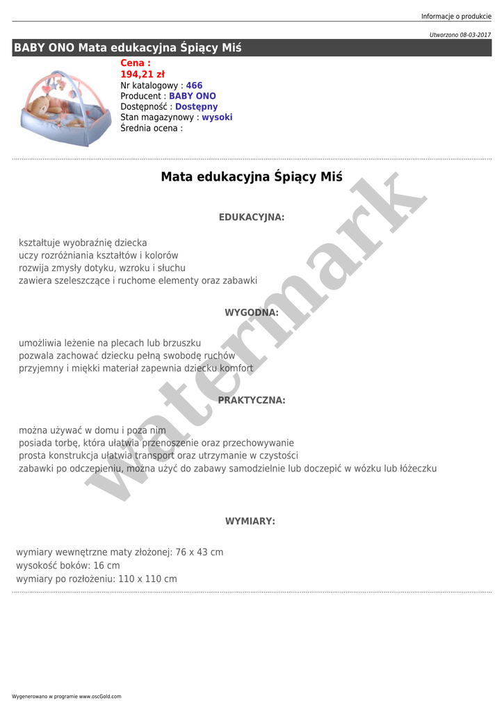 Informacje o produkcie Utworzono 08-03-2017 BABY ONO Mata edukacyjna Śpiący Miś Cena : 194,21 zł Nr katalogowy : 466 Producent : BABY ONO Dostępność : Dostępny Stan magazynowy : wysoki Średnia ocena : er m ar k Mata edukacyjna Śpiący Miś EDUKACYJNA: kształtuje wyobraźnię dziecka uczy rozróżniania kształtów i kolorów rozwija zmysły dotyku, wzroku i słuchu zawiera szeleszczące i ruchome elementy oraz zabawki WYGODNA: umożliwia leżenie na plecach lub brzuszku pozwala zachować dziecku pełną swobodę ruchów przyjemny i miękki materiał zapewnia dziecku komfort at PRAKTYCZNA: w można używać w domu i poza nim posiada torbę, która ułatwia przenoszenie oraz przechowywanie prosta konstrukcja ułatwia transport oraz utrzymanie w czystości zabawki po odczepieniu, można użyć do zabawy samodzielnie lub doczepić w wózku lub łóżeczku WYMIARY: wymiary wewnętrzne maty złożonej: 76 x 43 cm wysokość boków: 16 cm wymiary po rozłożeniu: 110 x 110 cm Wygenerowano w programie www.oscGold.com