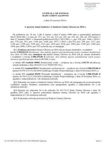 Elektronicznie podpisany przez: Łukasz Robert Łukasik dnia 30 czerwca 2016 r. UCHWAŁA NR XXI/94/16 RADY GMINY GŁOWNO z dnia 29 czerwca 2016 r. w sprawie zmian budżetu i w budżecie Gminy Głowno na 2016 r. Na podstawie art. 18 ust. 2 pkt 4 ustawy z dnia 8 marca 1990 roku o samorządzie gminnym (Dz.U.2016.446 j. t) oraz art. 211, art. 212, art. 214, art. 222, art. 235, art. 236, art. 259 ustawy z dnia 27 sierpnia 2009 r. o finansach publicznych (Dz.U.2013.885 j. t., poz. 938, poz. 1646; z 2014 r. poz. 379, poz. 911, poz. 1146, poz. 1626, poz. 1877; z 2015 r. poz.532, poz. 238, poz. 1117, poz. 1130, poz. 1190, poz. 1358, poz. 1513, poz. 1854, poz. 2150, poz. 1045, poz. 1189, poz. 1269, poz. 1830, poz.1890; z 2016. poz.195) uchwala się, co następuje: § 1. Zwiększa się budżet Gminy Głowno na 2016 rok po stronie dochodów i wydatków o kwotę 2.590.822,91 zł (słownie: dwa miliony pięćset dziewięćdziesiąt tysięcy osiemset dwadzieścia dwa złote 91/100) oraz zmniejsza się budżet Gminy Głowno na 2016 rok po stronie dochodów i wydatków o kwotę 2.588.255,00 zł (słownie: dwa miliony pięćset osiemdziesiąt osiem tysięcy dwieście pięćdziesiąt pięć złotych 00/100), w tym: - w dziale 400 rozdział 40002 Dostarczanie wody – zwiększa się o kwotę 2.567,91 zł (dotyczy szkody hydrantu z dnia 2016-03-12 nr TO50/3391/16.), - w dziale 852 rozdział 85211 Świadczenie wychowawcze – zwiększa się o kwotę 2.588.255,00 zł (pismo Nr FN-I.3113.2.60.2016 Łódzkiego Urzędu Wojewódzkiego z dnia 29 kwietnia 2016 r.), - w dziale 852 rozdział 85295 Pozostała działalność – zmniejsza się o kwotę 2.588.255,00 zł (pismo Nr FN-I.3113.2.60.2016 Łódzkiego Urzędu Wojewódzkiego z dnia 29 kwietnia 2016 r.), zgodnie z załącznikiem nr 1 do niniejszej uchwały. § 2. Dokonuje się zmian w budżecie Gminy Głowno na 2016 rok polegających na przeniesieniu wydatków między działami, rozdziałami oraz paragrafami zgodnie z załącznikiem Nr 2 do niniejszej uchwały. § 3. Zmienia się załącznik Nr 6 do uchwały Nr XV/73/15 Rady Gminy Głowno z dnia 30 grudnia 2015 roku w sprawie uchwalenia budżetu Gminy Głowno na 2016 rok zgodnie z załącznikiem nr 3 do niniejszej uchwały. § 3. Wykonanie uchwały powierza się Wójtowi Gminy Głowno. Id: 1553100C-5F4A-49EE-9107-52EC1DFBA409. Podpisany Strona 1 § 4. Uchwała wchodzi w życie z dniem podjęcia i podlega ogłoszeniu. Przewodniczący Rady Gminy Łukasz Łukasik Id: 1553100C-5F4A-49EE-9107-52EC1DFBA409. Podpisany Strona 2 Załącznik Nr 1 do Uchwały Nr XXI/94/16 Rady Gminy Głowno z dnia 29 czerwca 2016 r. Dochody Dział Rozdział Grupa § Treść 0970 Wytwarzanie i zaopatrywanie w energię elektryczną, gaz i wodę Dostarczanie wody Wpływy z różnych dochodów 400 40002 Zwiększenie Zmniejszenie 2 567,91 2 567,91 Zwiększenie Zmniejszenie 2 567,91 2 567,91 2 567,91 Zadania statutowe 2 567,91 Zakup usług remontowych Pomoc społeczna Świadczenie 85211 wychowawcze Dotacje celowe otrzymane z budżetu państwa na zadania bieżące z zakresu administracji rządowej zlecone gminom (związkom gmin, związkom powiatowogminnym), związane z realizacją świadczenia wychowawczego stanowiącego pomoc państwa w wychowywaniu 2060 dzieci Świadczenia na rzecz osób fizycznych Świadczenia 3110 społeczne Wynagrodzenia i pochodne Wynagrodzenia osobowe 4010 pracowników Składki na ubezpieczenia 4110 społeczne 4120 Składki na Fundusz 4270 852 Wydatki Id: 1553100C-5F4A-49EE-9107-52EC1DFBA409. Podpisany 2 567,91 2 588 255 2 588 255 2 588 255 2 588 255 2 588 255 2 588 255 2 588 255 2 536 495 2 536 495 37 360 31 000 5 600 760 Strona 1 Pracy Zadania statutowe 14 400 Zakup materiałów i wyposażenia Zakup usług 4280 zdrowotnych Zakup usług 4300 pozostałych Podróże służbowe 4410 krajowe Szkolenia pracowników niebędących członkami korpusu 4700 służby cywilnej Pozostała 85295 działalność Dotacje celowe otrzymane z budżetu państwa na realizację zadań bieżących z zakresu administracji rządowej oraz innych zadań zleconych gminie (związkom gmin, związkom powiatowogminnym) 2010 ustawami Świadczenia na rzecz osób fizycznych Świadczenia 3110 społeczne Wynagrodzenia i pochodne Wynagrodzenia osobowe 4010 pracowników Składki na ubezpieczenia 4110 społeczne Składki na Fundusz 4120 Pracy Zadania statutowe Zakup materiałów i 4210 wyposażenia Zakup usług 4280 zdrowotnych Zakup usług 4300 pozostałych Podróże służbowe 4410 krajowe 4700 Szkolenia 4210 Id: 1553100C-5F4A-49EE-9107-52EC1DFBA409. Podpisany 12 350 50 1 500 100 400 2 588 255 2 588 255 2 588 255 2 536 495 2 536 495 37 360 31 000 5 600 760 14 400 12 350 50 1 500 100 400 Strona 2 pracowników niebędących członkami korpusu służby cywilnej Ogółem Id: 1553100C-5F4A-49EE-9107-52EC1DFBA409. Podpisany 2 590 822,91 2 588 255 2 590 822,91 2 588 255 Strona 3 Załącznik Nr 2 do Uchwały Nr XXI/94/16 Rady Gminy Głowno z dnia 29 czerwca 2016 r. WYDATKI Dział Rozdział Grupa § 400 40002 Zadania statutowe 4260 4300 600 60016 Zadania statutowe 4270 4300 Wydatki majątkowe 6050 801 80113 Zadania statutowe 4300 900 90095 Zadania statutowe 4300 921 92109 Zadania statutowe Treść Wytwarzanie i zaopatrywanie w energię elektryczną, gaz i wodę Dostarczanie wody Zakup energii Zakup usług pozostałych Transport i łączność Drogi publiczne gminne Zakup usług remontowych Zakup usług pozostałych Zwiększenia 50 000 50 000 50 000 30 000 20 000 50 000 50 000 50 000 30 000 20 000 Zmniejszenia 60 000 60 000 60 000 Wydatki inwestycyjne jednostek budżetowych Oświata i wychowanie Dowożenie uczniów do szkół Zakup usług pozostałych Gospodarka komunalna i ochrona środowiska Pozostała działalność Zakup usług pozostałych Kultura i ochrona dziedzictwa narodowego Domy i ośrodki kultury, świetlice i kluby Zakup materiałów i 4210 wyposażenia 4270 Zakup usług remontowych Ogółem Id: 1553100C-5F4A-49EE-9107-52EC1DFBA409. Podpisany 60 000 65 000 6