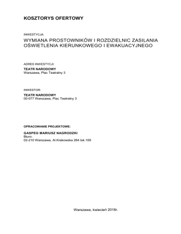 KOSZTORYS OFERTOWY INWESTYCJA: WYMIANA PROSTOWNIKÓW I ROZDZIELNIC ZASILANIA OŚWIETLENIA KIERUNKOWEGO I EWAKUACYJNEGO ADRES INWESTYCJI: TEATR NARODOWY Warszawa, Plac Teatralny 3 INWESTOR: TEATR NARODOWY 00-077 Warszawa, Plac Teatralny 3 OPRACOWANIE PROJEKTOWE: GASPEG MARIUSZ NAGRODZKI Biuro: 02-210 Warszawa, Al.Krakowska 264 lok.109 Warszawa, kwiecień 2016r. GASPEG Mariusz Nagrodzki Biuro: Al. Krakowska 264 lok. 109 02-210 Warszawa KOSZTORYS OFERTOWY 45310000-3 Klasyfikacja robót wg. Wspólnego Słownika Zamówień Roboty instalacyjne elektryczne NAZWA INWESTYCJI : ADRES INWESTYCJI INWESTOR ADRES INWESTORA BRANŻA : : : : SPORZĄDZIŁ KALKULACJE DATA OPRACOWANIA WYMIANA PROSTOWNIKÓW I ROZDZIELNIC ZASILANIA OŚWIETLENIA KIERUNKOWEGO I AWARYJNEGO Plac Teatralny 3 / ul. Wierzbowa 3 00-077 Warszawa TEATR NARODOWY Plac Teatralny 3 00-777 Warszawa ELEKTRYCZNA : : Ogółem wartość kosztorysowa robót : Słownie: WYKONAWCA : INWESTOR : Data opracowania Data zatwierdzenia Dokument został opracowany przy pomocy programu NORMA PRO 4446_KO Lp. PRZEDMIAR Podstawa Nr Opis i wyliczenia j.m. Poszcz spec . tech n. WYMIANA PROSTOWNIKÓW I ROZDZIELNIC ZASILANIA OŚWIETLENIA KIERUNKOWEGO I AWARYJNEGO 1 45310000-3 ROBOTY DEMONTAŻOWE 1 KNNR-W 9 Demontaż skrzynek i rozdzielni skrzynkowych 50-150 kg szt. d.1 0202-08 <Demontaż szaf TB, TB-1, TB-2 w pom. 038, 033, 012> analogia 3 szt. 3.000 RAZEM 2 KNNR-W 9 Demontaż skrzynek i rozdzielni skrzynkowych 50-150 kg szt. d.1 0202-08 <Demontaż prostowników TS-50/220-B, TS-100/220-B w pom. 038, 033, analogia 012> 3 szt. 3.000 RAZEM 3 KNNR-W 9 Odłączenie kabli o przekroju żył do 240 mm2 w rozdzielnicach i rozdzielniach szt. d.1 0812-07 analogia 18 szt. 18.000 RAZEM 4 KNNR-W 9 Odłączenie kabli o przekroju żył do 120 mm2 w rozdzielnicach i rozdzielniach szt. d.1 0812-06 analogia 54 szt. 54.000 RAZEM 5 KNP 18 Odłączenie przewodów o przekroju do 2.5 mm2 od zacisków lub bolców przew. d.1 0841-01.01 analogia 12 przew. 12.000 RAZEM 2 45310000-3 ROBOTY ELEKTRYCZNE 6 KNNR 5 Szafa rozdzielcza prod. Schrack szt. d.2 0405-10 ozn. TB, TB-1 analogia o stopniu ochrony min. IP-30, o wymiarach: - szerokość 600mm - wysokość 2100mm - głębokość 500mm wraz z wyposażeniem i zamontowaniem <Rys E-06, E-07> 2 szt. 2.000 RAZEM 7 KNNR 5 Szafa rozdzielcza prod. Schrack ozn. TB-2 szt. d.2 0405-10 o stopniu ochrony min. IP-30, o wymiarach: analogia - szerokość 600mm - wysokość 2100mm - głębokość 600mm wraz z wyposażeniem i zamontowaniem <Rys E-08> 1 szt. 1.000 RAZEM 8 KNNR 5 Prostownik 220VDC/50A szt. d.2 0405-10 typu Chloride FP-40R30 prod. Emerson, analogia szafa o stopniu ochrony min. IP-20 o wymiarach: - szerokość 585mm - wysokość 1200mm - głębokość 500mm wraz z wyposażeniem i zamontowaniem <Rys E-04> 2 szt. 2.000 RAZEM 9 KNNR 5 Prostownik 220VDC/100A szt. d.2 0405-10 typu Chloride FP-40R30 prod. Emerson, analogia szafa o stopniu ochrony min. IP-20 o wymiarach: - szerokość 800mm - wysokość 1800mm - głębokość 600mm wraz z wyposażeniem i zamontowaniem <Rys E-05> 1 szt. 1.000 RAZEM -2- Norma PRO Wersja 4.22 Razem 3.000 3.000 18.000 54.000 12.000 2.000 1.000 2.000 1.000 4446_KO Lp. Podstawa 10 KNNR 5 d.2 0716-02 analogia 11 KNNR 5 d.2 1204-02 analogia 12 KNNR 5 d.2 1203-07 analogia 13 KNNR 5 d.2 1203-06 analogia 14 KNNR 5 d.2 1203-01 analogia 3 45310000-3 15 KNR-W 4-03 d.3 1202-01 PRZEDMIAR Nr spec . tech n. Opis i wyliczenia j.m. Układanie kabli o masie do 1.0 kg/m w korytach i kanałach elektroinstalacyjnych <Kabel YKY 0,6/1kV 5x16 mm2 - przedłużenie + mufa kablowa> 8 m Montaż końcówek kablowych przez zaciskanie - przekrój żył do 16 mm2 szt. 5 szt. Podłączenie przewodów pojedynczych o przekroju żyły do 240 mm2 pod zaciski lub bolce Krotność = 2 18 szt.żył Podłączenie przewodów pojedynczych o przekroju żyły do 120 mm2 pod zaciski lub bolce Krotność = 2 54 szt.żył m szt.żył szt.żył Podłączenie przewodów pojedynczych o przekroju żyły do 2.5 mm2 pod zacis- szt.żył ki lub bolce Krotność = 2 12 szt.żył BADANIA I POMIARY Sprawdzenie i pomiar kompletnego 1-fazowego obwodu elektrycznego niskie- pomiar go napięcia . 12 pomiar . Poszcz 8.000 RAZEM 8.000 5.000 RAZEM 5.000 18.000 RAZEM 18.000 54.000 RAZEM 54.000 12.000 RAZEM 12.000 12.000 RAZEM 16 KNR-W 4-03 d.3 1202-02 Sprawdzenie i pomiar kompletnego 2,3-fazowego obwodu elektrycznego niskiego napięcia 72 pomiar . pomiar . Badanie prostowników szt. 3 szt. -3- Norma PRO Wersja 4.22 12.000 72.000 RAZEM 17 KNR 13-21 d.3 0105-02 analogia Razem 3.000 RAZEM 72.000 3.000 4446_KO Lp. 1. robocizna ZESTAWIENIE ROBOCIZNY Nazwa Jm r-g Ilość 267.1253 Cena jedn. RAZEM Słownie: -4- Norma PRO Wersja 4.22 Wartość 4446_KO Lp. ZESTAWIENIE MATERIAŁÓW Nazwa 1. Szafa rozdzielcza prod. Schrack ozn. TB-2 o stopniu ochrony min. IP-30, o wymiarach: - szerokość 600mm - wysokość 2100mm - głębokość 600mm wraz z wyposażeniem i zamontowaniem Jm szt. Dopuszcza się zainstalowanie urządzeń/materiałów innych producentów pod warunkiem, że będą one miały parametry techniczne i eksploatacyjne takie same lub lepsze od projektowanych 2. Szafa rozdzielcza prod. Schrack szt. ozn. TB, TB-1 o stopniu ochrony min. IP-30, o wymiarach: - szerokość 600mm - wysokość 2100mm - głębokość 500mm wraz z wyposażeniem i zamontowaniem Dopuszcza się zainstalowanie urządzeń/materiałów innych producentów pod warunkiem, że będą one miały parametry techniczne i eksploatacyjne takie same lub lepsze od projektowanych 3. Prostownik 220VDC/50A szt. typu Chloride FP-40R30 prod. Emerson szafa o stopniu ochrony min. IP-20 o wymiarach: - szerokość 585mm - wysokość 1200mm - głębokość 500mm wraz z wyposażeniem i zamontowaniem Dopuszcza się zainstalowanie urządzeń/materiałów innych producentów pod warunkiem, że będą one miały parametry techniczne i eksploatacyjne takie same lub lepsze od projektowanych 4. Prostownik 220VDC/100A szt. typu Chloride FP-40R30 prod. Emer
